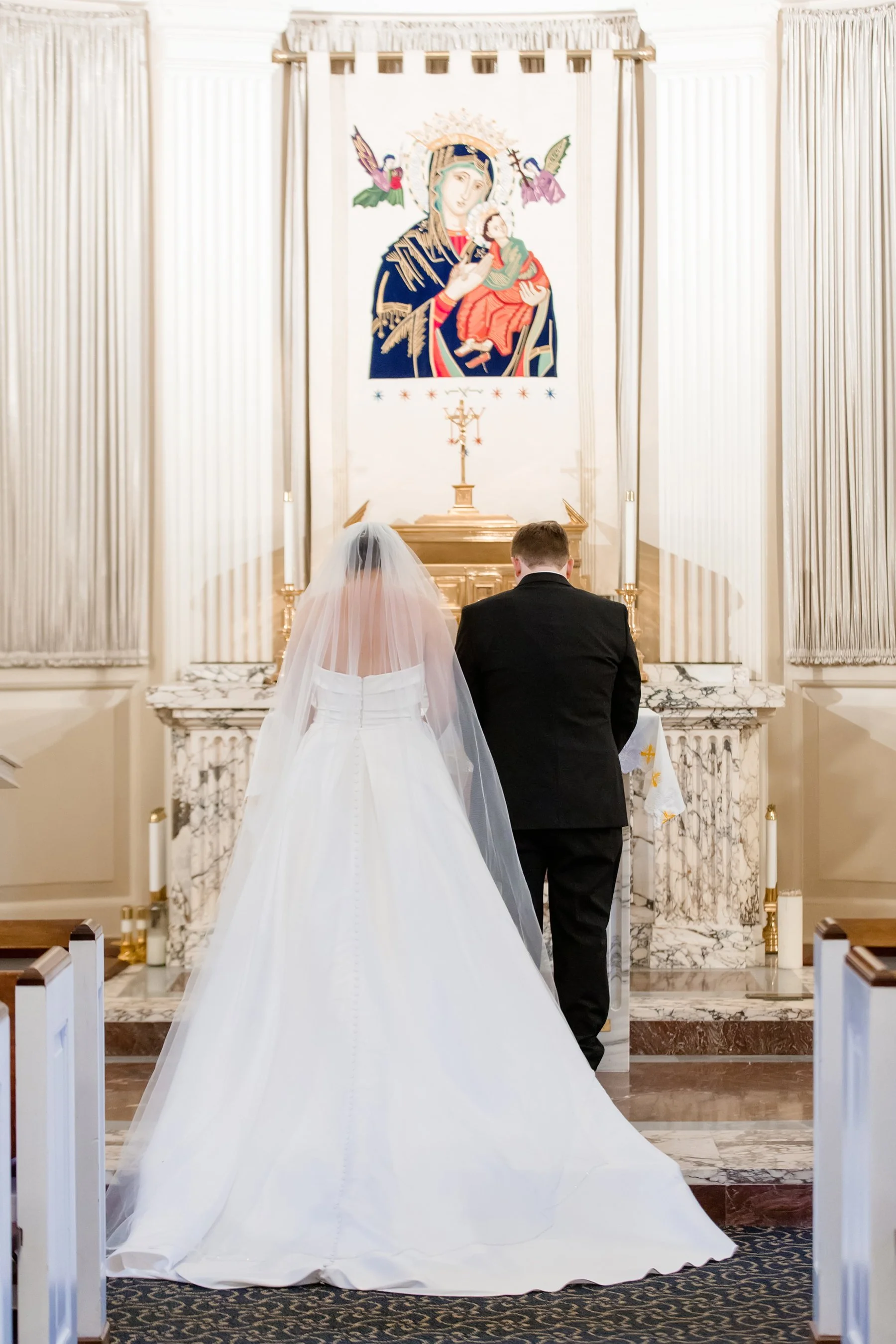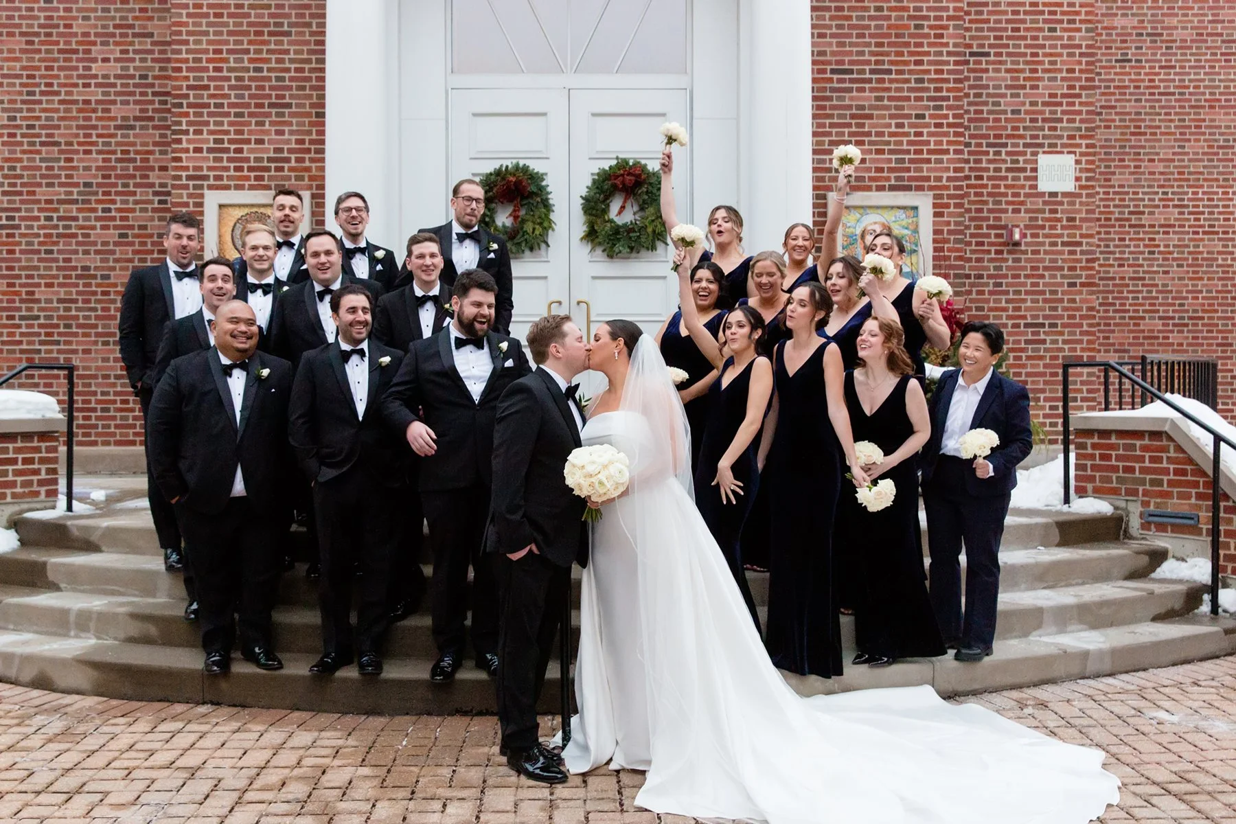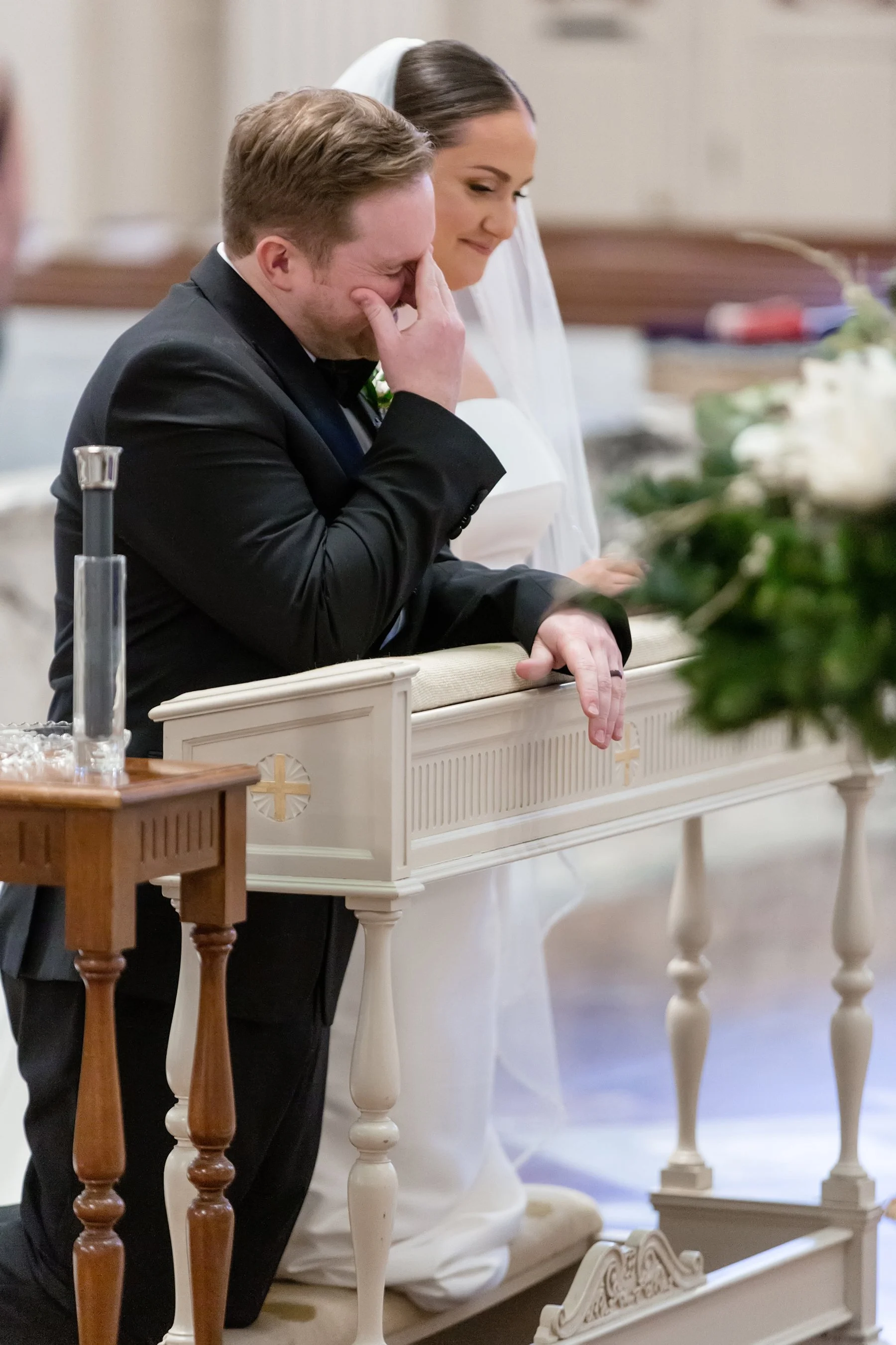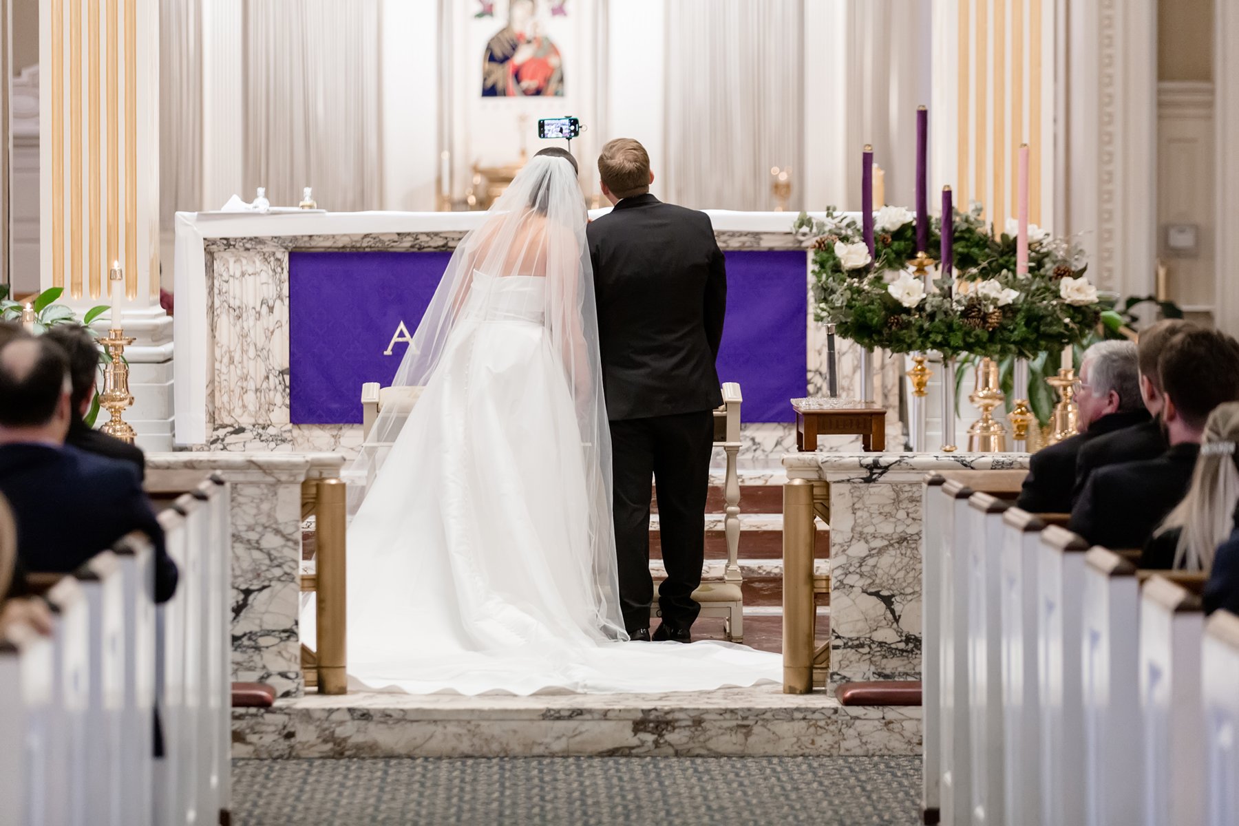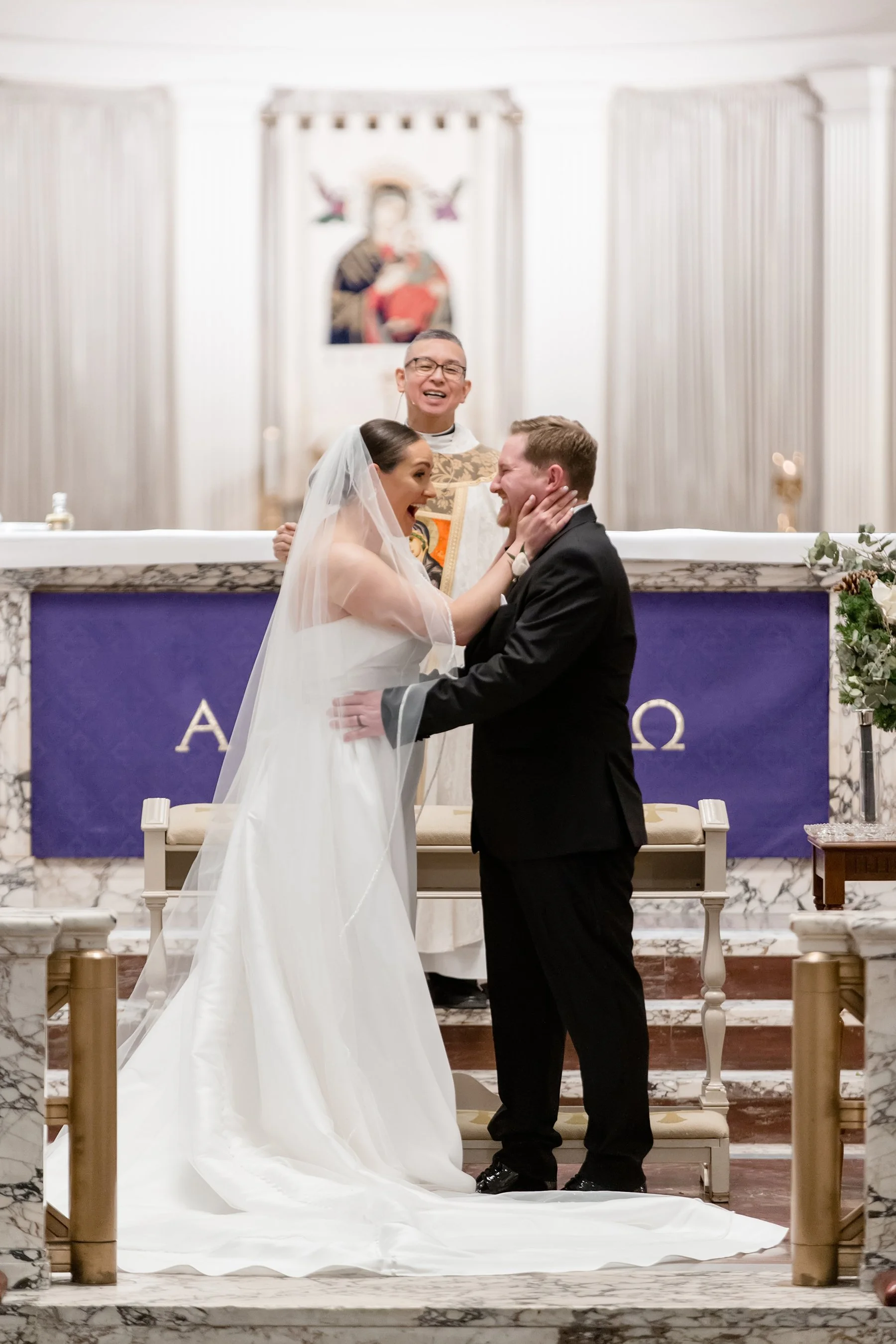 I first got to know Nicole and Ben at their engagement session last Spring, we met up at Graeter’s Ice Cream in Northbrook and had SO much fun together! Nicole and Ben are just the most joyful, loving and happy people, being in their presence is like a breath of fresh air! We were all SO excited to celebrate their wedding with them this December, it was a cold and snowy day and everything just felt perfect. We arrived at the Lincolnshire Marriott where Nicole and her besties were getting ready, everyone looked amazing thanks to the talented team at Rare Bird Beauties. Once Nicole was ready we arranged a series of “first look” moments inside at the hotel, she saw her Dad, future in-laws and bridesmaids for the first time in her full bridal look, each moment was sweeter than the one before it! It was just so special to be a part of this day, Nicole is clearly SO loved and it meant a lot to us to photograph each of these important people in her life celebrating her and sharing in her joy on her wedding day. Nicole was in high-spirits and said she was very much wanting to do pictures outside, even in her gorgeous strapless gown from Martellen’s. We took Ben outside first and then let the two of them have their first-look moment while we stood in the snow and captured the sweetness from a distance. Nicole and Ben chose to share private vows and we felt so honored to be present while they expressed their love for one another. Soon their wedding party came outside as well to join us for a few quick (and cold!) photos before we all loaded up to head to Our Lady of Perpetual Help for the ceremony.