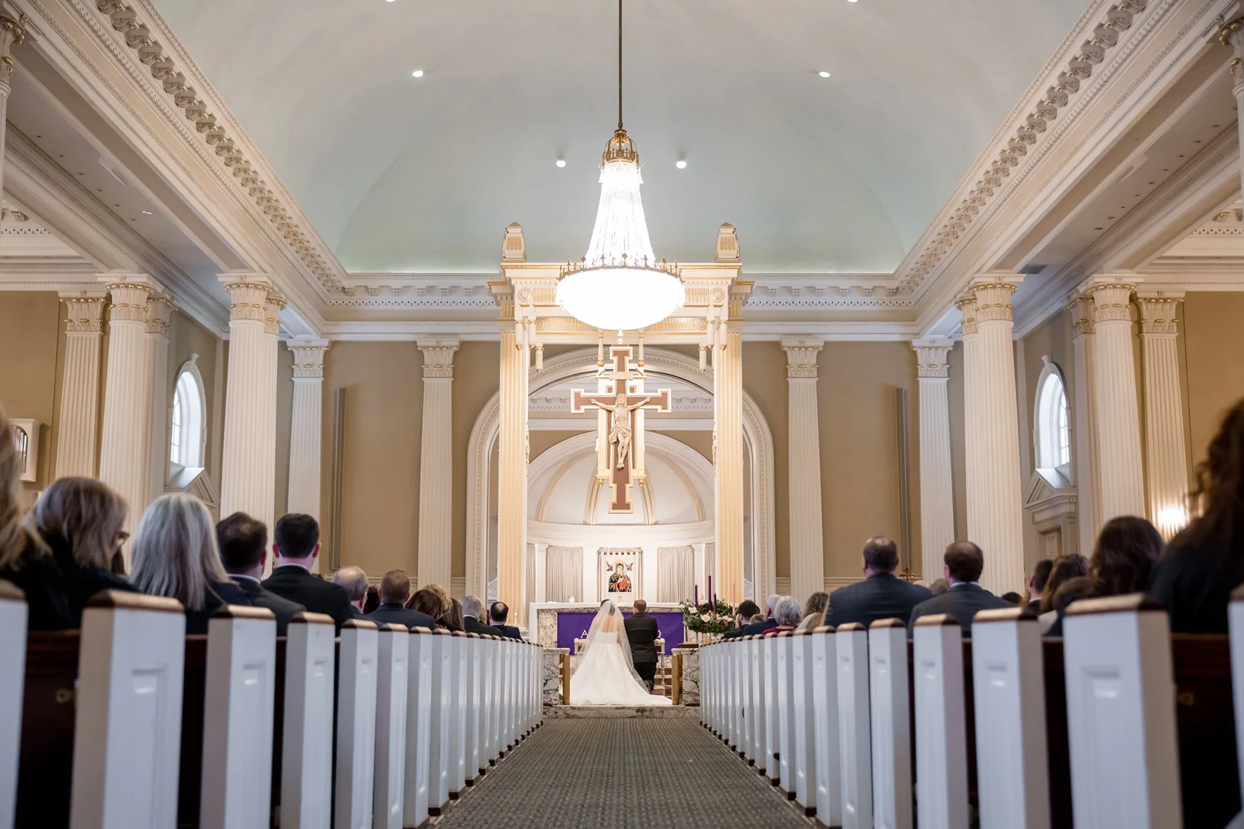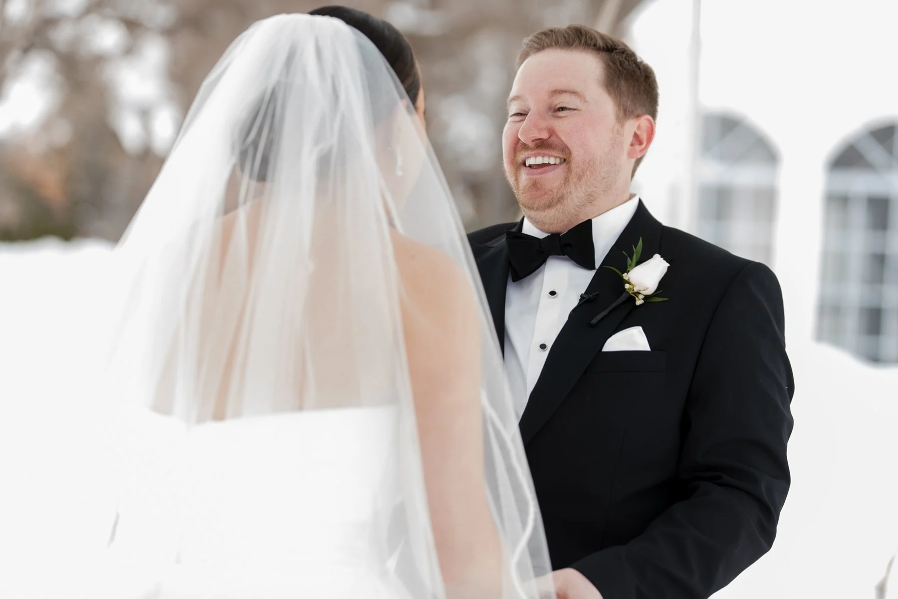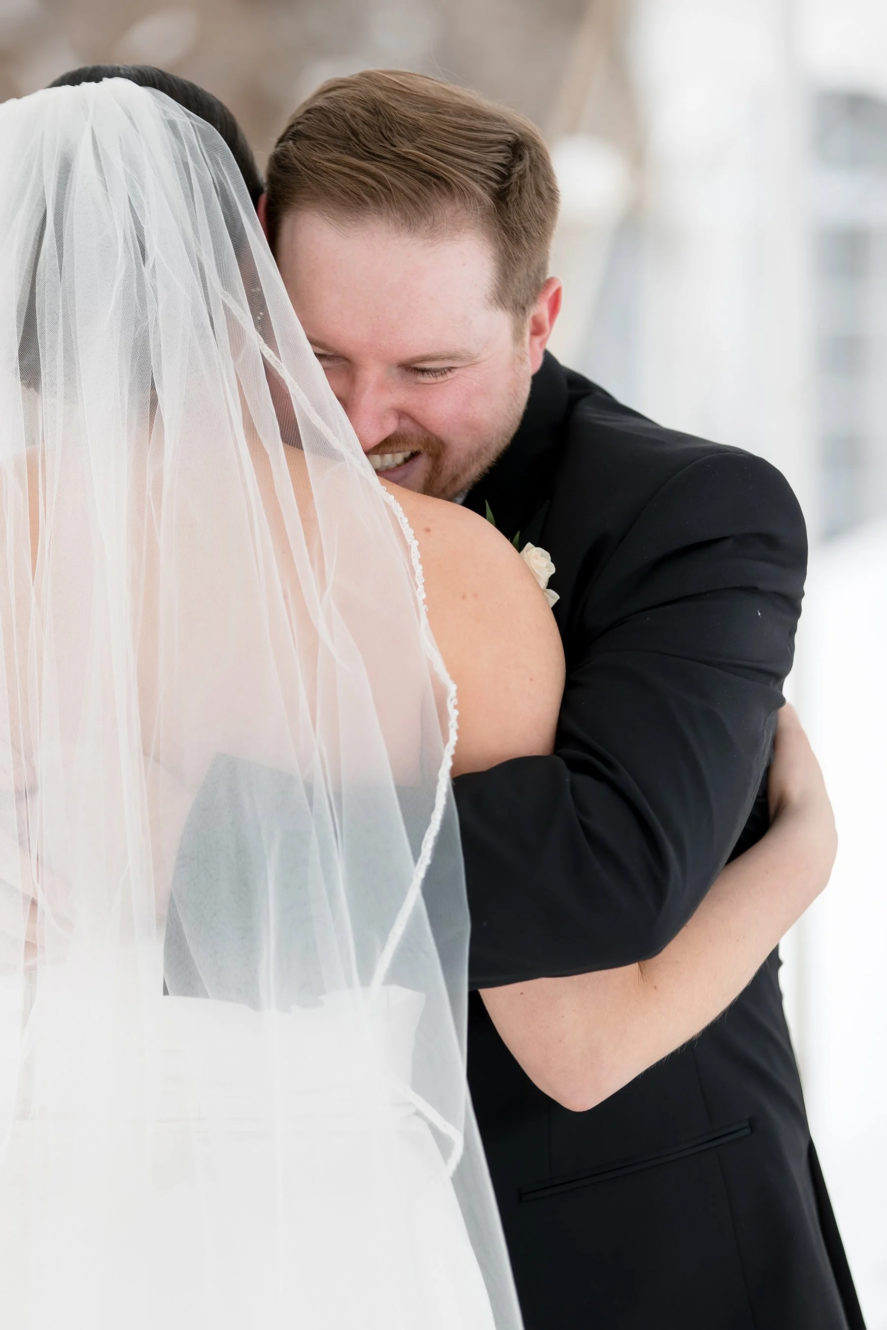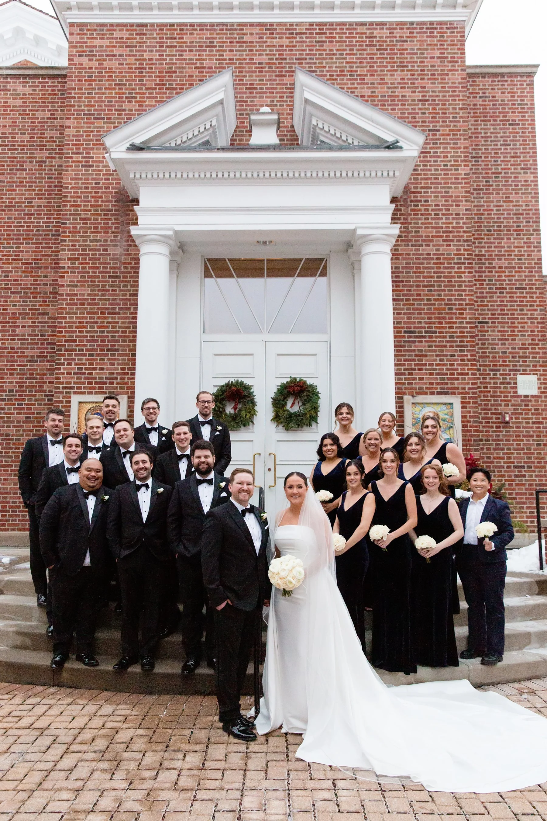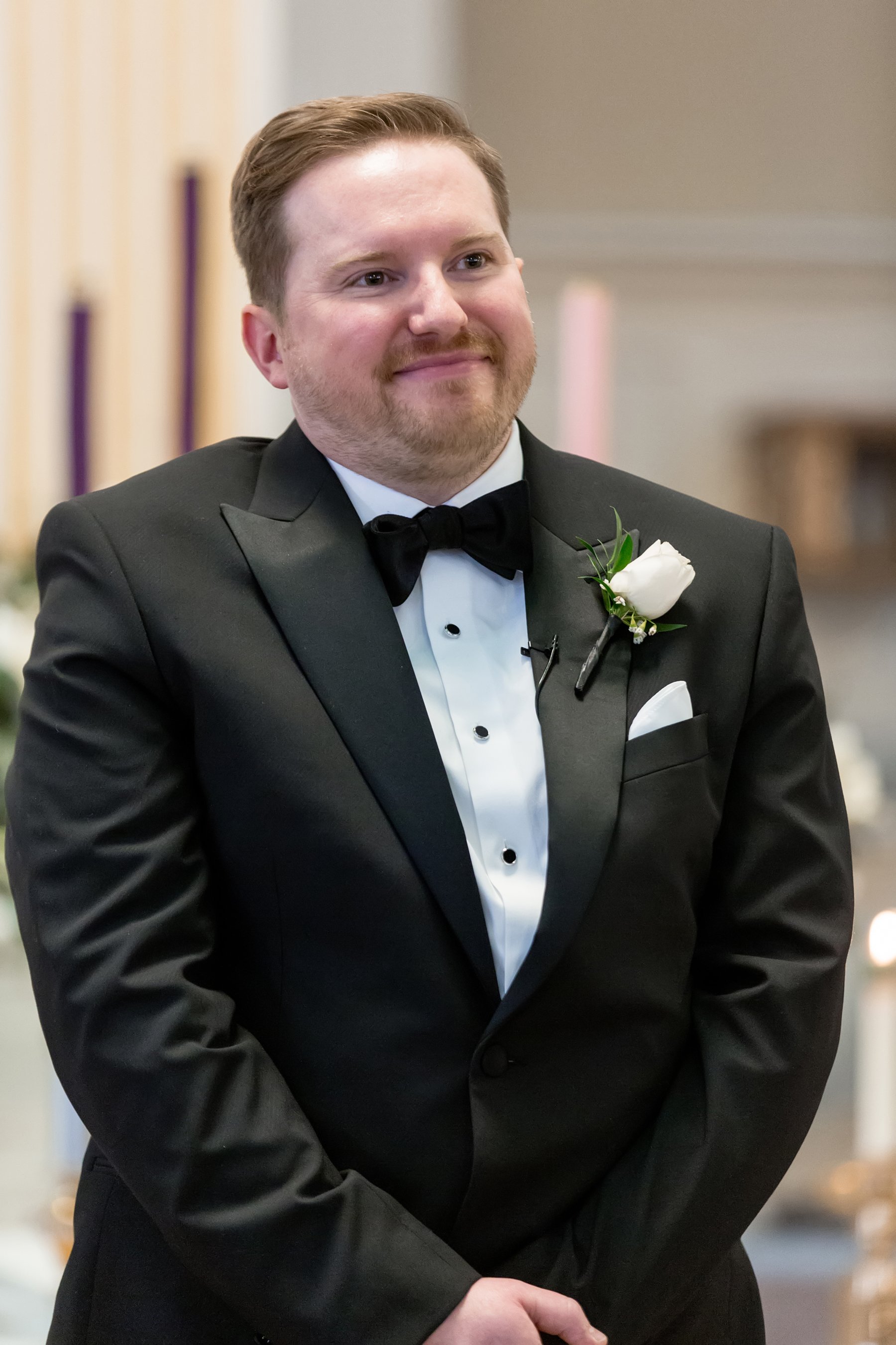 I first got to know Nicole and Ben at their engagement session last Spring, we met up at Graeter’s Ice Cream in Northbrook and had SO much fun together! Nicole and Ben are just the most joyful, loving and happy people, being in their presence is like a breath of fresh air! We were all SO excited to celebrate their wedding with them this December, it was a cold and snowy day and everything just felt perfect. We arrived at the Lincolnshire Marriott where Nicole and her besties were getting ready, everyone looked amazing thanks to the talented team at Rare Bird Beauties. Once Nicole was ready we arranged a series of “first look” moments inside at the hotel, she saw her Dad, future in-laws and bridesmaids for the first time in her full bridal look, each moment was sweeter than the one before it! It was just so special to be a part of this day, Nicole is clearly SO loved and it meant a lot to us to photograph each of these important people in her life celebrating her and sharing in her joy on her wedding day. Nicole was in high-spirits and said she was very much wanting to do pictures outside, even in her gorgeous strapless gown from Martellen’s. We took Ben outside first and then let the two of them have their first-look moment while we stood in the snow and captured the sweetness from a distance. Nicole and Ben chose to share private vows and we felt so honored to be present while they expressed their love for one another. Soon their wedding party came outside as well to join us for a few quick (and cold!) photos before we all loaded up to head to Our Lady of Perpetual Help for the ceremony.