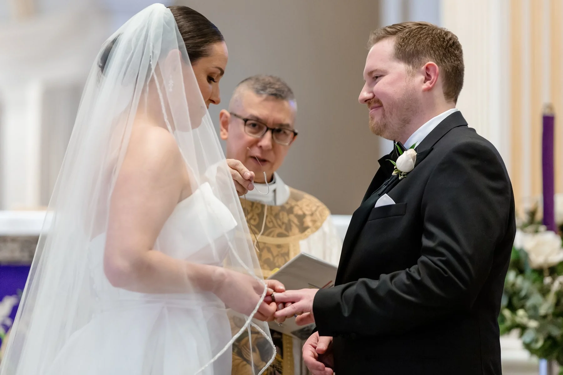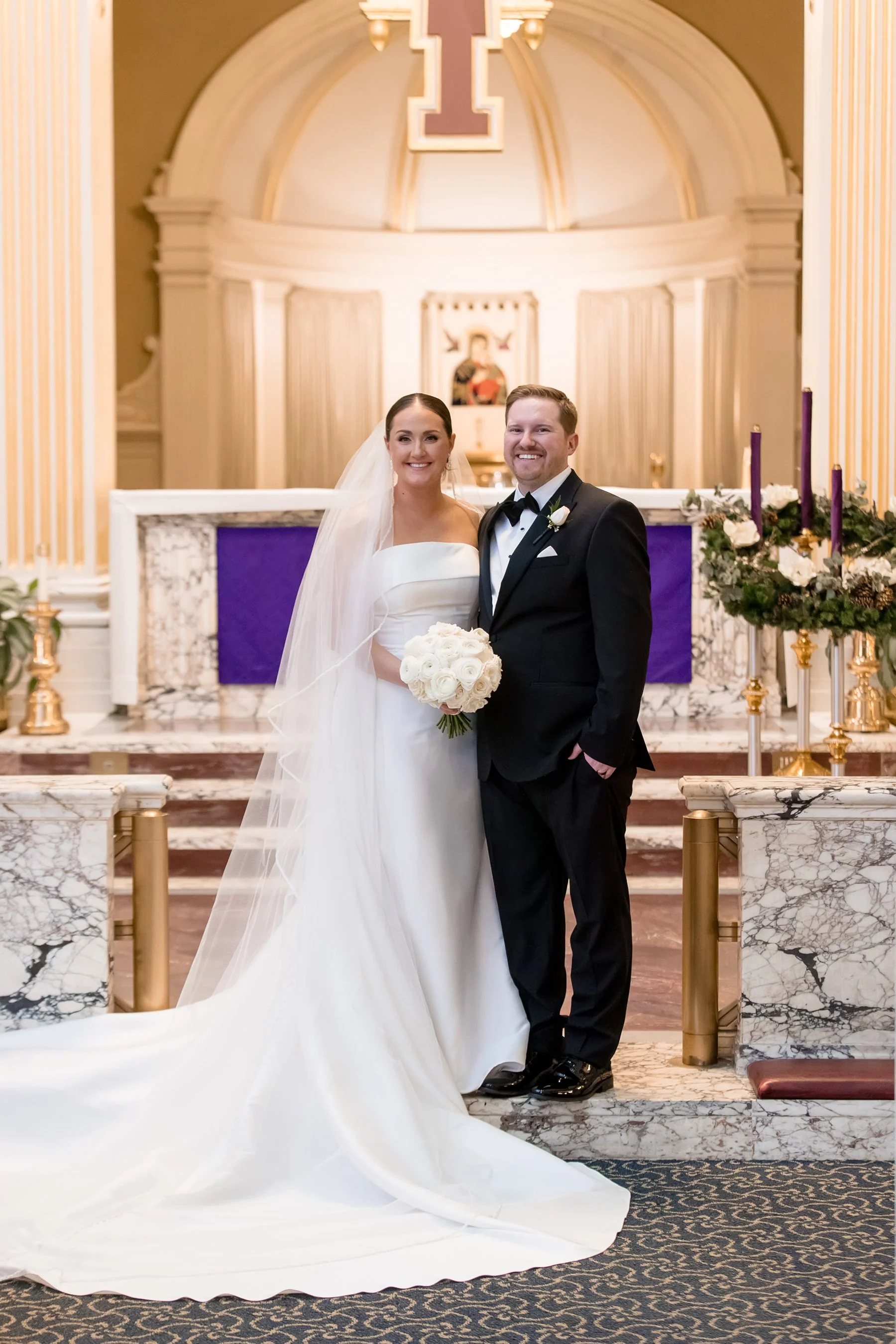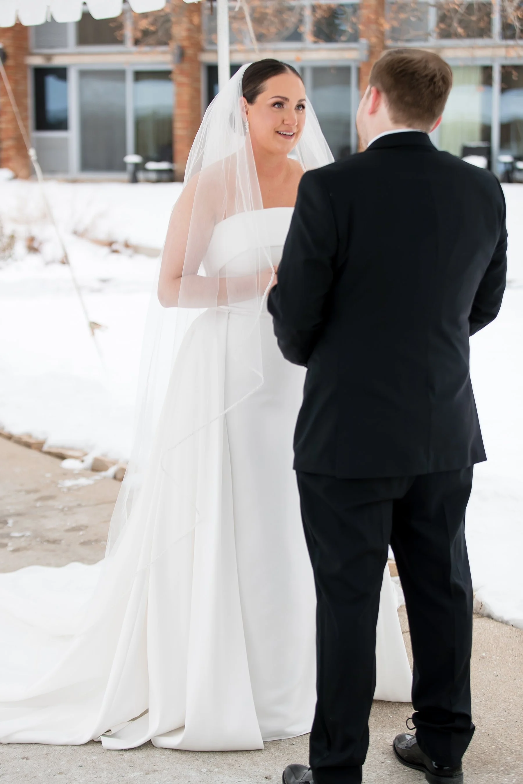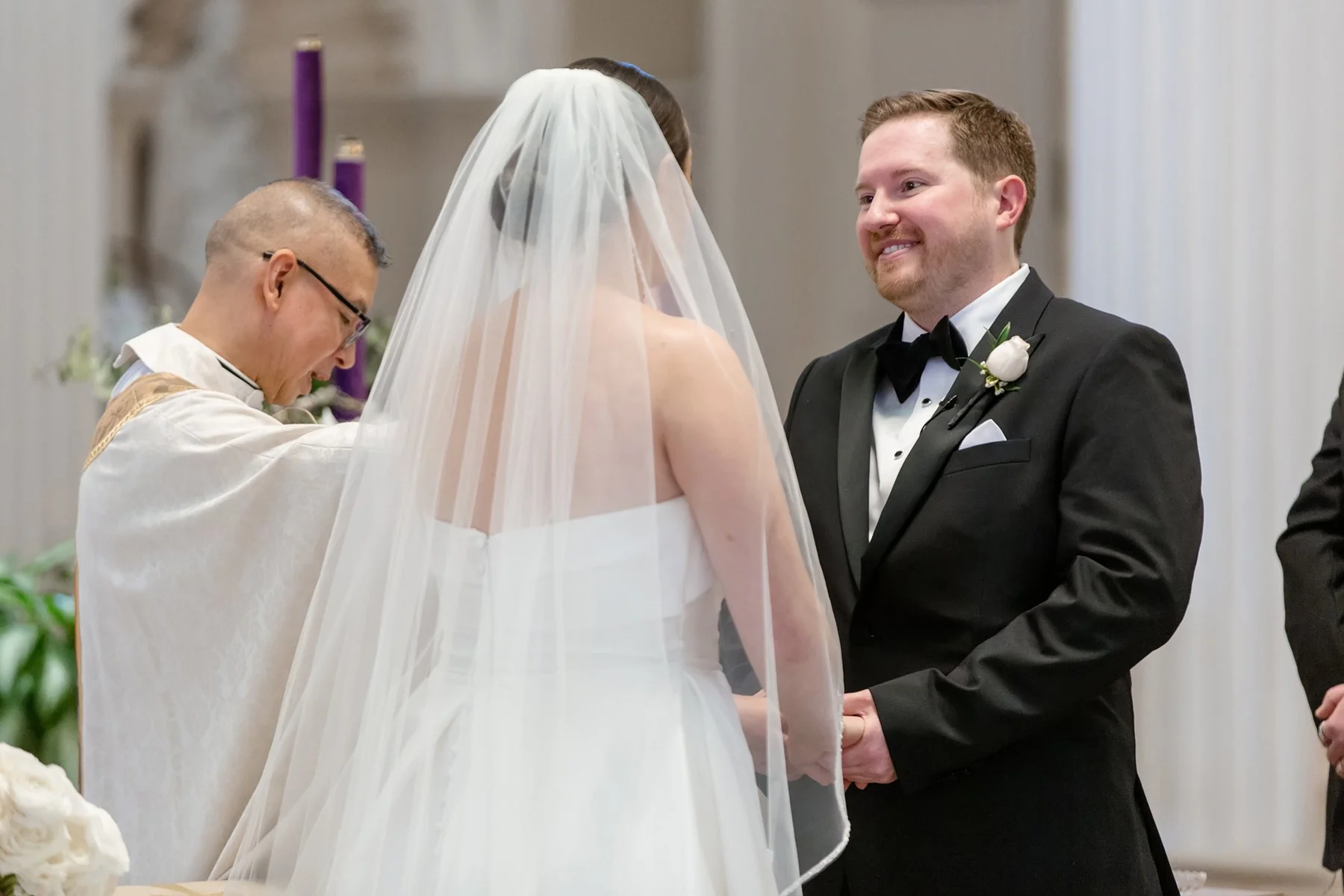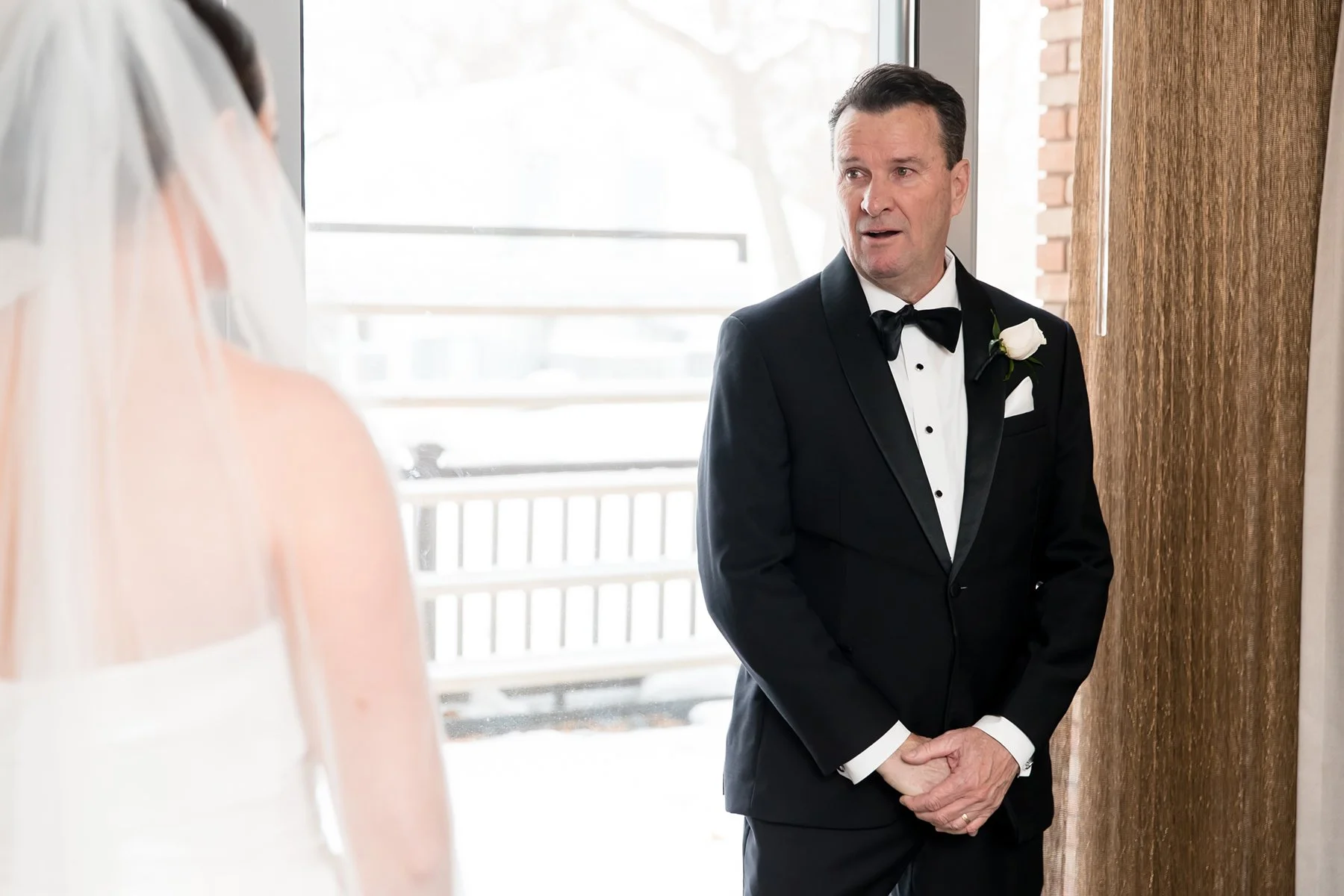 I first got to know Nicole and Ben at their engagement session last Spring, we met up at Graeter’s Ice Cream in Northbrook and had SO much fun together! Nicole and Ben are just the most joyful, loving and happy people, being in their presence is like a breath of fresh air! We were all SO excited to celebrate their wedding with them this December, it was a cold and snowy day and everything just felt perfect. We arrived at the Lincolnshire Marriott where Nicole and her besties were getting ready, everyone looked amazing thanks to the talented team at Rare Bird Beauties. Once Nicole was ready we arranged a series of “first look” moments inside at the hotel, she saw her Dad, future in-laws and bridesmaids for the first time in her full bridal look, each moment was sweeter than the one before it! It was just so special to be a part of this day, Nicole is clearly SO loved and it meant a lot to us to photograph each of these important people in her life celebrating her and sharing in her joy on her wedding day. Nicole was in high-spirits and said she was very much wanting to do pictures outside, even in her gorgeous strapless gown from Martellen’s. We took Ben outside first and then let the two of them have their first-look moment while we stood in the snow and captured the sweetness from a distance. Nicole and Ben chose to share private vows and we felt so honored to be present while they expressed their love for one another. Soon their wedding party came outside as well to join us for a few quick (and cold!) photos before we all loaded up to head to Our Lady of Perpetual Help for the ceremony.