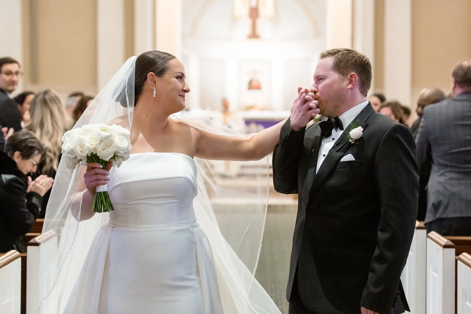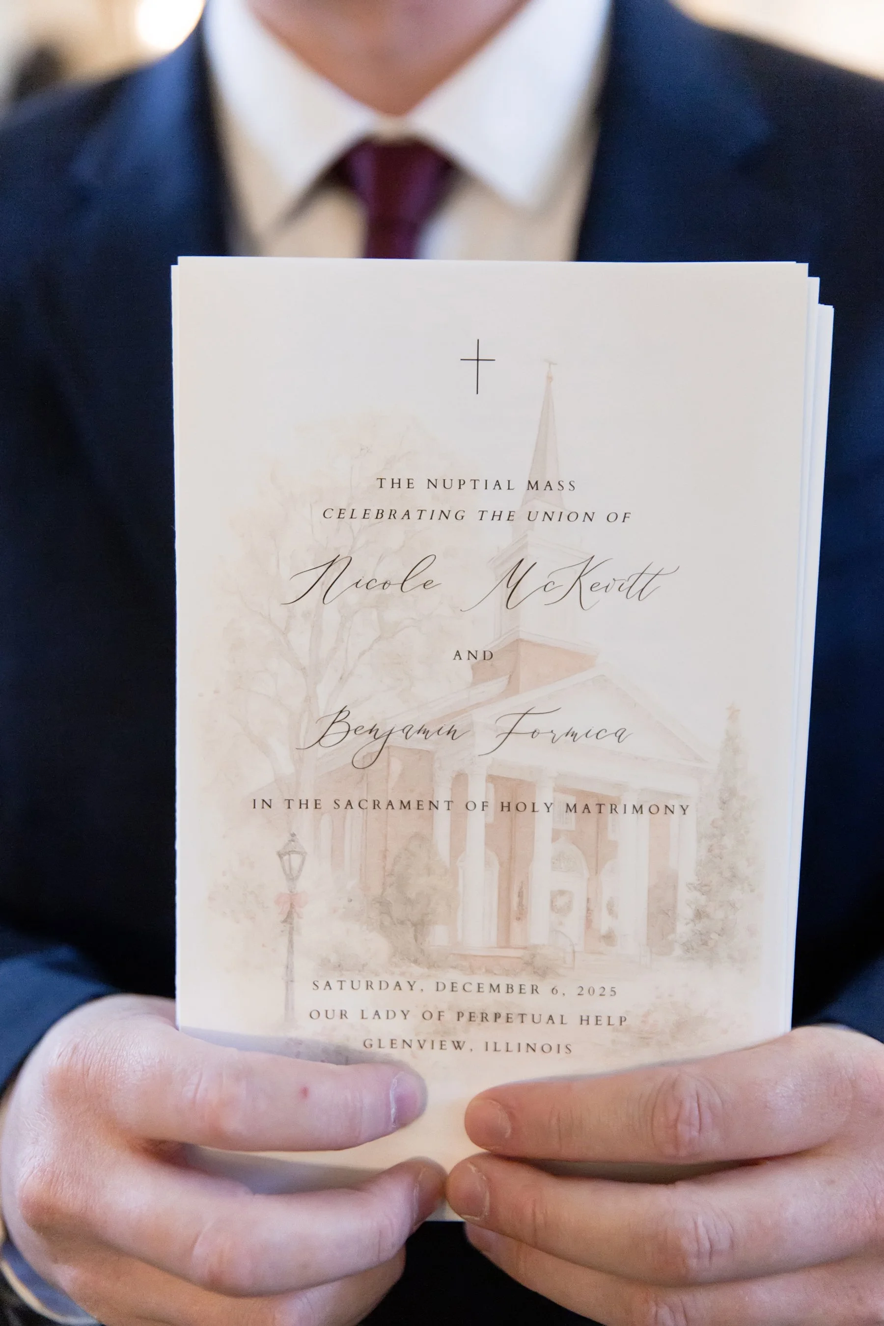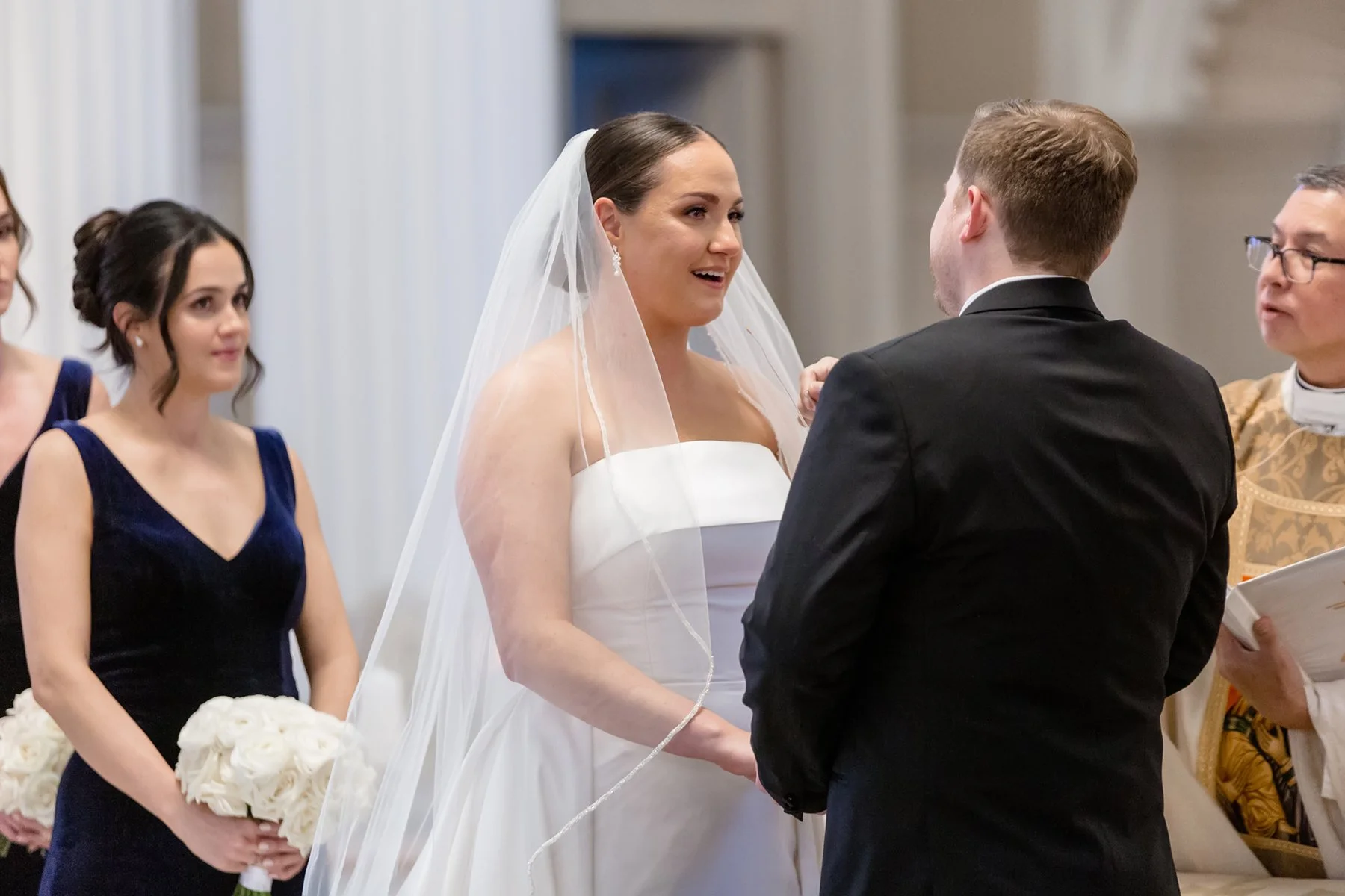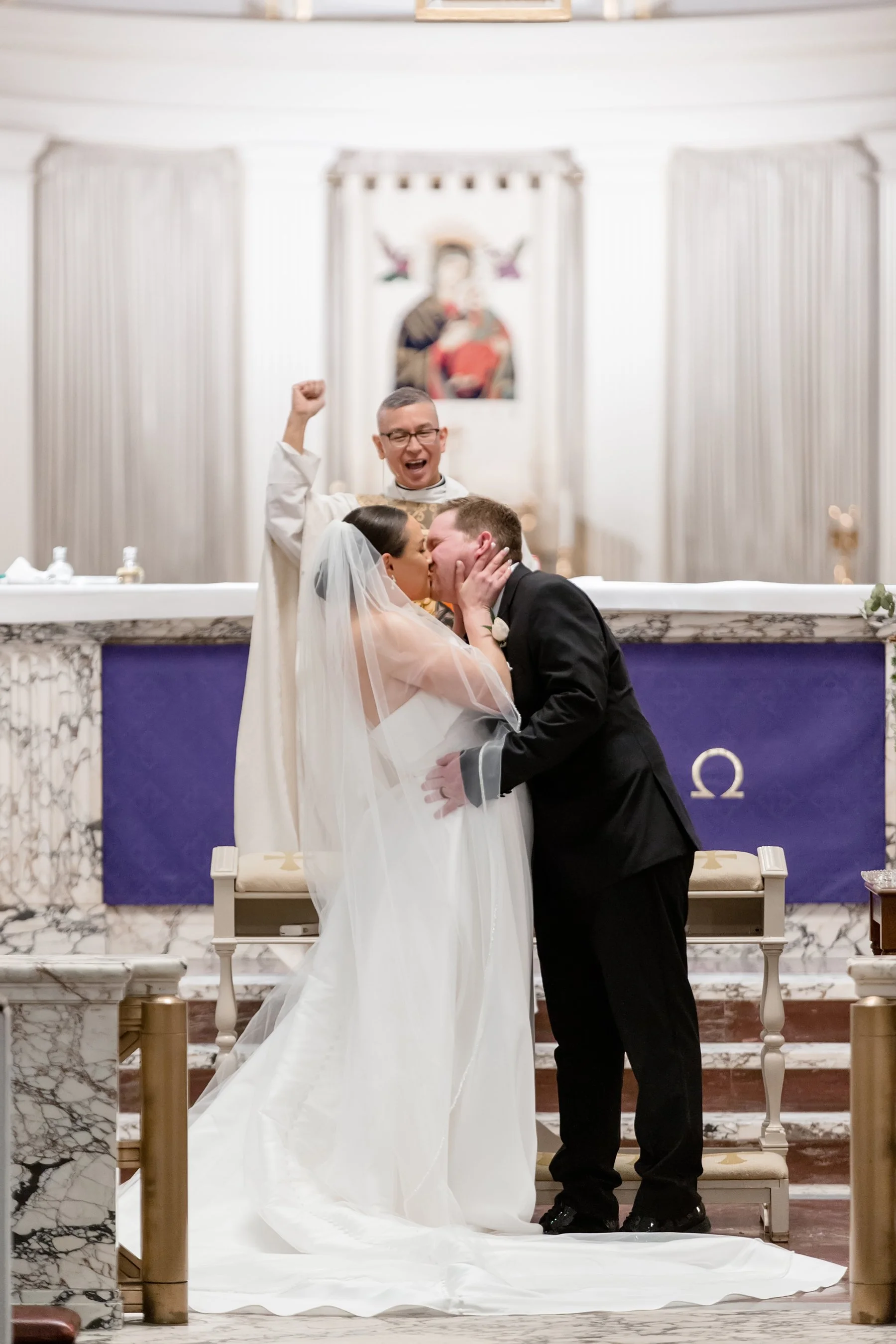 I first got to know Nicole and Ben at their engagement session last Spring, we met up at Graeter’s Ice Cream in Northbrook and had SO much fun together! Nicole and Ben are just the most joyful, loving and happy people, being in their presence is like a breath of fresh air! We were all SO excited to celebrate their wedding with them this December, it was a cold and snowy day and everything just felt perfect. We arrived at the Lincolnshire Marriott where Nicole and her besties were getting ready, everyone looked amazing thanks to the talented team at Rare Bird Beauties. Once Nicole was ready we arranged a series of “first look” moments inside at the hotel, she saw her Dad, future in-laws and bridesmaids for the first time in her full bridal look, each moment was sweeter than the one before it! It was just so special to be a part of this day, Nicole is clearly SO loved and it meant a lot to us to photograph each of these important people in her life celebrating her and sharing in her joy on her wedding day. Nicole was in high-spirits and said she was very much wanting to do pictures outside, even in her gorgeous strapless gown from Martellen’s. We took Ben outside first and then let the two of them have their first-look moment while we stood in the snow and captured the sweetness from a distance. Nicole and Ben chose to share private vows and we felt so honored to be present while they expressed their love for one another. Soon their wedding party came outside as well to join us for a few quick (and cold!) photos before we all loaded up to head to Our Lady of Perpetual Help for the ceremony.