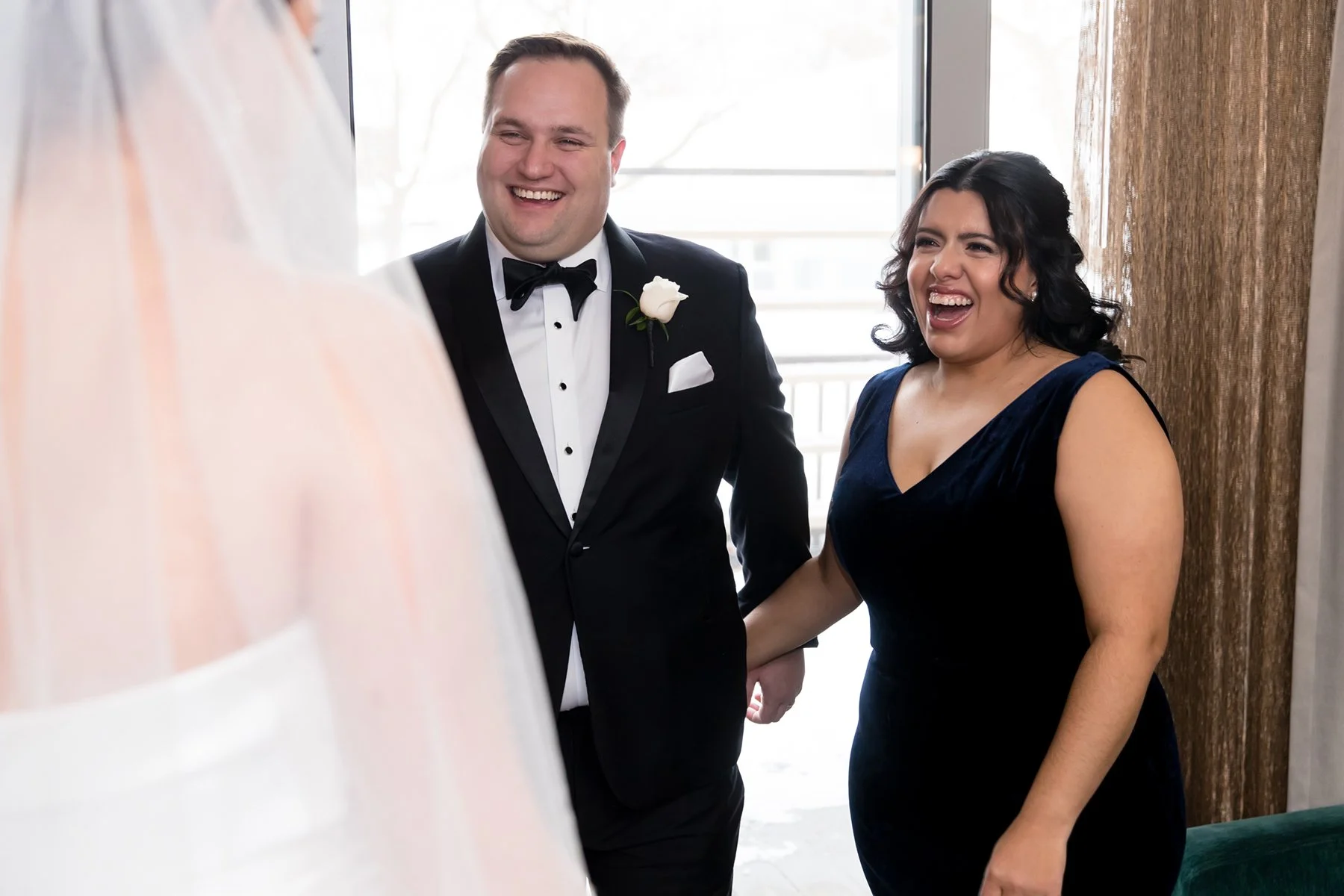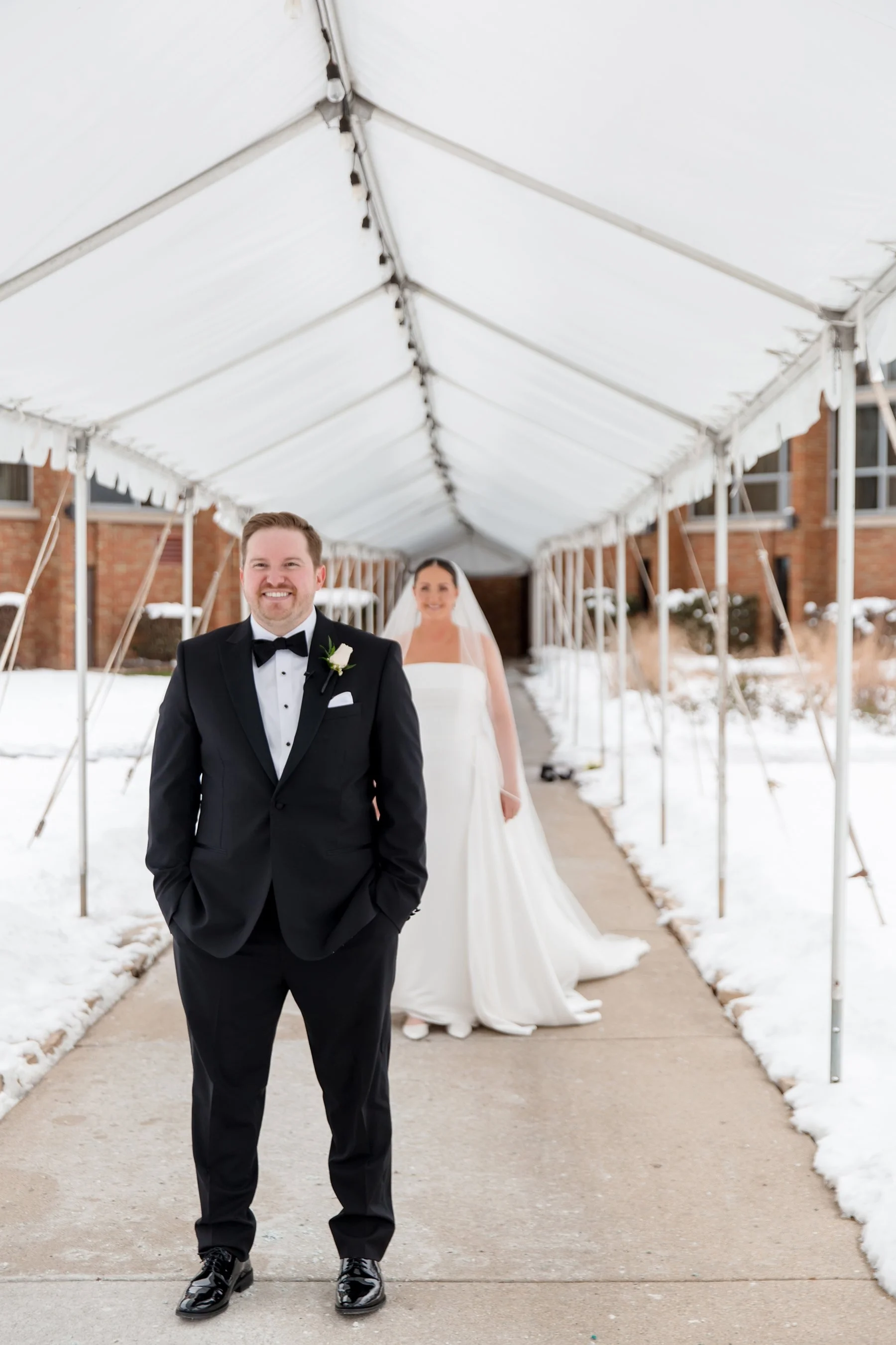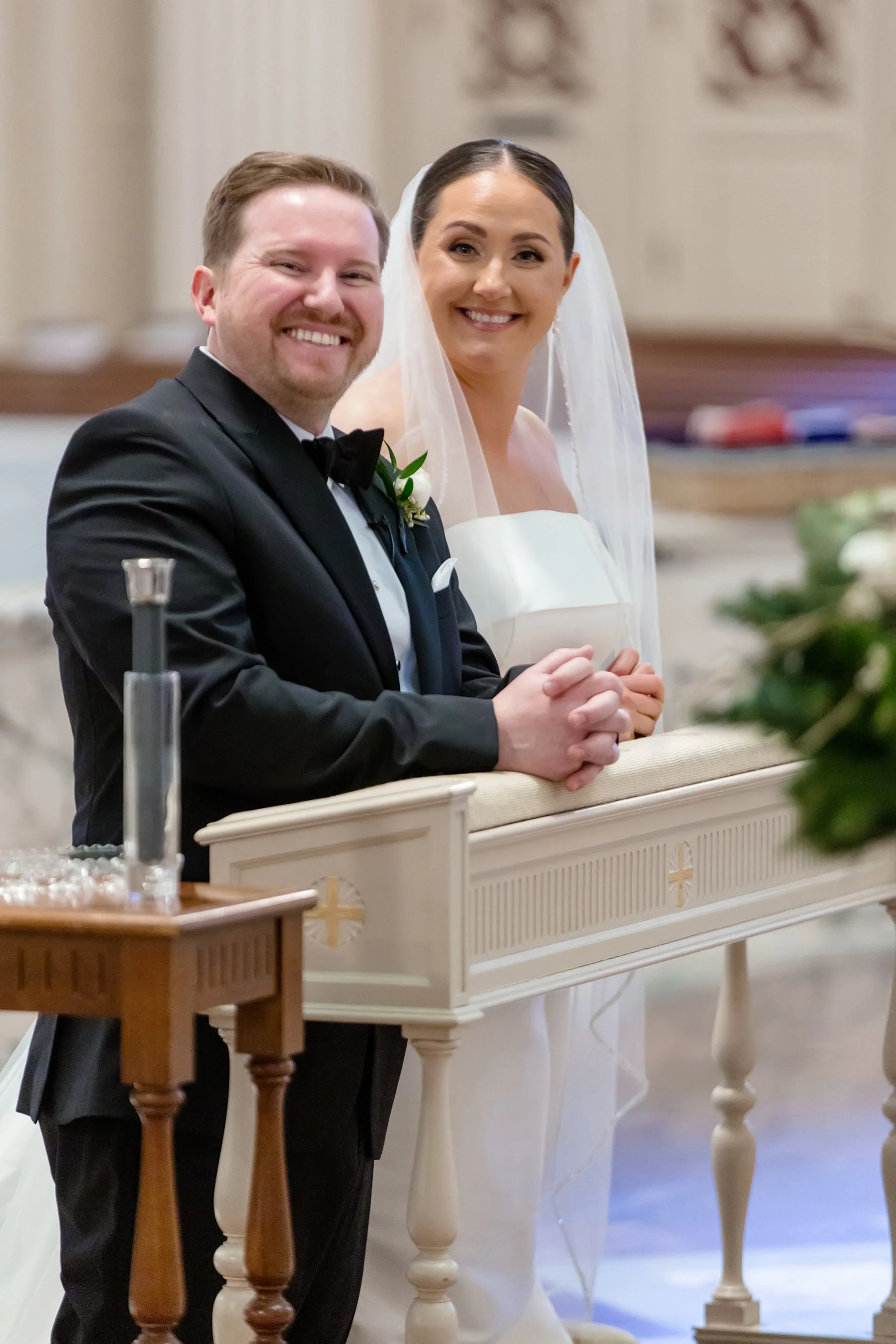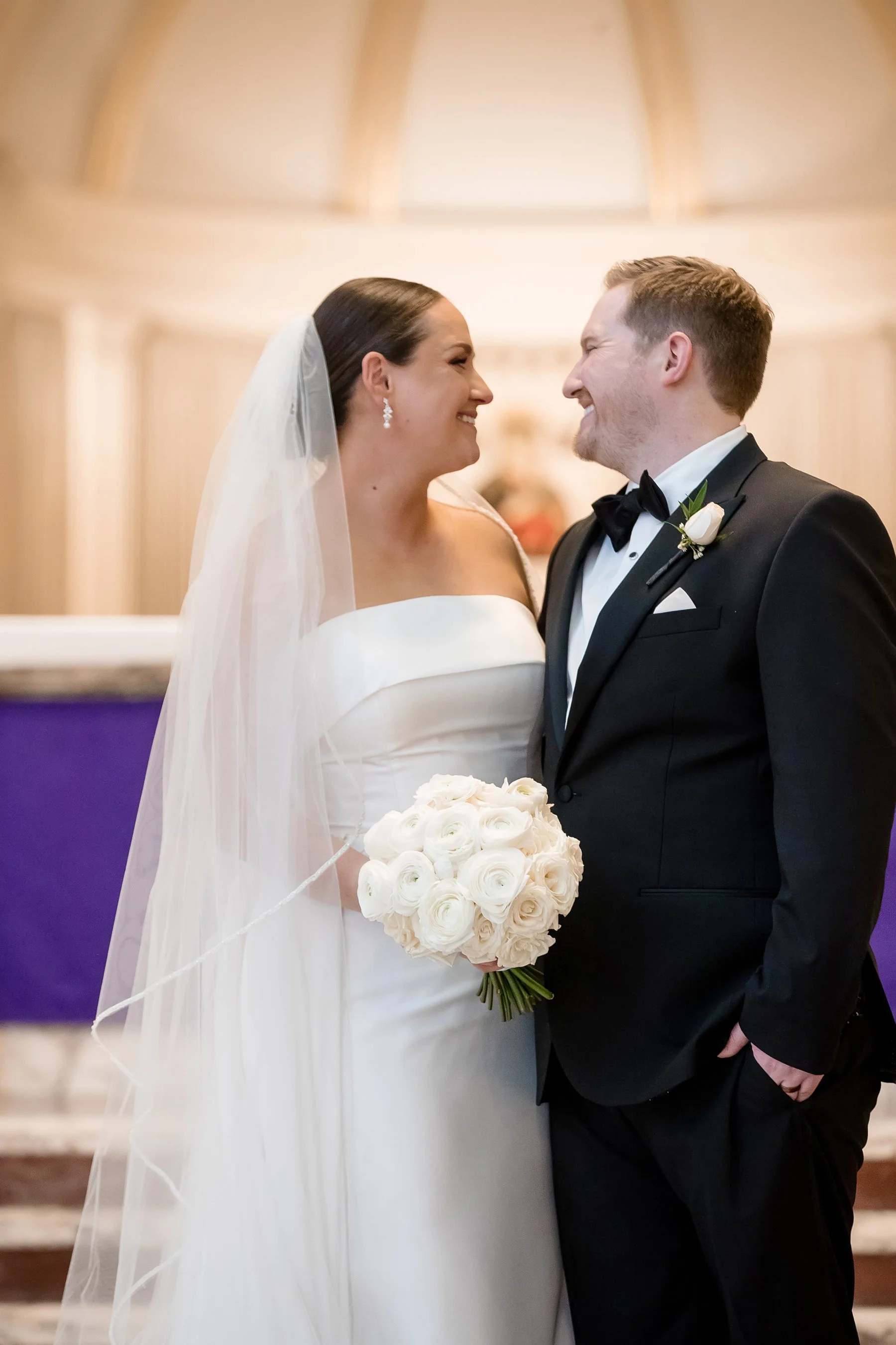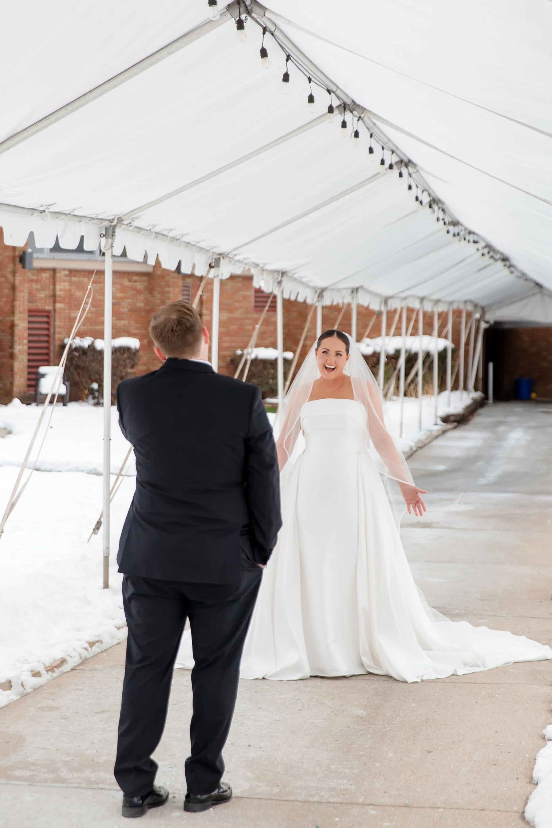 I first got to know Nicole and Ben at their engagement session last Spring, we met up at Graeter’s Ice Cream in Northbrook and had SO much fun together! Nicole and Ben are just the most joyful, loving and happy people, being in their presence is like a breath of fresh air! We were all SO excited to celebrate their wedding with them this December, it was a cold and snowy day and everything just felt perfect. We arrived at the Lincolnshire Marriott where Nicole and her besties were getting ready, everyone looked amazing thanks to the talented team at Rare Bird Beauties. Once Nicole was ready we arranged a series of “first look” moments inside at the hotel, she saw her Dad, future in-laws and bridesmaids for the first time in her full bridal look, each moment was sweeter than the one before it! It was just so special to be a part of this day, Nicole is clearly SO loved and it meant a lot to us to photograph each of these important people in her life celebrating her and sharing in her joy on her wedding day. Nicole was in high-spirits and said she was very much wanting to do pictures outside, even in her gorgeous strapless gown from Martellen’s. We took Ben outside first and then let the two of them have their first-look moment while we stood in the snow and captured the sweetness from a distance. Nicole and Ben chose to share private vows and we felt so honored to be present while they expressed their love for one another. Soon their wedding party came outside as well to join us for a few quick (and cold!) photos before we all loaded up to head to Our Lady of Perpetual Help for the ceremony.