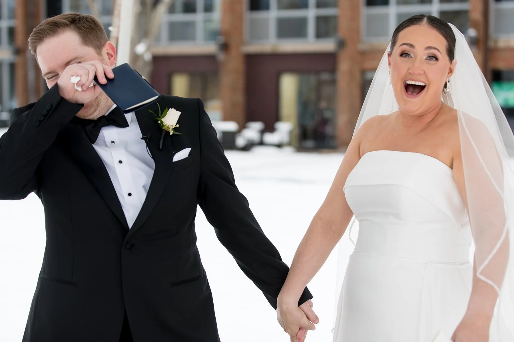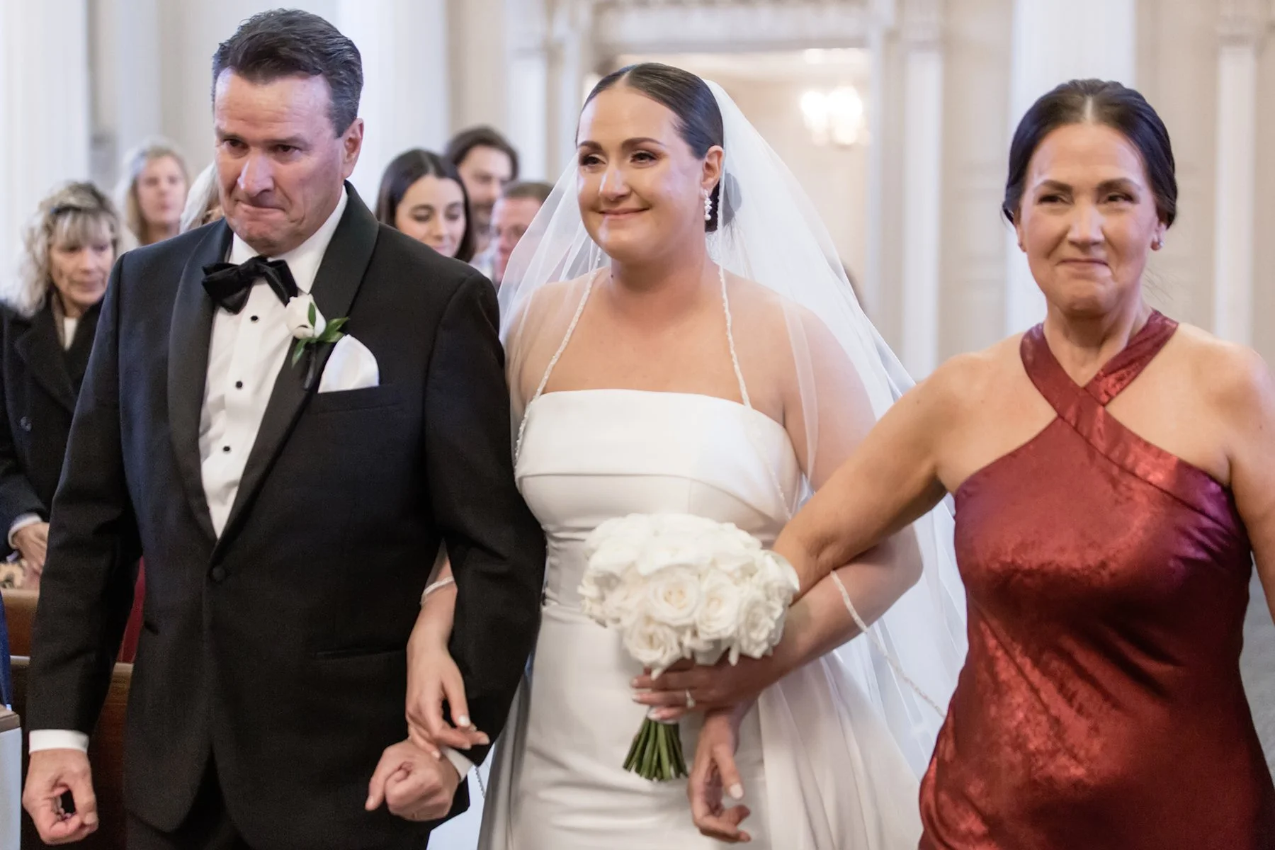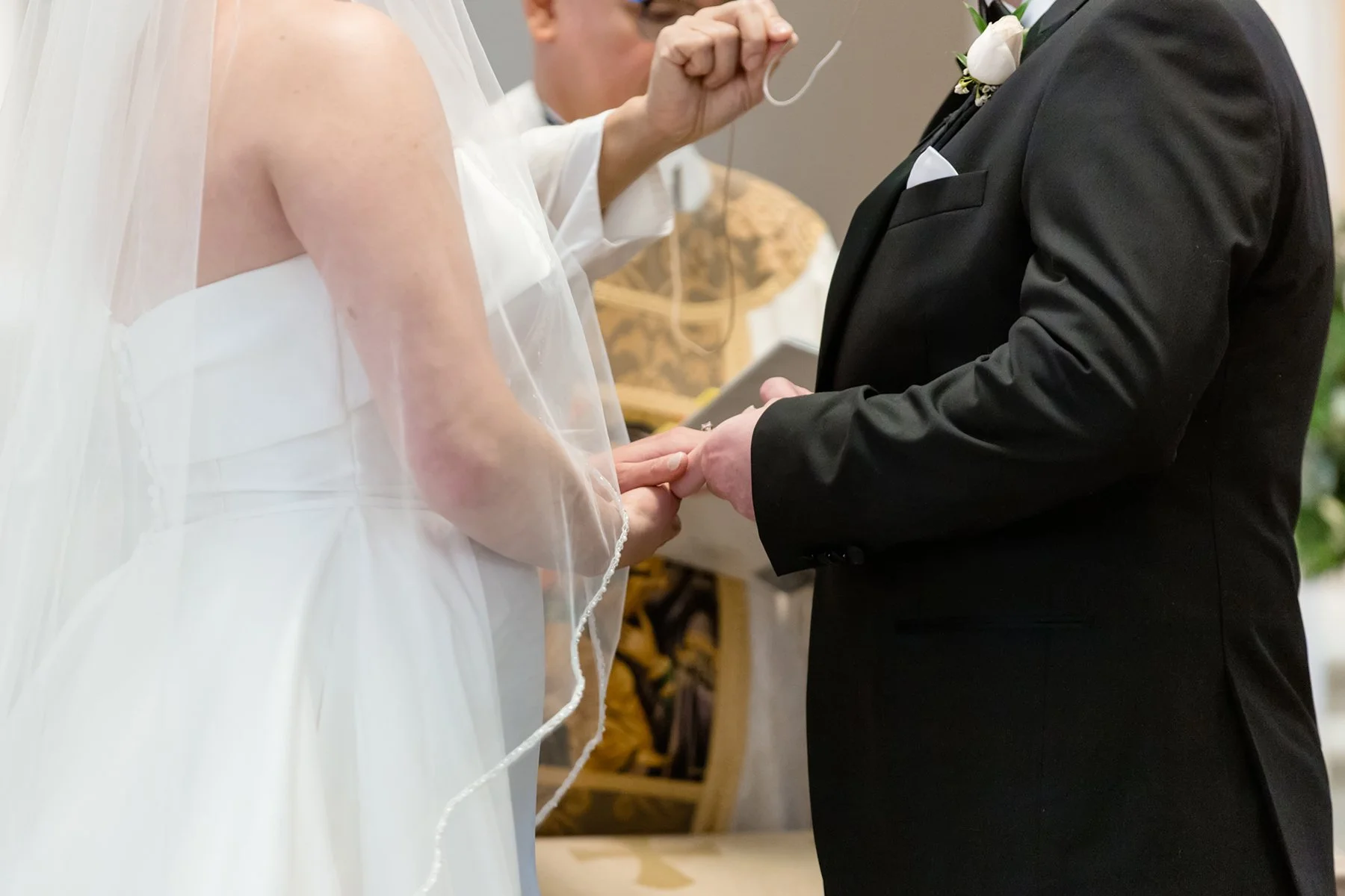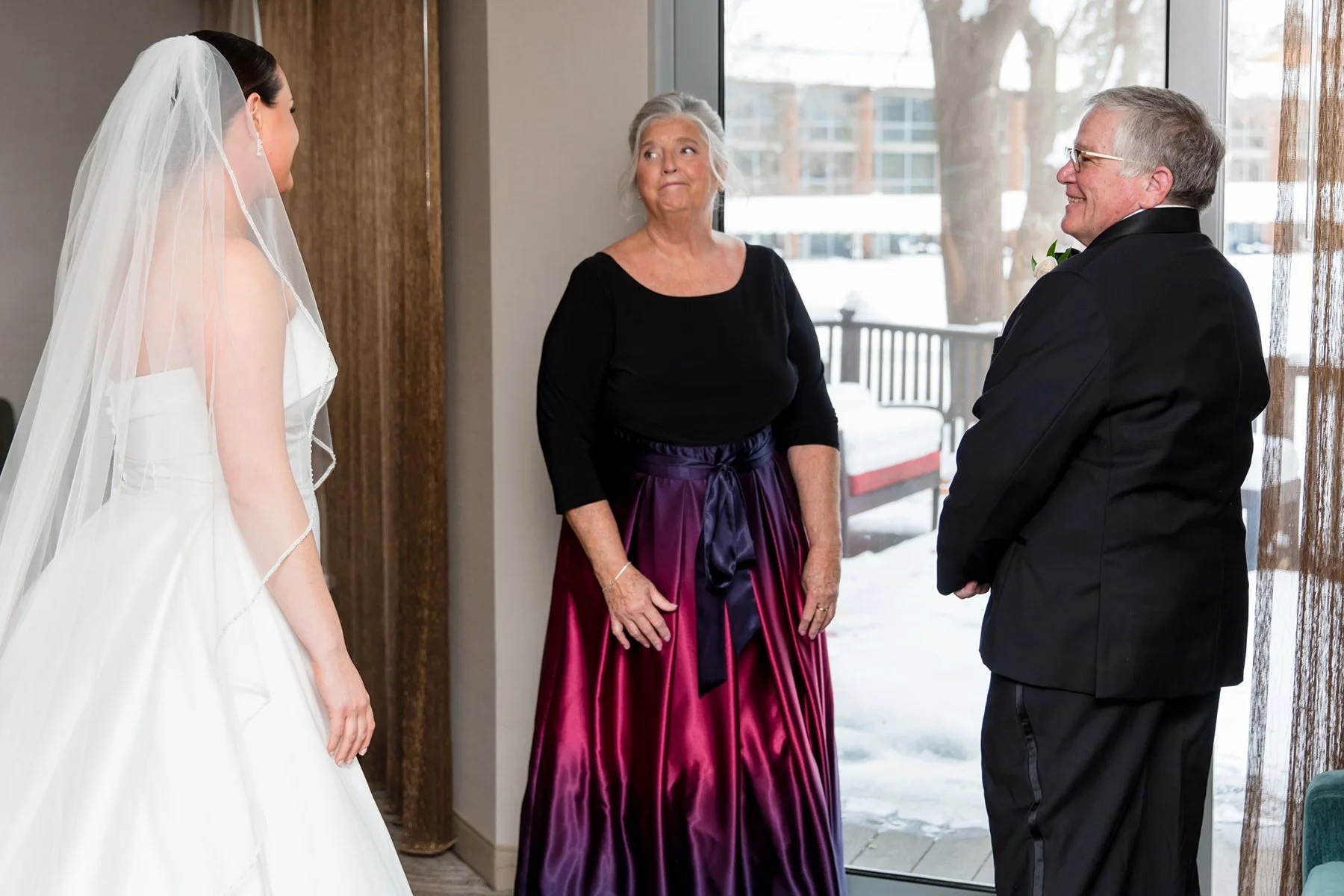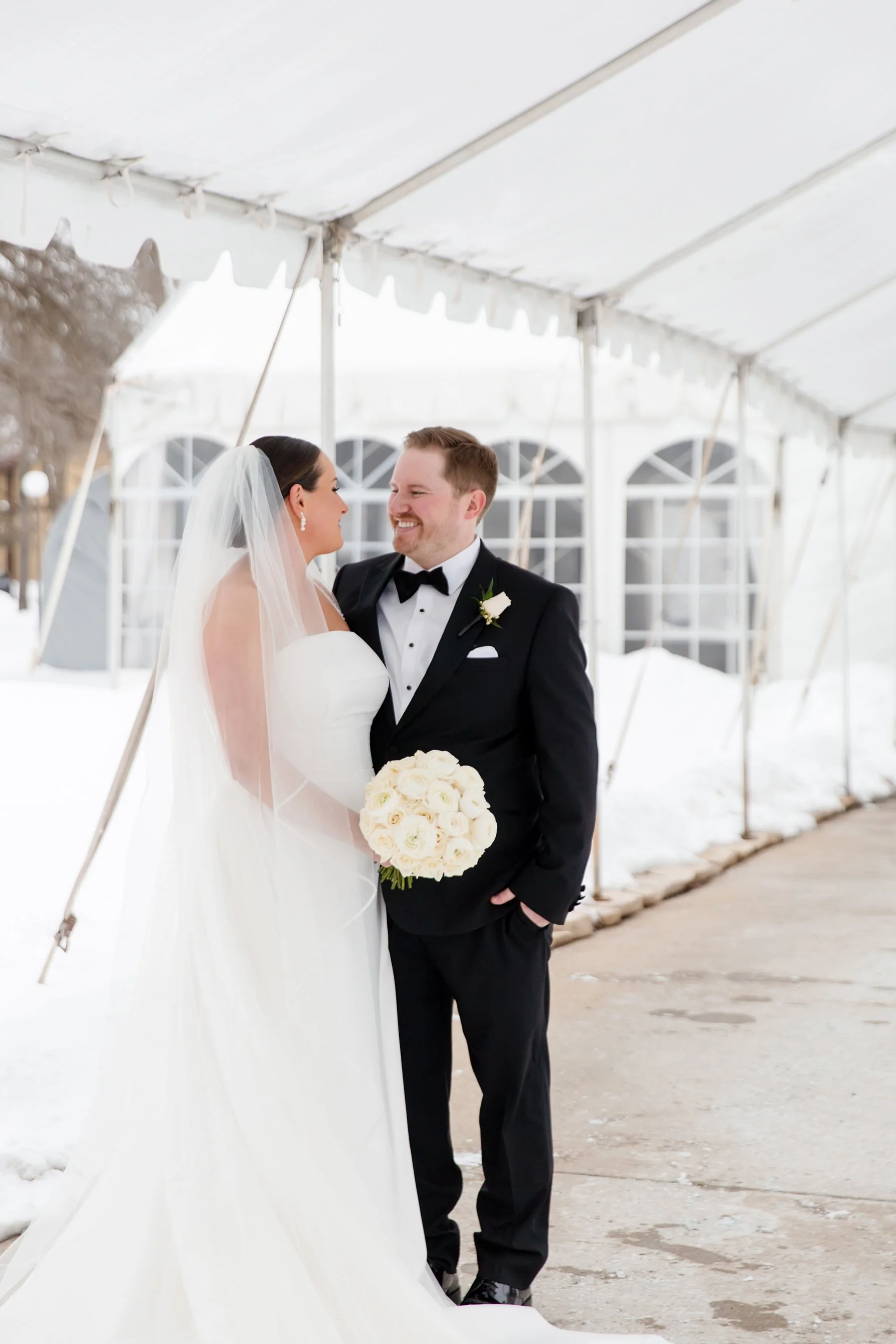 I first got to know Nicole and Ben at their engagement session last Spring, we met up at Graeter’s Ice Cream in Northbrook and had SO much fun together! Nicole and Ben are just the most joyful, loving and happy people, being in their presence is like a breath of fresh air! We were all SO excited to celebrate their wedding with them this December, it was a cold and snowy day and everything just felt perfect. We arrived at the Lincolnshire Marriott where Nicole and her besties were getting ready, everyone looked amazing thanks to the talented team at Rare Bird Beauties. Once Nicole was ready we arranged a series of “first look” moments inside at the hotel, she saw her Dad, future in-laws and bridesmaids for the first time in her full bridal look, each moment was sweeter than the one before it! It was just so special to be a part of this day, Nicole is clearly SO loved and it meant a lot to us to photograph each of these important people in her life celebrating her and sharing in her joy on her wedding day. Nicole was in high-spirits and said she was very much wanting to do pictures outside, even in her gorgeous strapless gown from Martellen’s. We took Ben outside first and then let the two of them have their first-look moment while we stood in the snow and captured the sweetness from a distance. Nicole and Ben chose to share private vows and we felt so honored to be present while they expressed their love for one another. Soon their wedding party came outside as well to join us for a few quick (and cold!) photos before we all loaded up to head to Our Lady of Perpetual Help for the ceremony.
