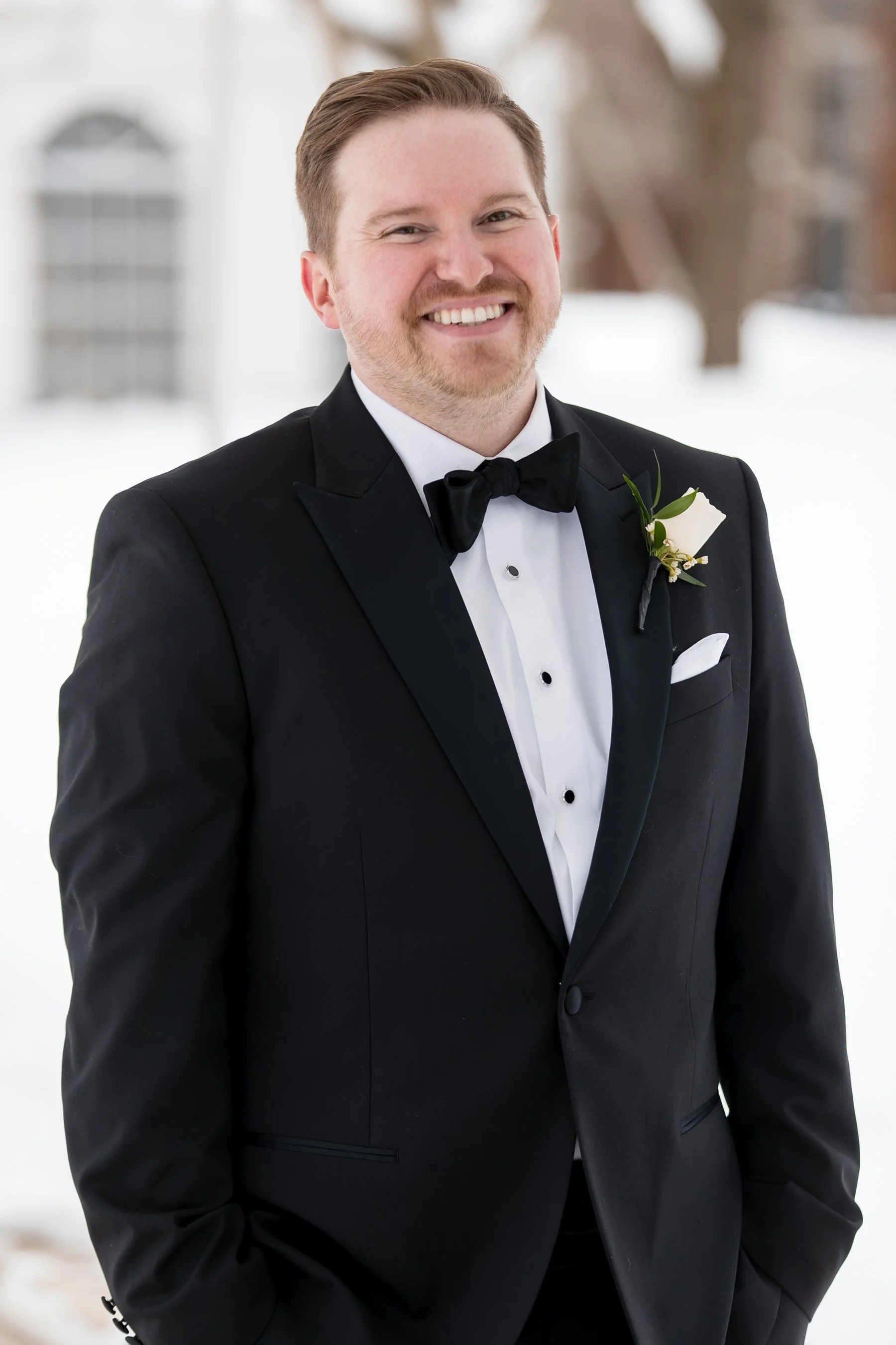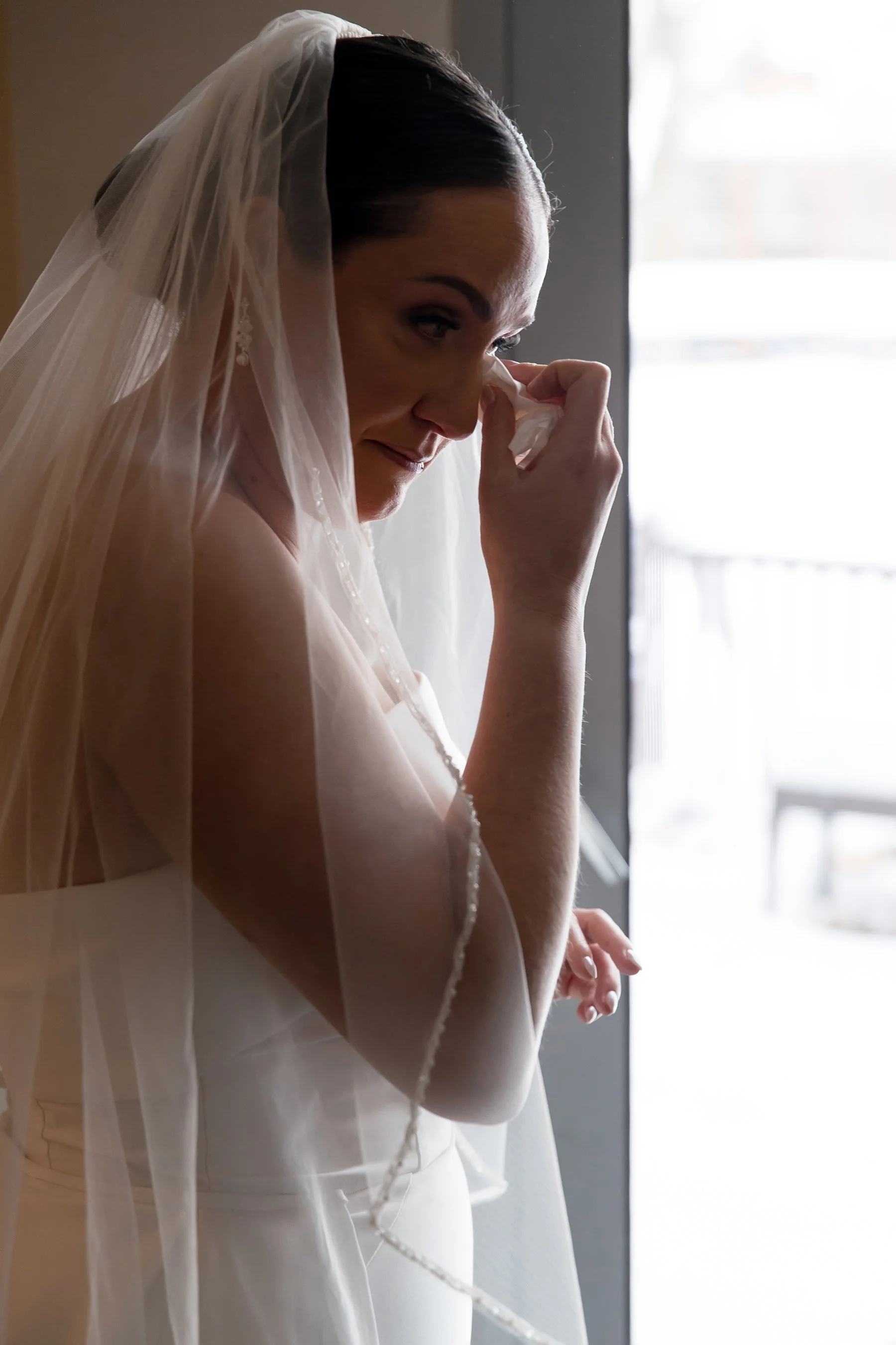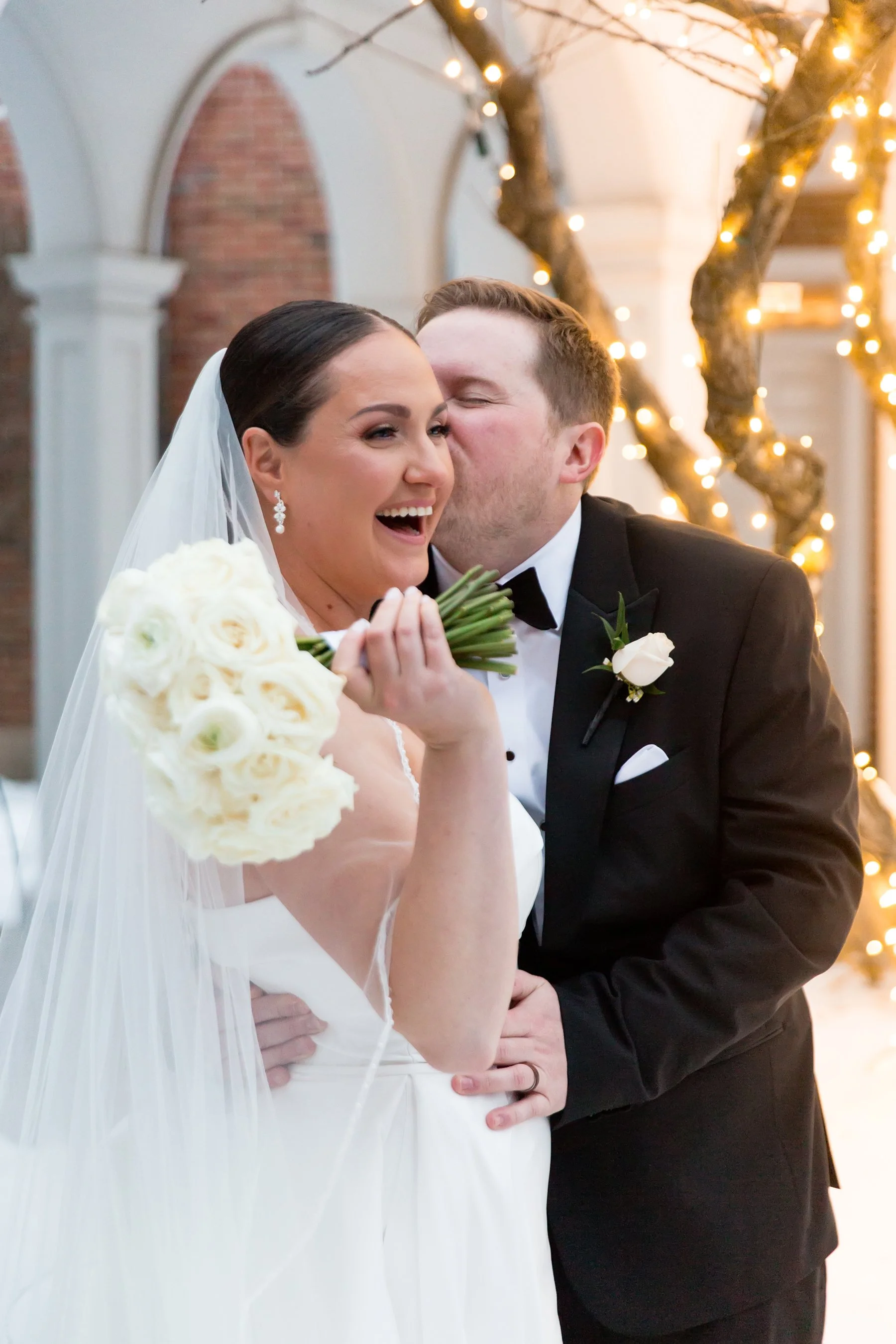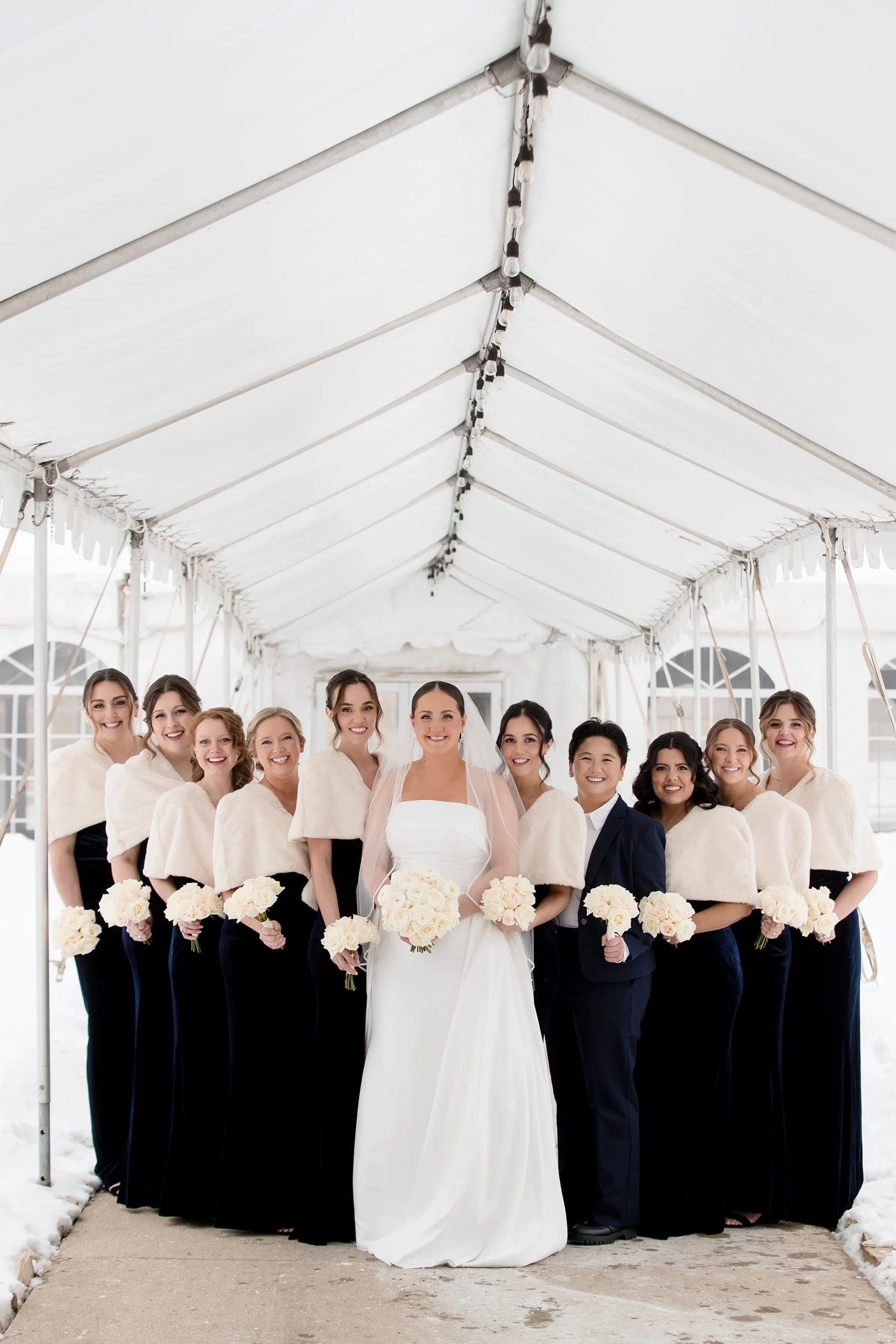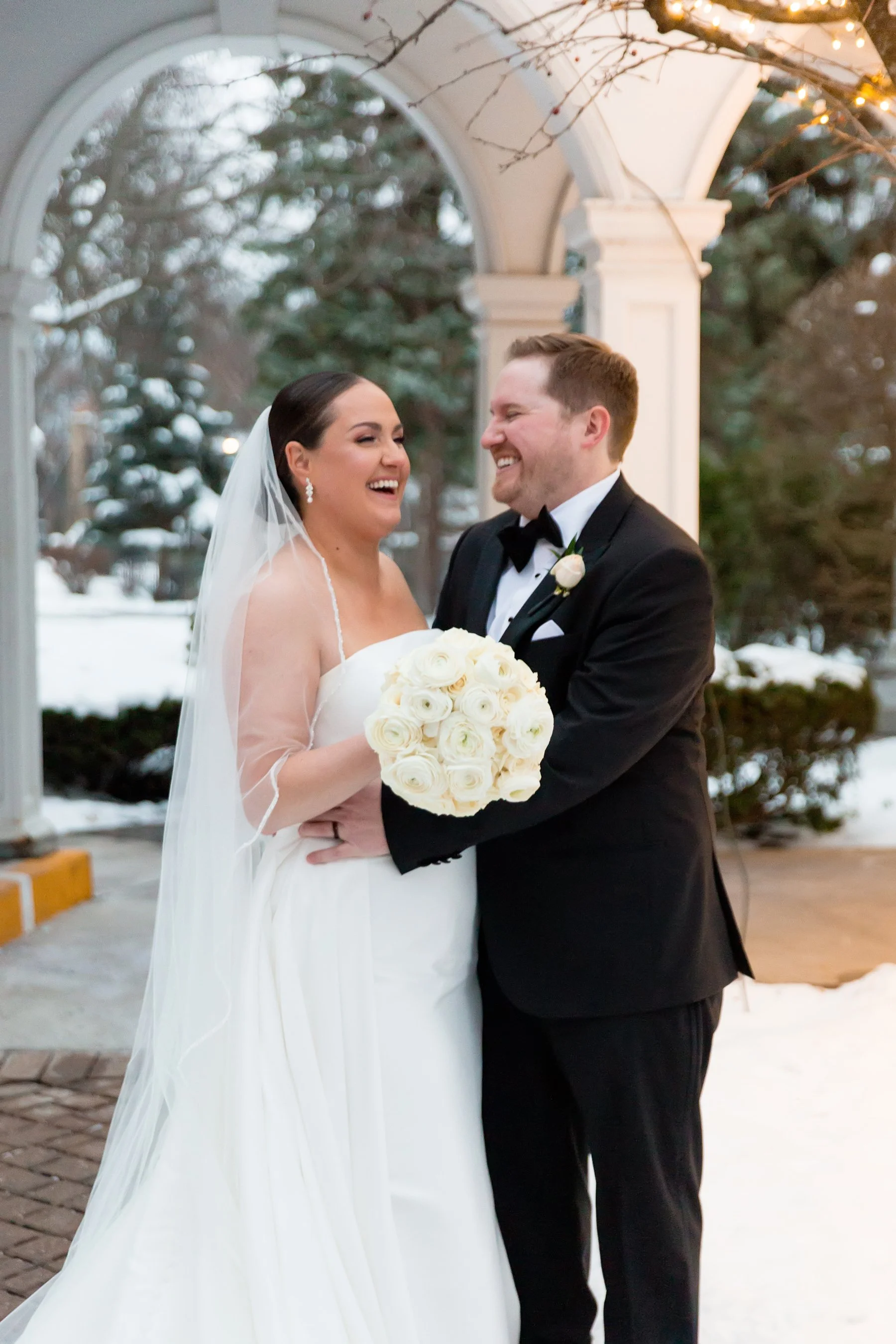 I first got to know Nicole and Ben at their engagement session last Spring, we met up at Graeter’s Ice Cream in Northbrook and had SO much fun together! Nicole and Ben are just the most joyful, loving and happy people, being in their presence is like a breath of fresh air! We were all SO excited to celebrate their wedding with them this December, it was a cold and snowy day and everything just felt perfect. We arrived at the Lincolnshire Marriott where Nicole and her besties were getting ready, everyone looked amazing thanks to the talented team at Rare Bird Beauties. Once Nicole was ready we arranged a series of “first look” moments inside at the hotel, she saw her Dad, future in-laws and bridesmaids for the first time in her full bridal look, each moment was sweeter than the one before it! It was just so special to be a part of this day, Nicole is clearly SO loved and it meant a lot to us to photograph each of these important people in her life celebrating her and sharing in her joy on her wedding day. Nicole was in high-spirits and said she was very much wanting to do pictures outside, even in her gorgeous strapless gown from Martellen’s. We took Ben outside first and then let the two of them have their first-look moment while we stood in the snow and captured the sweetness from a distance. Nicole and Ben chose to share private vows and we felt so honored to be present while they expressed their love for one another. Soon their wedding party came outside as well to join us for a few quick (and cold!) photos before we all loaded up to head to Our Lady of Perpetual Help for the ceremony.