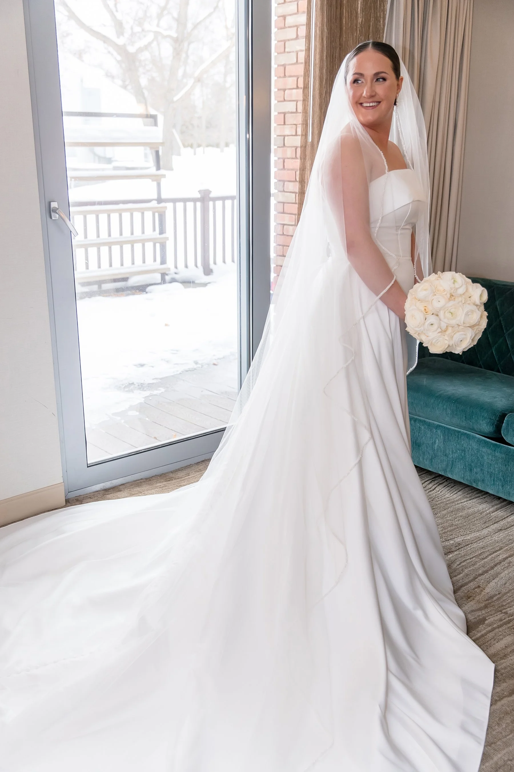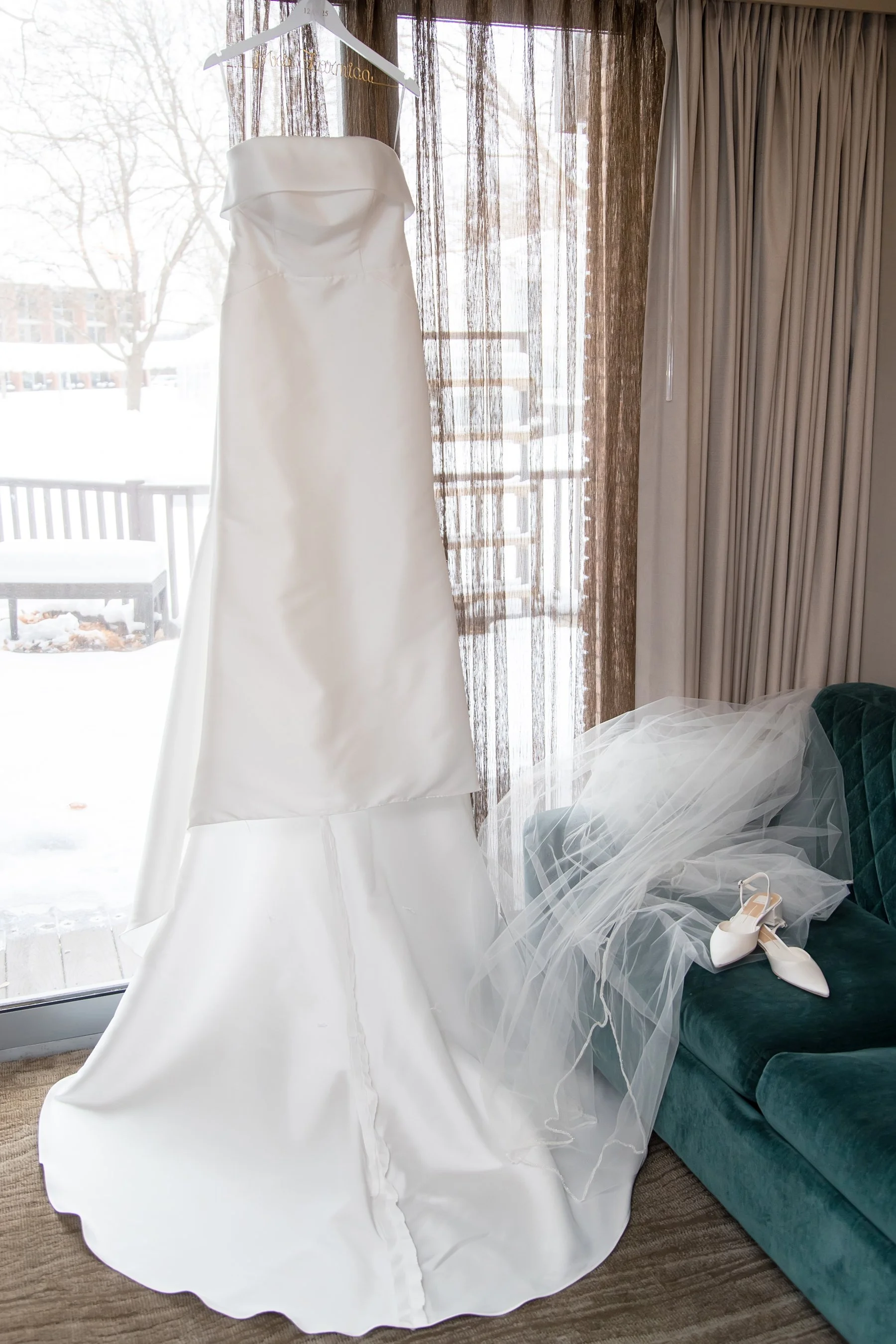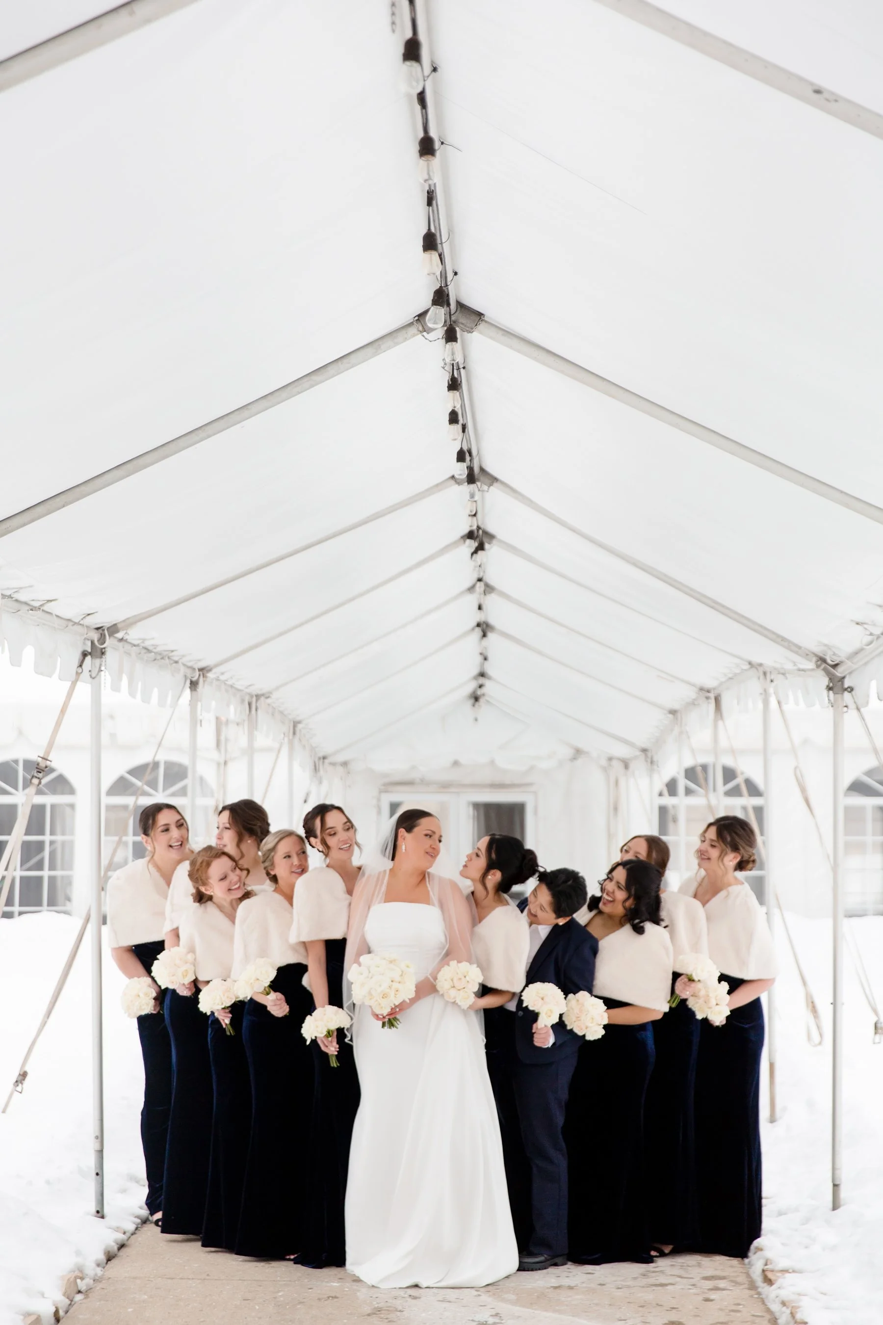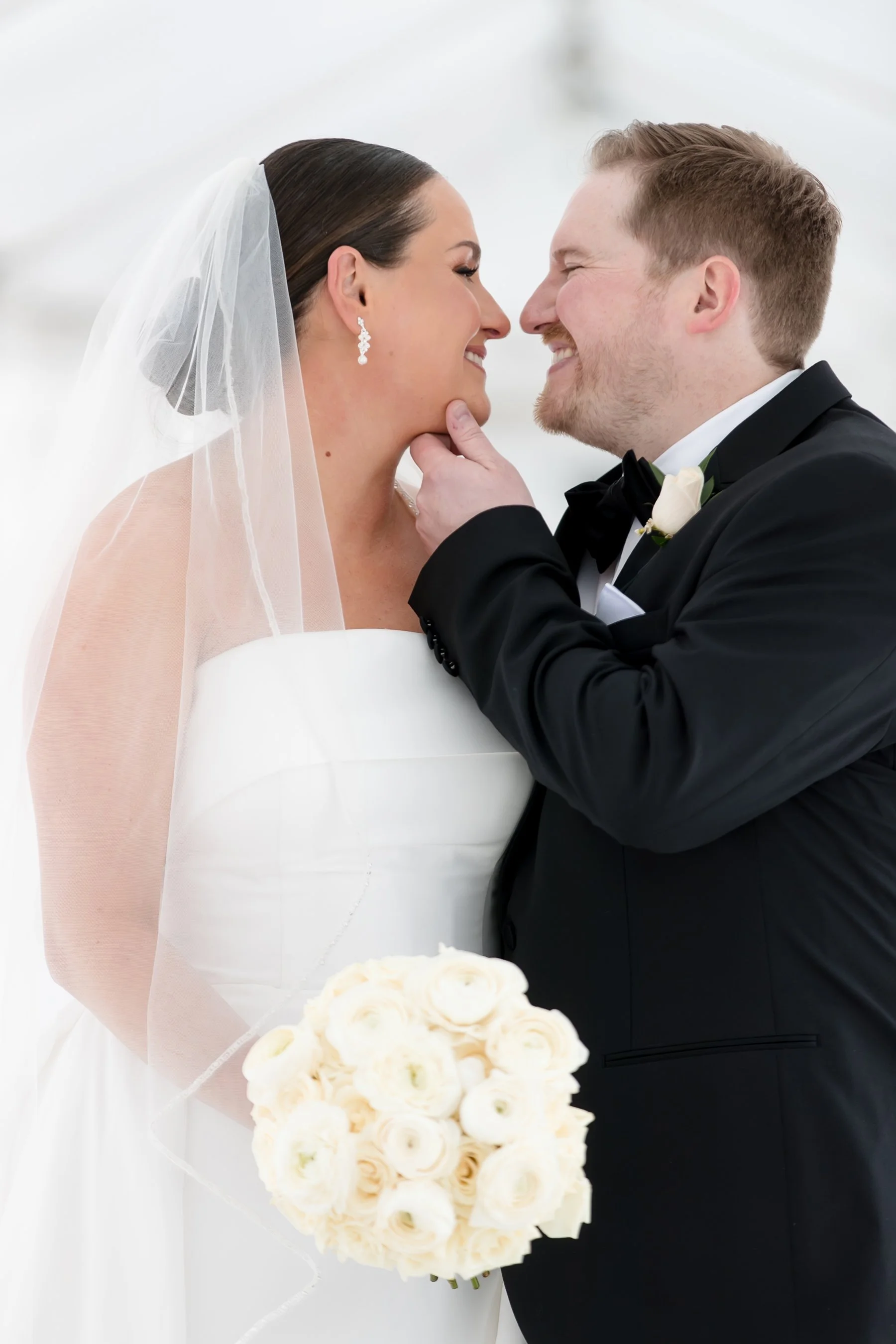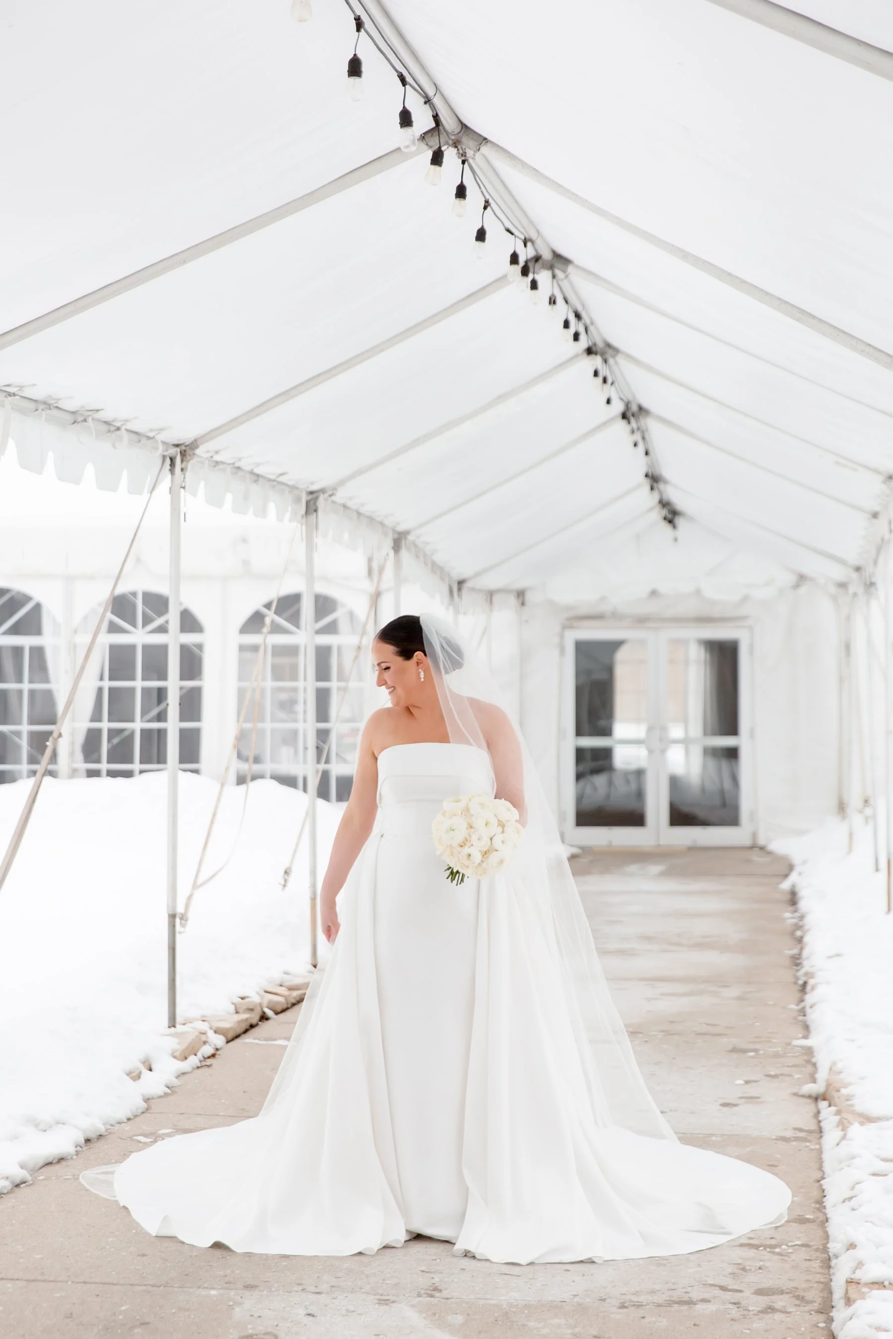I first got to know Nicole and Ben at their engagement session last Spring, we met up at Graeter’s Ice Cream in Northbrook and had SO much fun together! Nicole and Ben are just the most joyful, loving and happy people, being in their presence is like a breath of fresh air! We were all SO excited to celebrate their wedding with them this December, it was a cold and snowy day and everything just felt perfect. We arrived at the Lincolnshire Marriott where Nicole and her besties were getting ready, everyone looked amazing thanks to the talented team at Rare Bird Beauties. Once Nicole was ready we arranged a series of “first look” moments inside at the hotel, she saw her Dad, future in-laws and bridesmaids for the first time in her full bridal look, each moment was sweeter than the one before it! It was just so special to be a part of this day, Nicole is clearly SO loved and it meant a lot to us to photograph each of these important people in her life celebrating her and sharing in her joy on her wedding day. Nicole was in high-spirits and said she was very much wanting to do pictures outside, even in her gorgeous strapless gown from Martellen’s. We took Ben outside first and then let the two of them have their first-look moment while we stood in the snow and captured the sweetness from a distance. Nicole and Ben chose to share private vows and we felt so honored to be present while they expressed their love for one another. Soon their wedding party came outside as well to join us for a few quick (and cold!) photos before we all loaded up to head to Our Lady of Perpetual Help for the ceremony.
