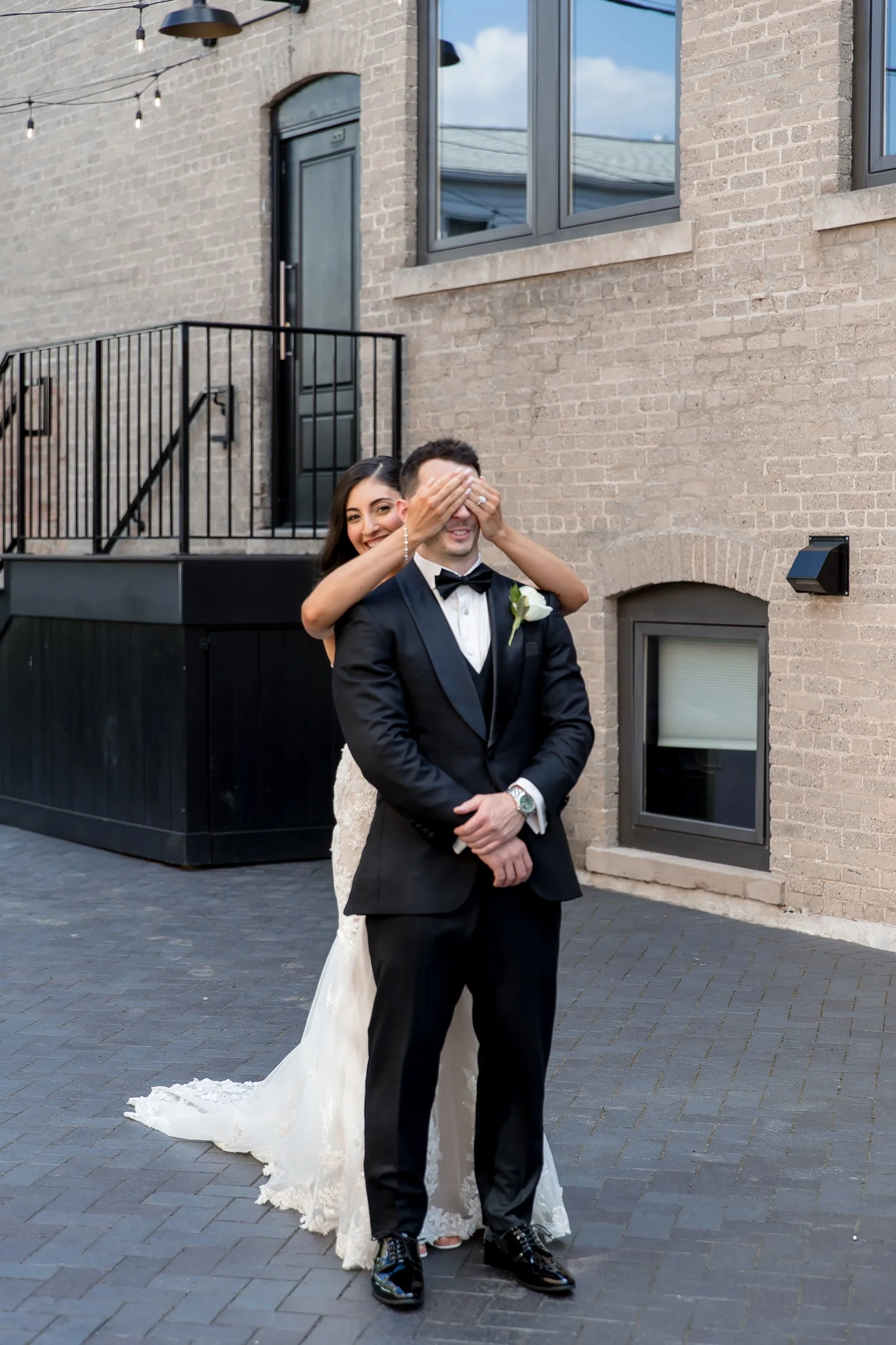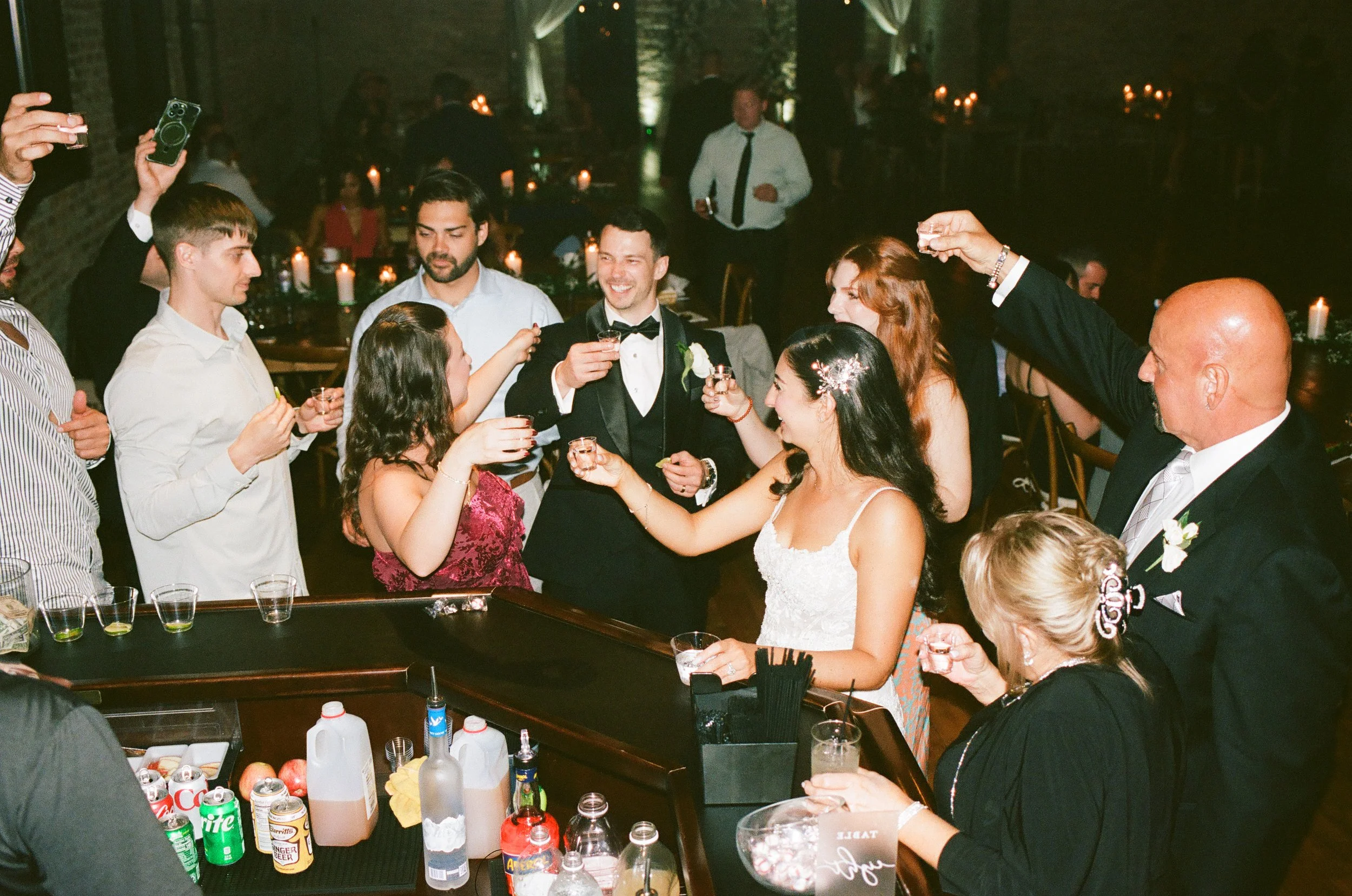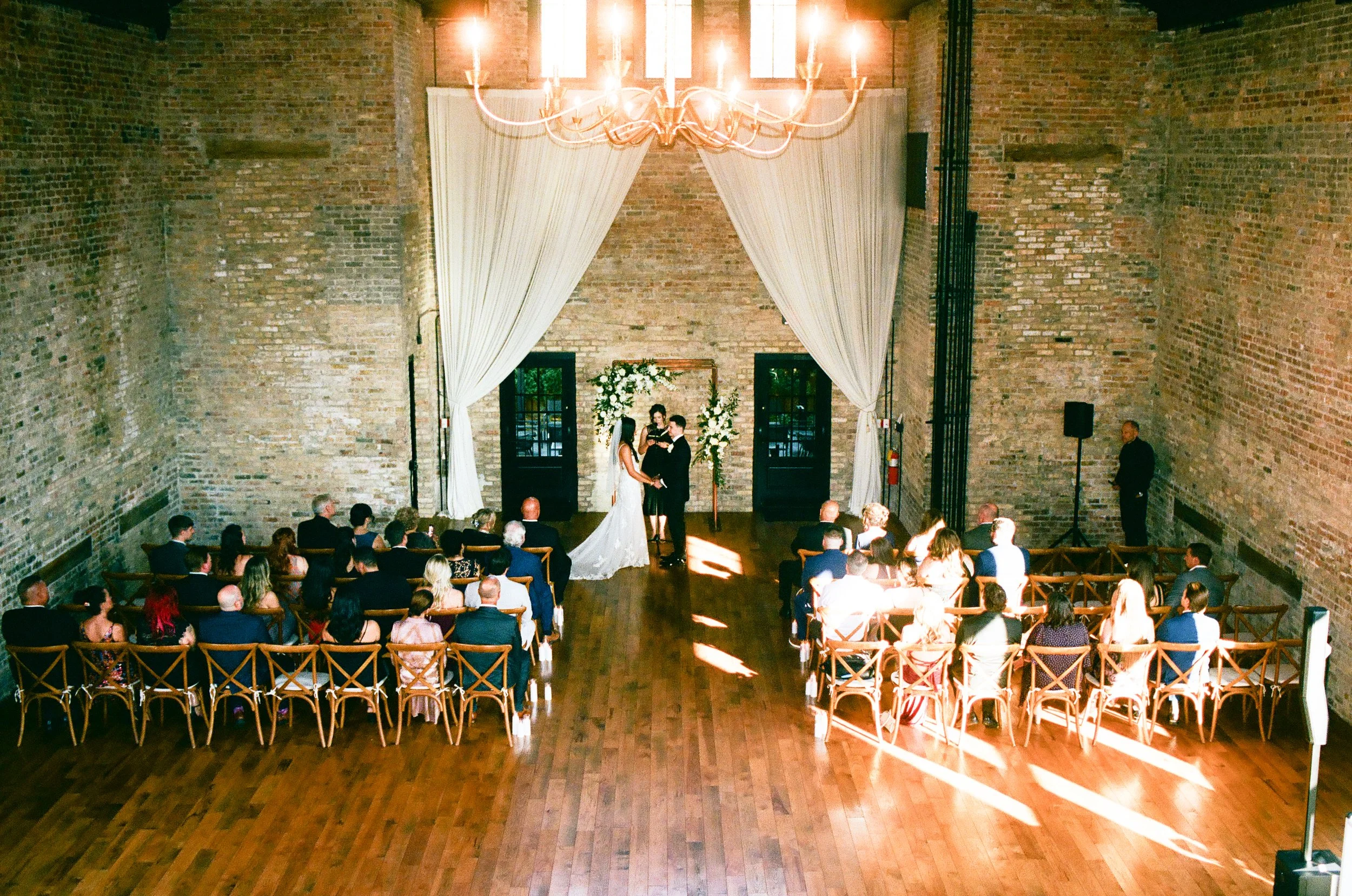 Once Michelle and the girls were ready we made our way to The Grove for her first look with Nolan. They shared a sweet and emotional private moment together there before riding together with their awesome bridal party downtown to Salvage One. After taking some fun wedding party photos on the second floor we made our way downstairs for their ceremony. Michelle’s brother in law served as their officiant during the beautiful ceremony; when Michelle and Nolan shared their vows with one another there wasn’t a dry eye in the house. They shared their first kiss as husband and wife and the celebration really began!