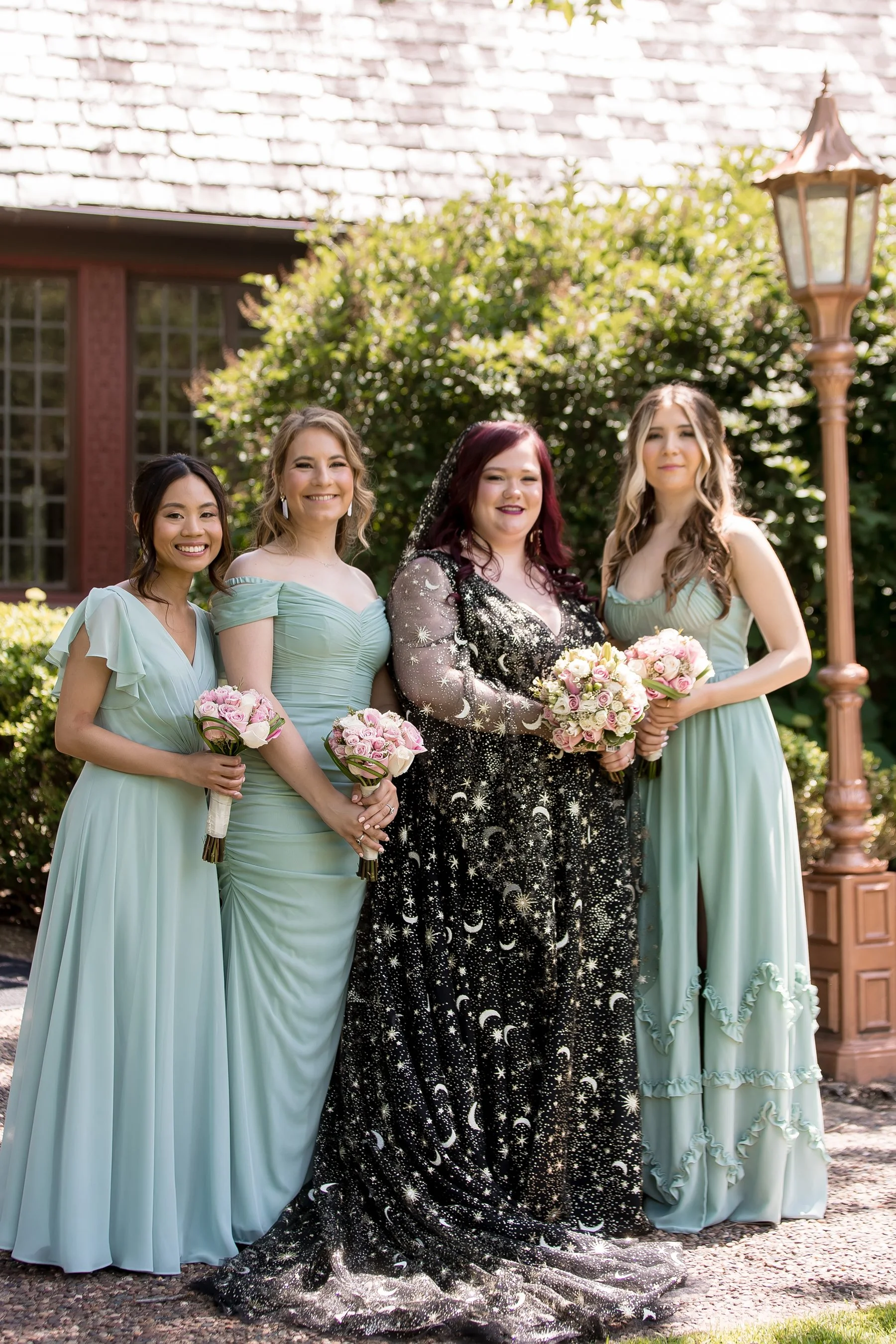 When the day arrived for Nora and Lewis’ wedding we met at the beautiful Redfield Estate at The Grove and met Nora upstairs with her bridesmaids and Mom getting ready. I took Nora’s bridal details downstairs and was so surprised when I unzipped her wedding gown garment bag and found her stunning black celestial gown by Flora & Lane. I knew from that moment that we were in for a special day celebrating Nora and Lewis, I just love that they honored their relationship and chose to do things their way!