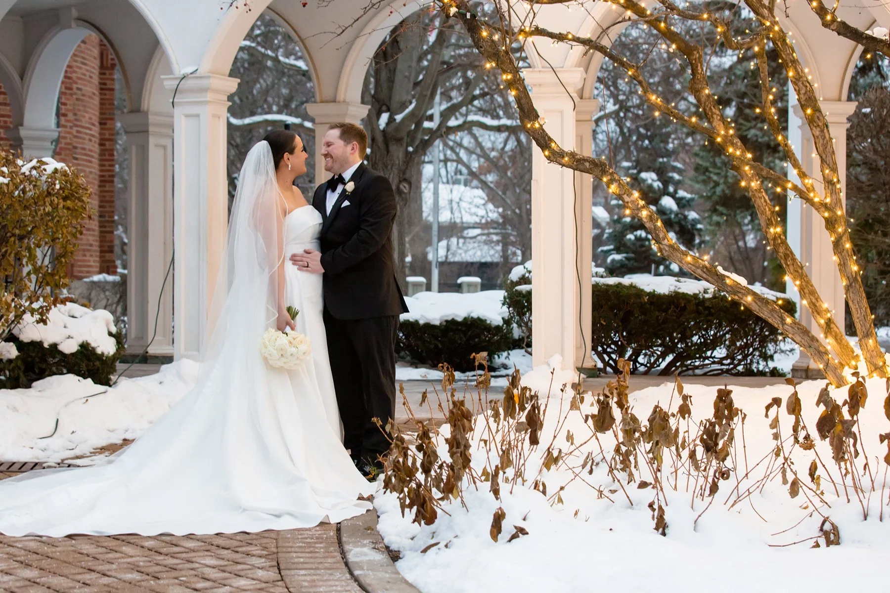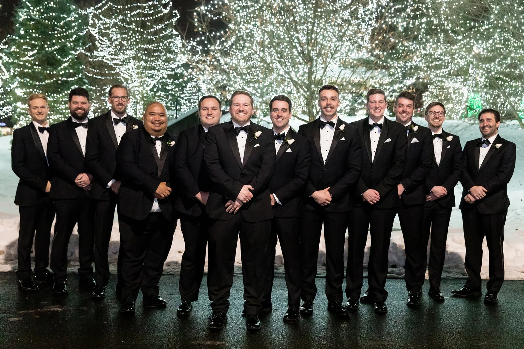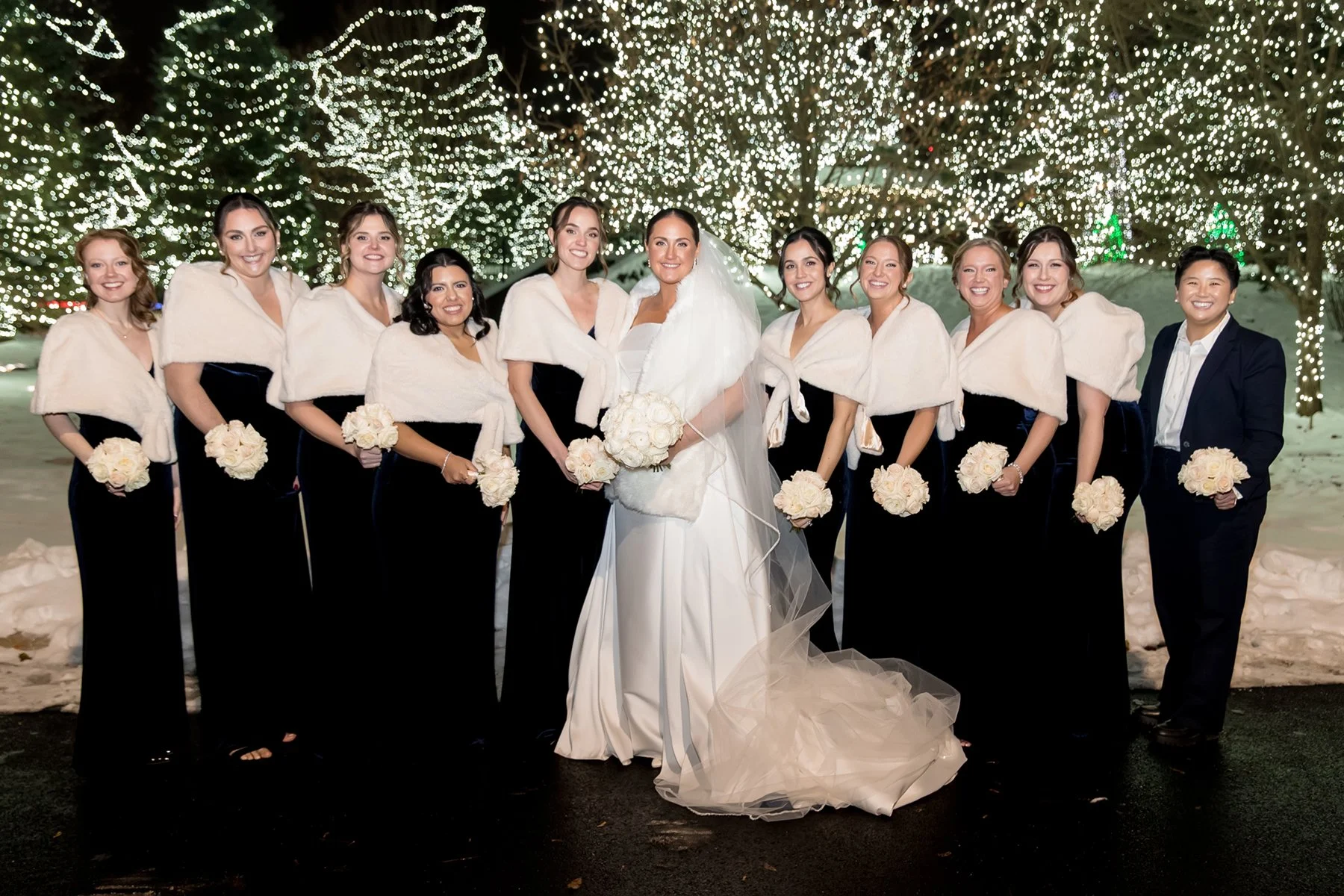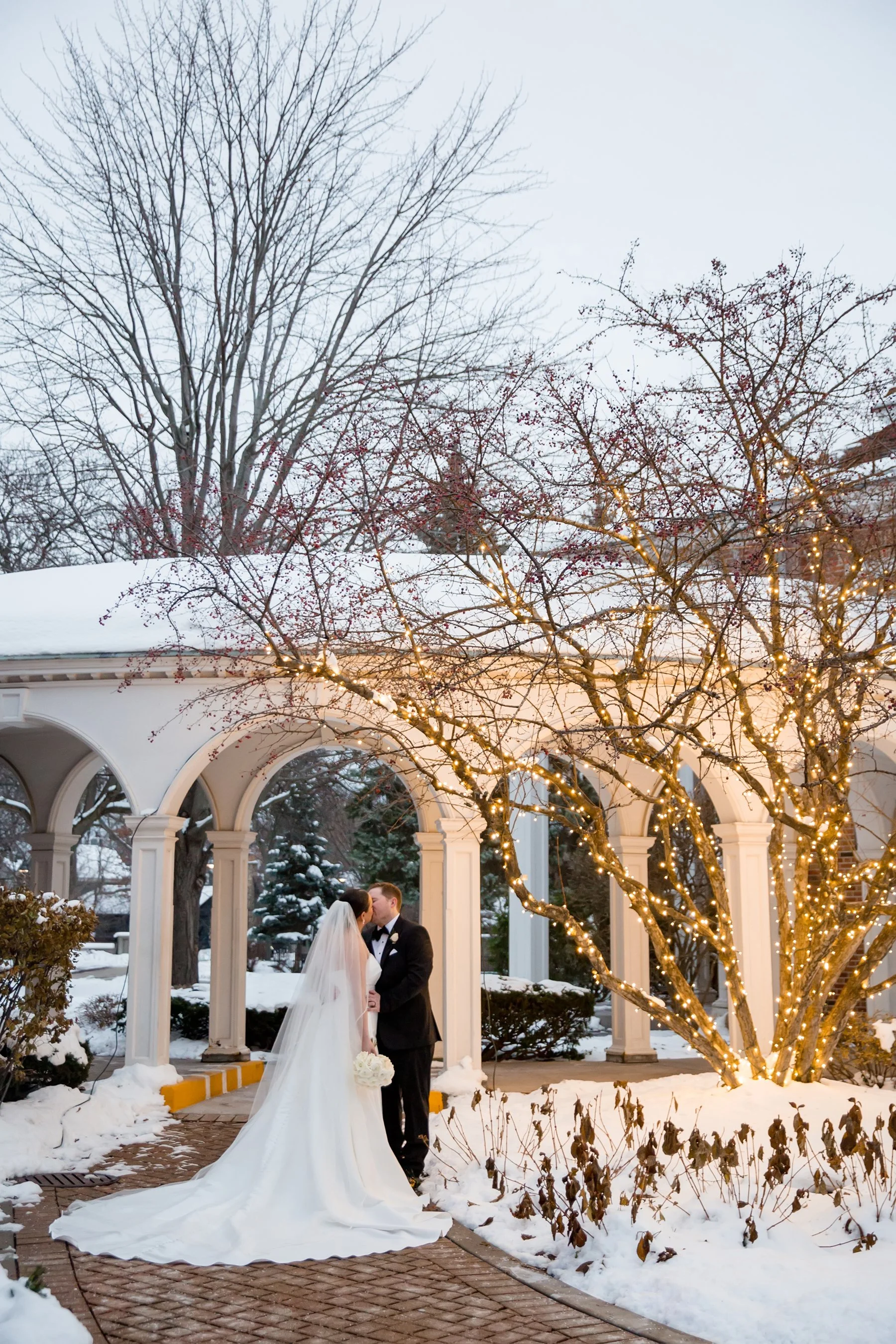 This was my first time visiting Our Lady of Perpetual Help and I was in awe of how beautiful this church and its surrounding grounds are. I wish we could photograph every ceremony here!! Following their traditional Catholic ceremony we snuck outside for a few quick photos with the wedding party and newlyweds before the sun went down. After taking family photos inside of the church we made our way back towards the Lincolnshire Marriott but stopped quickly at the fountain in Wheeling for some pretty and festive nighttime photos with all the pretty Christmas lights. It was so cold but so magical!!