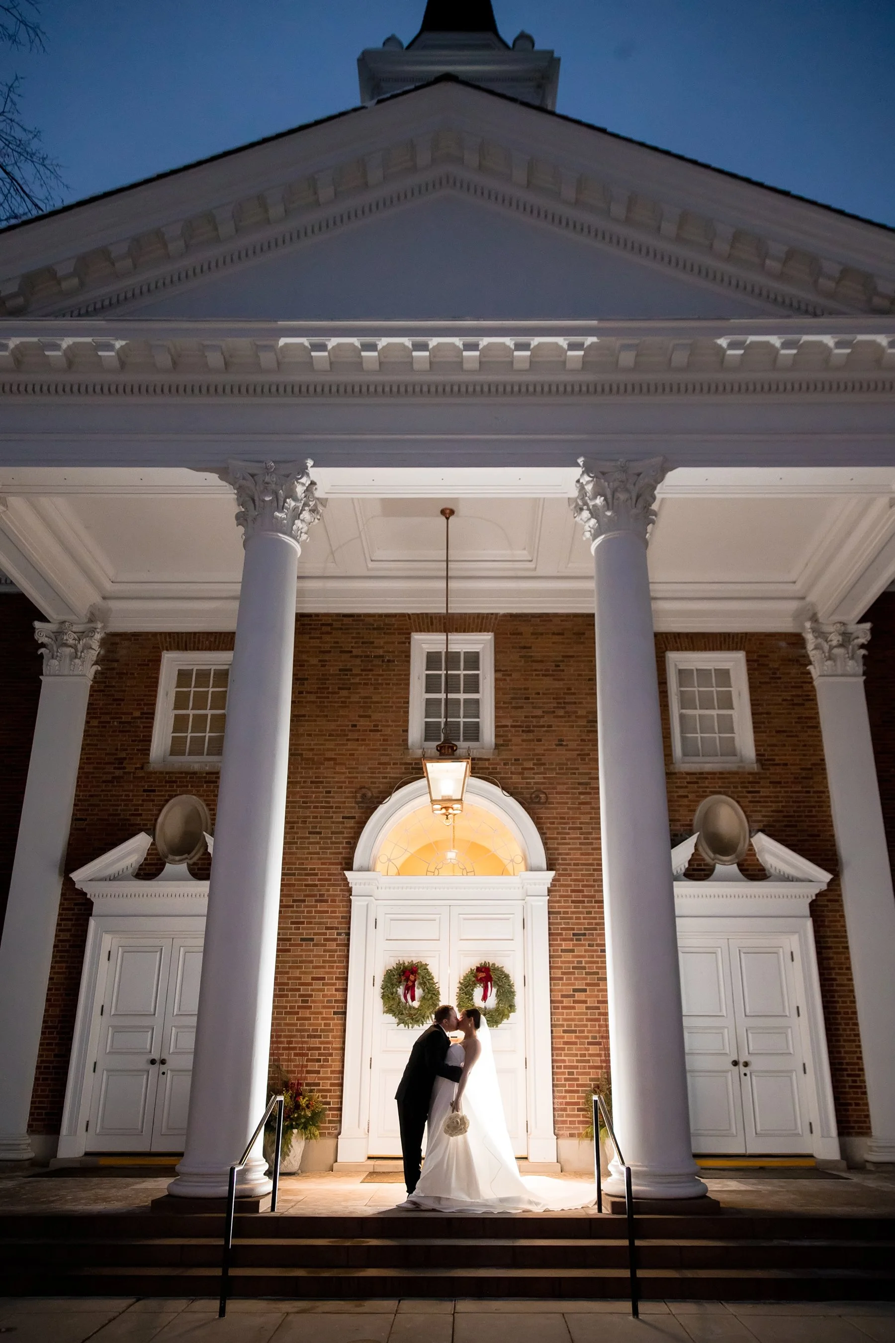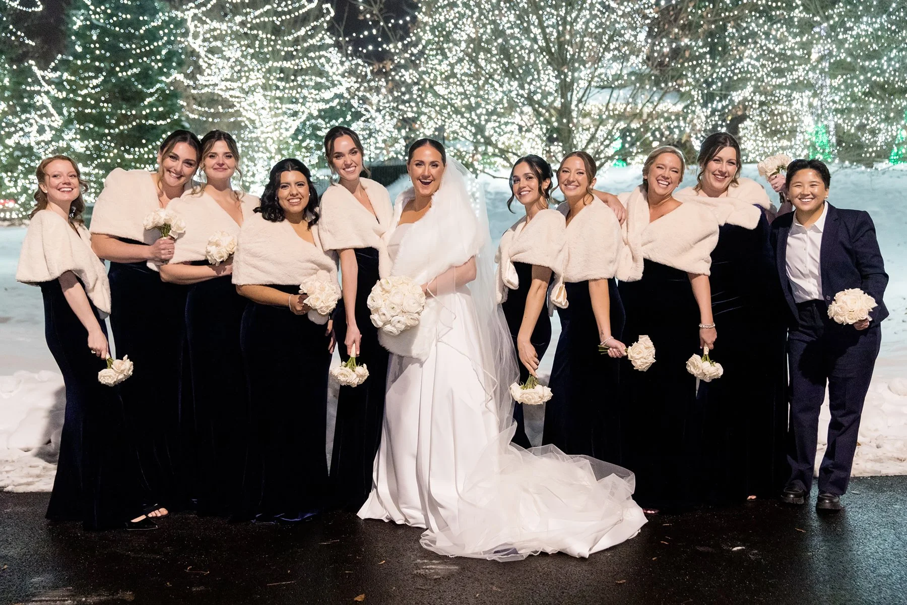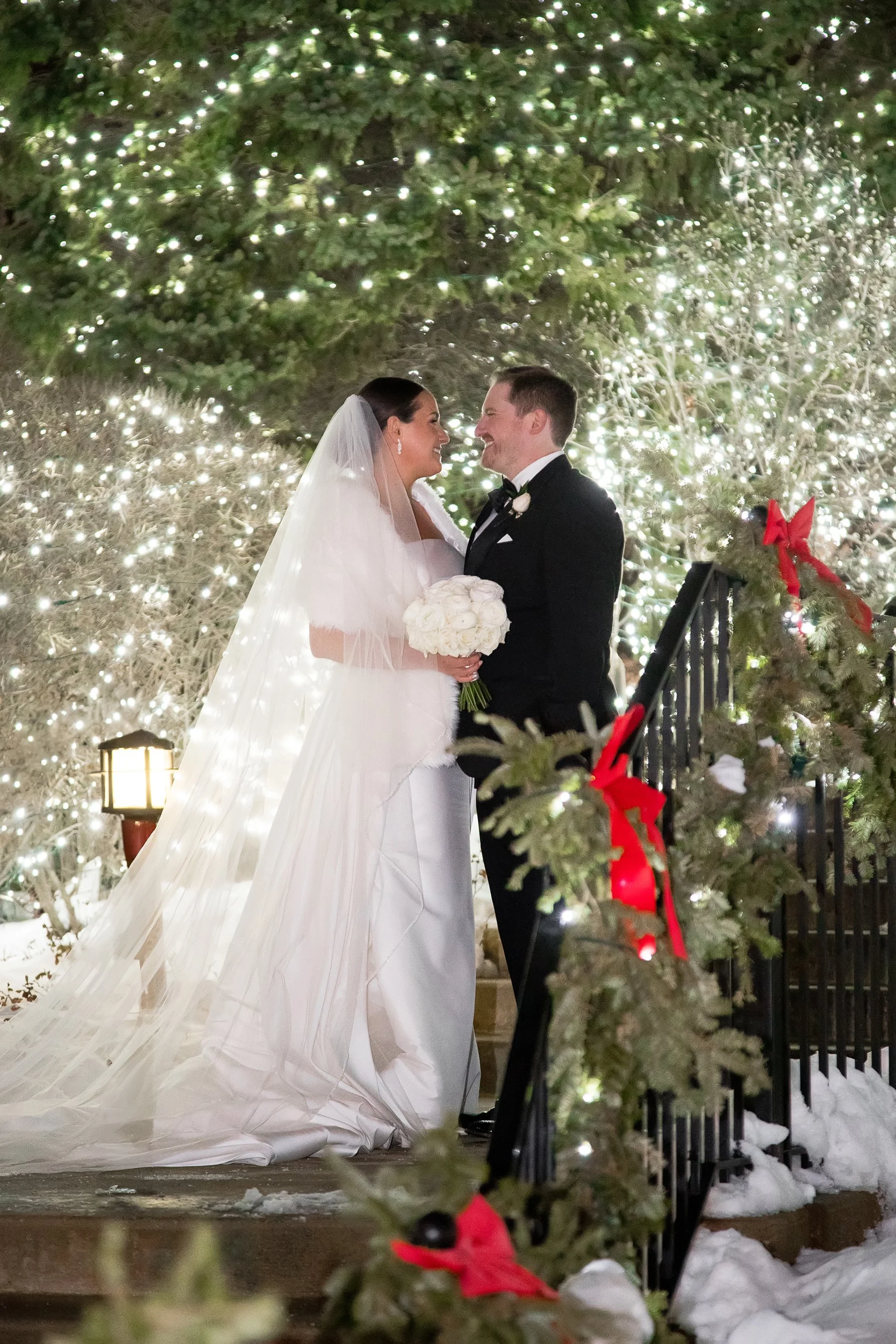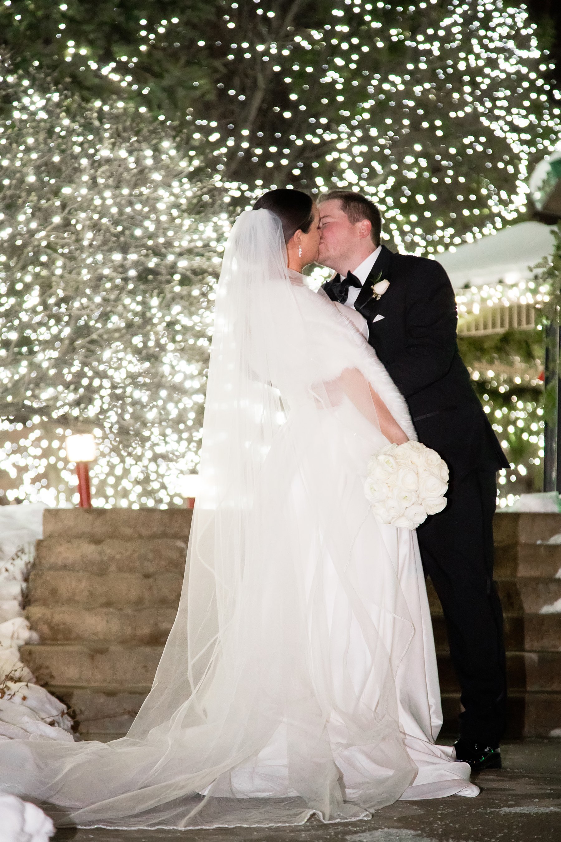 This was my first time visiting Our Lady of Perpetual Help and I was in awe of how beautiful this church and its surrounding grounds are. I wish we could photograph every ceremony here!! Following their traditional Catholic ceremony we snuck outside for a few quick photos with the wedding party and newlyweds before the sun went down. After taking family photos inside of the church we made our way back towards the Lincolnshire Marriott but stopped quickly at the fountain in Wheeling for some pretty and festive nighttime photos with all the pretty Christmas lights. It was so cold but so magical!!