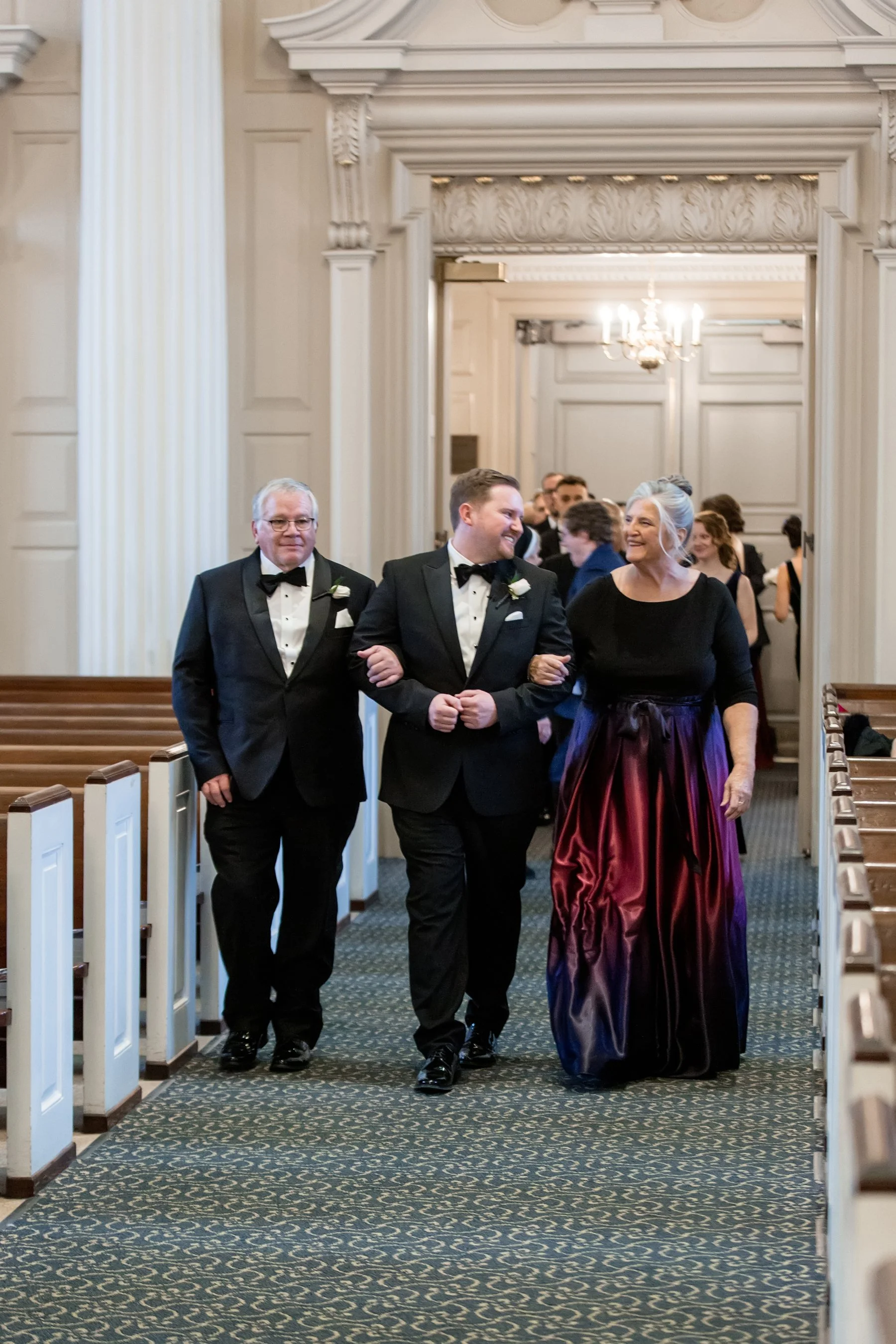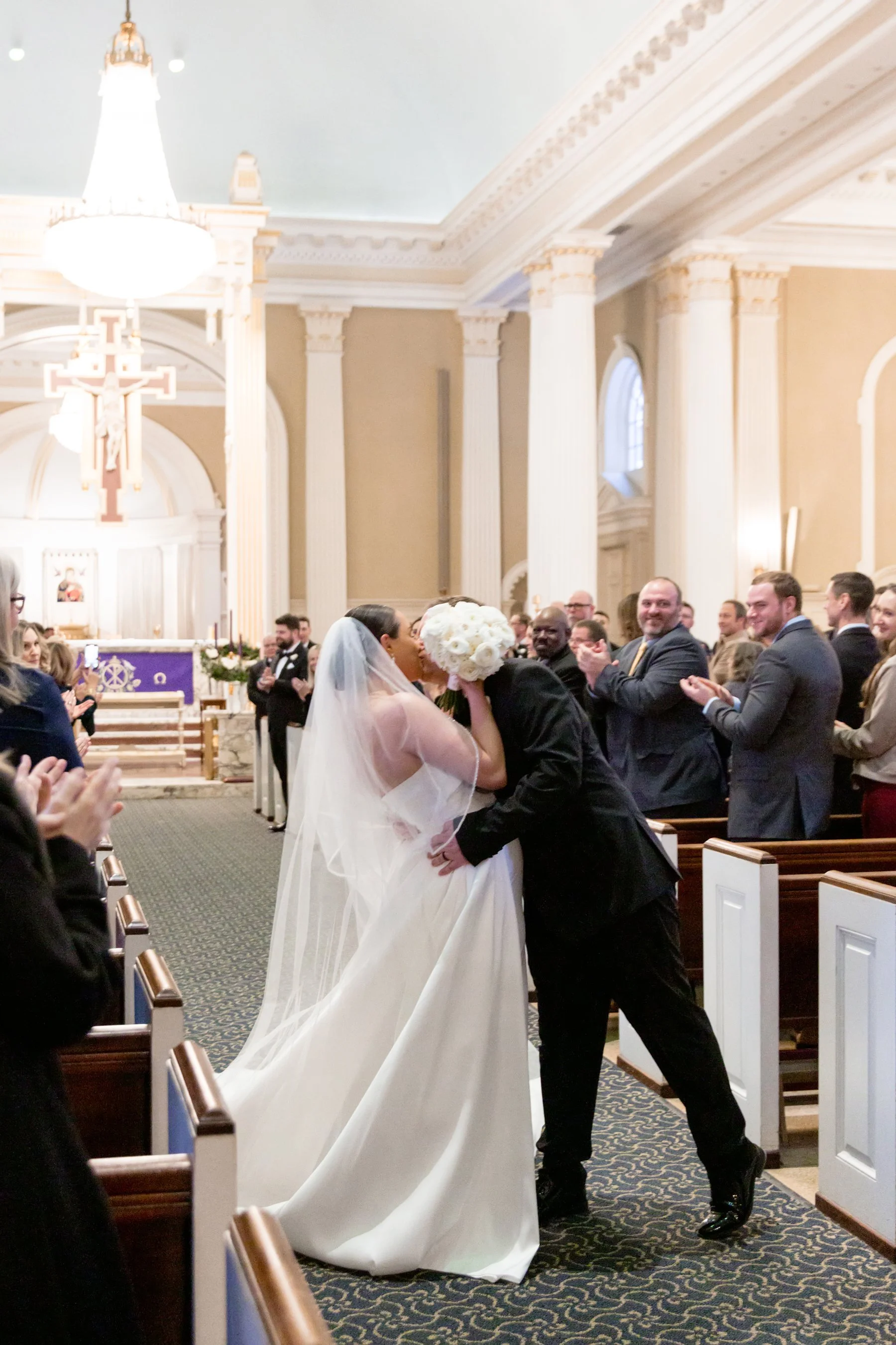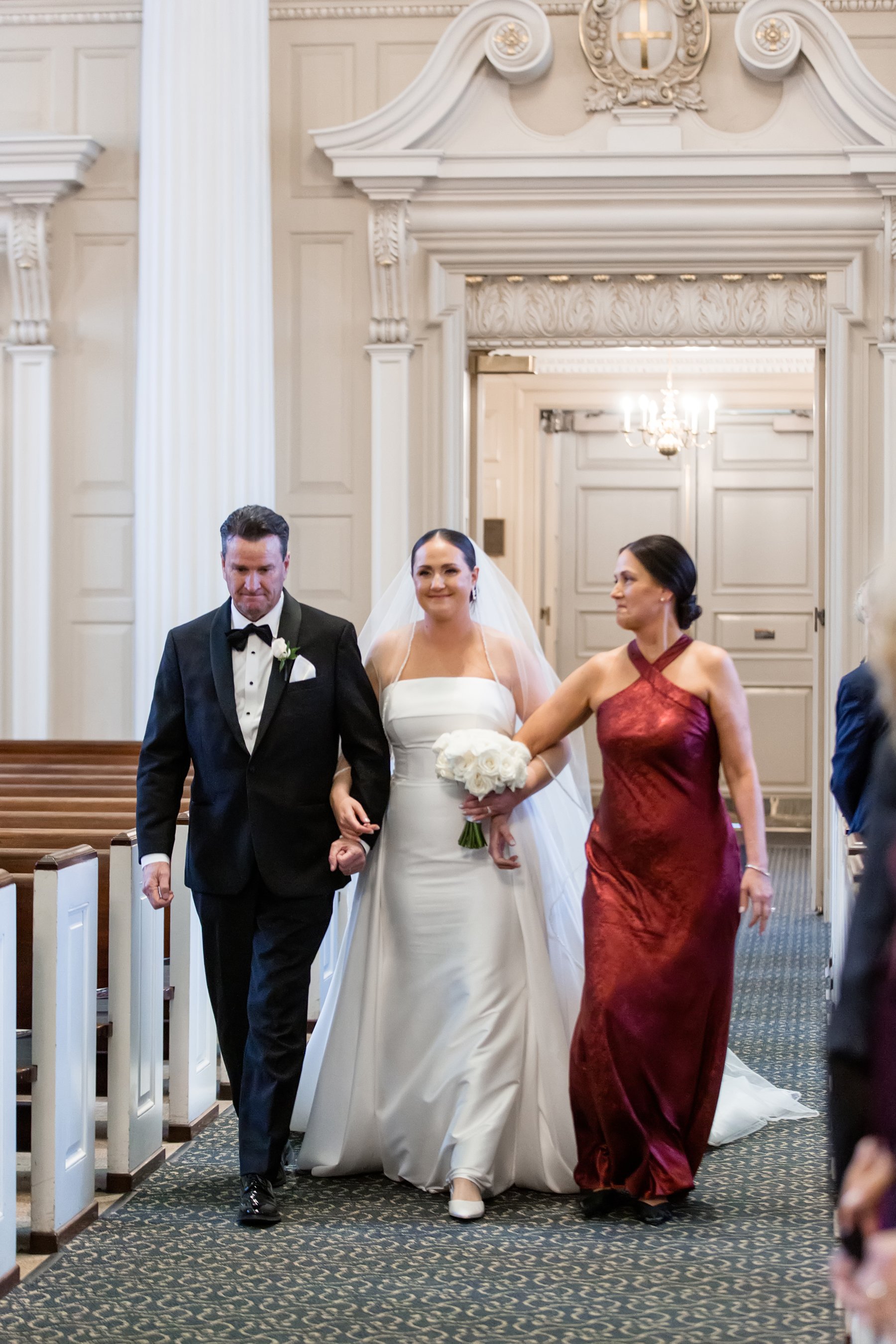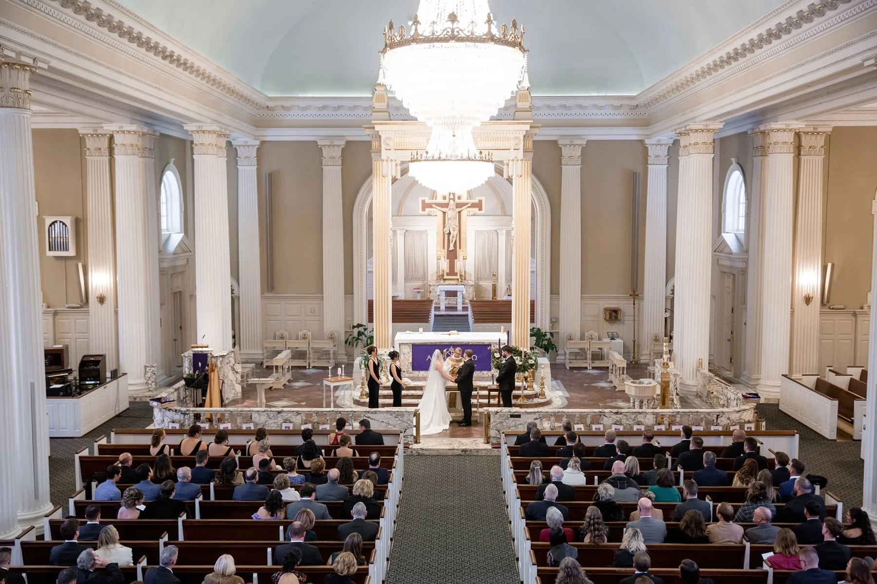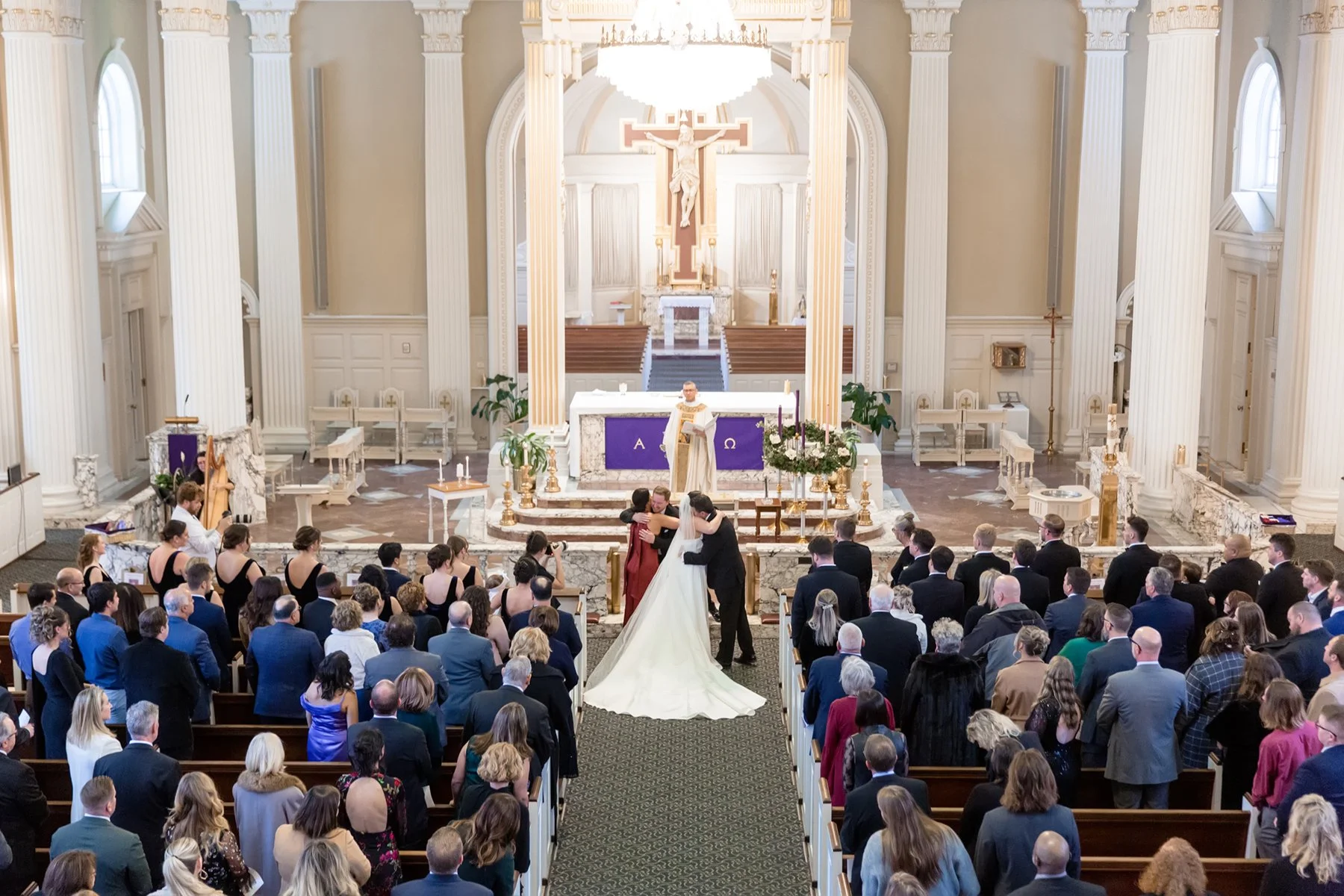 Conrad and Lindsay were excited to celebrate April and Paul’s wedding with them over Labor Day weekend at one of our favorite venues, Chevy Chase Country Club. After first meeting at the hotel for some sweet getting ready photos and a bridesmaids’ reveal with April and her girls we headed to the beautiful St. John Brebeuf Church to meet with Paul before their traditional Catholic ceremony. Paul sweetly shed SO many tears when April walked down the aisle, and then after the ceremony he kept looking at and touching the new ring on his finger. Paul’s wedding ring was especially unique as it has pieces of meteor embedded in it! As they walked back down the aisle after becoming husband and wife Paul did a happy little heel-click jump, it was just the most joyful moment!
