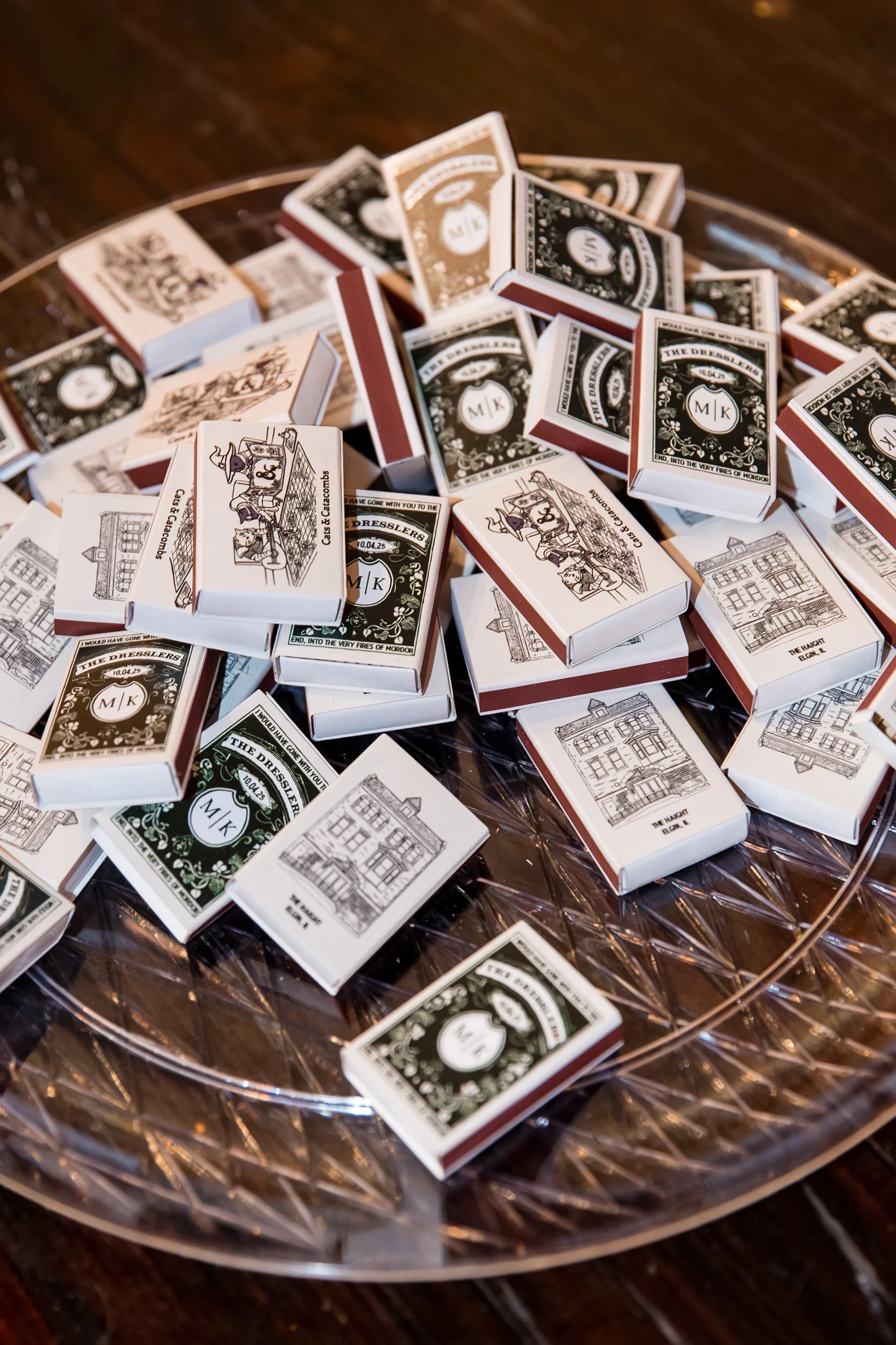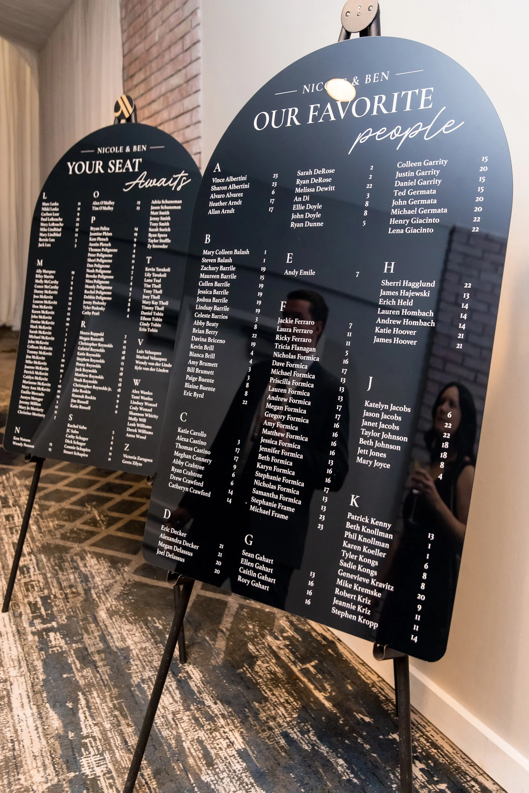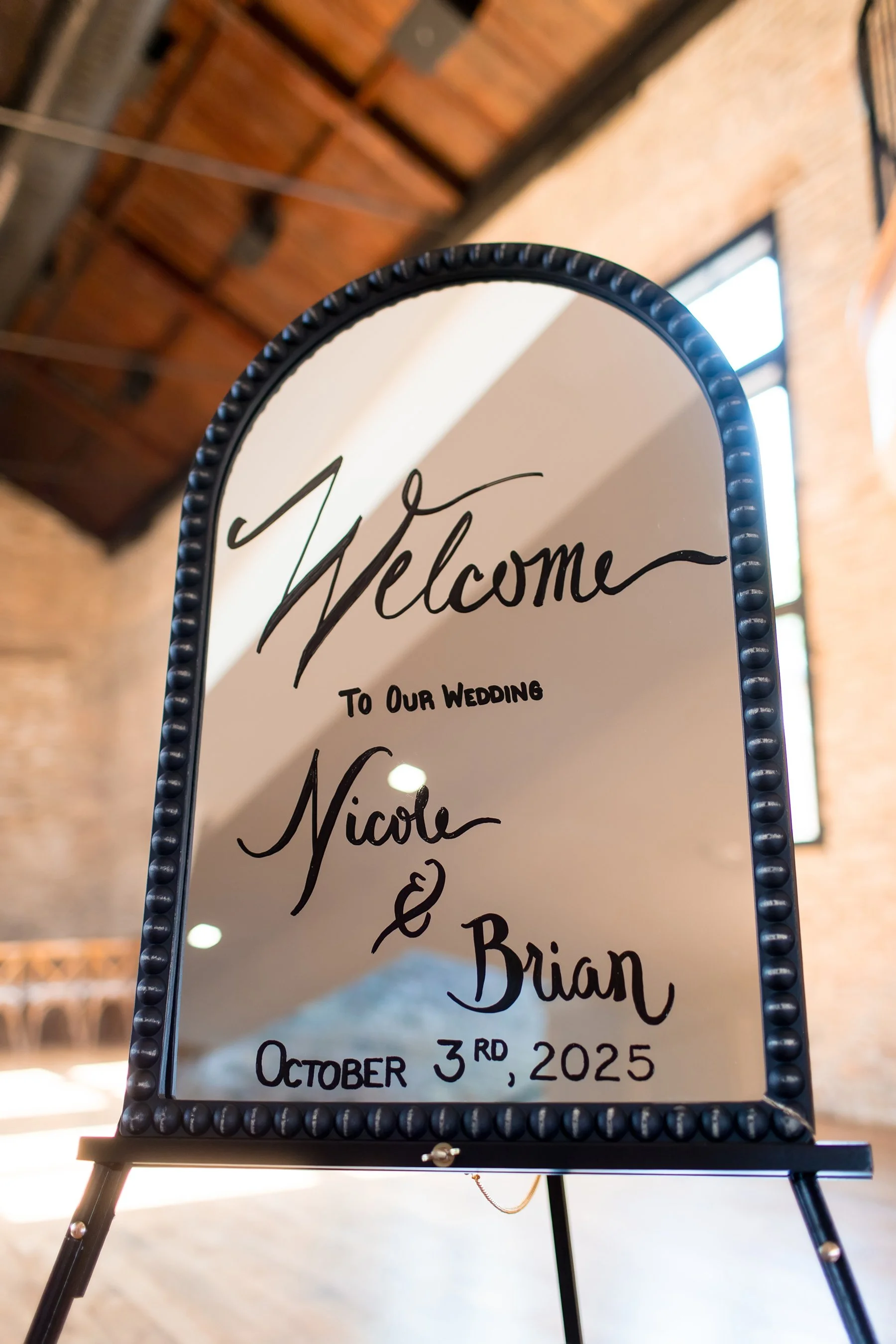 The reception space on the second floor looked incredible thanks to the amazing team at Salvage One and the gorgeous florals by the talented Flowers by Coll. Michelle had a custom stained glass motif created for the wedding that carried through the invitations and other wedding details. She even DIY’ed fun and funky cornhole boards for guests to play during the reception. This wedding was so cool that the newlyweds even had a custom concert poster produced for the occasion!