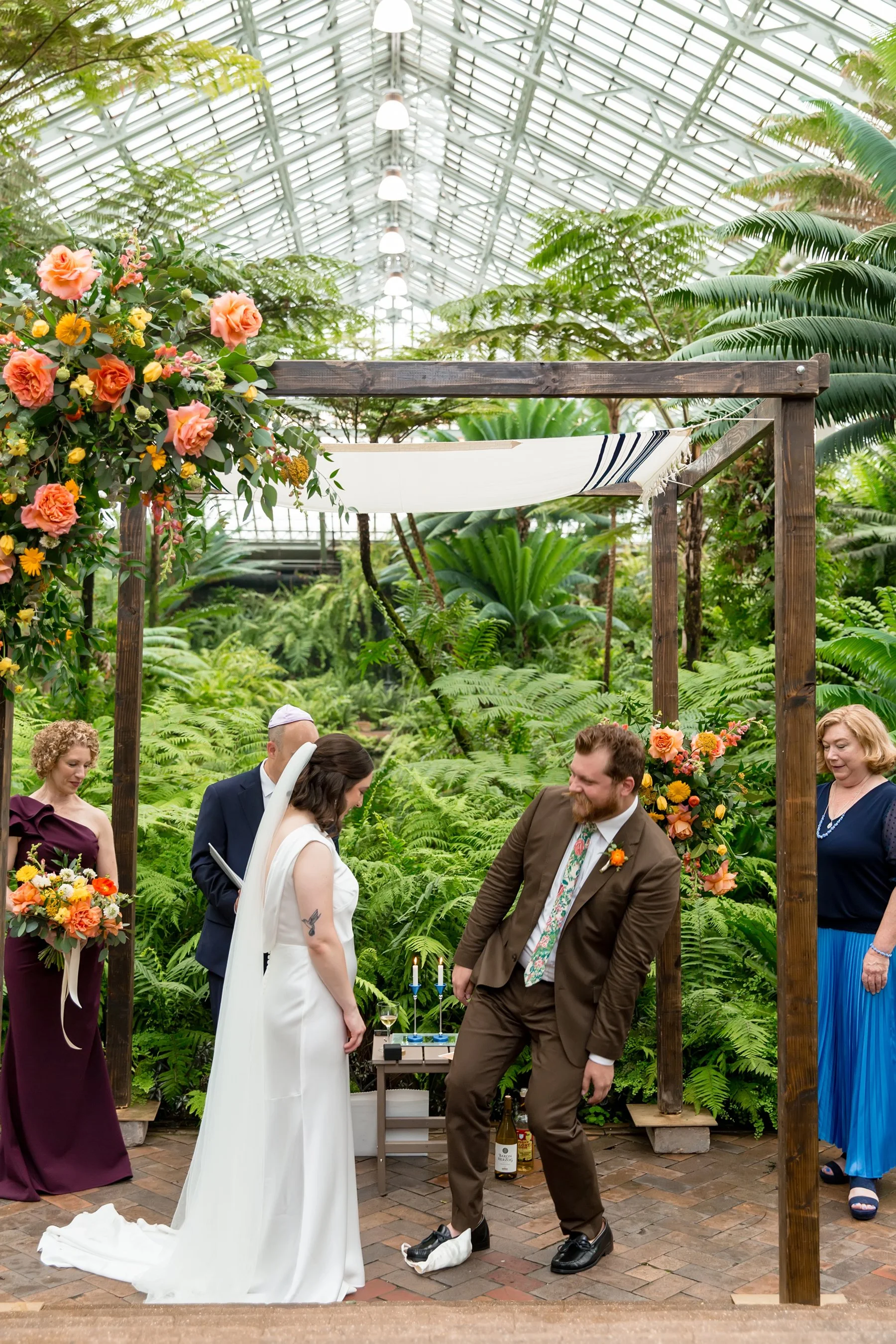 Ami and Conrad decided to take their time planning their wedding and over the next two years they chose to celebrate their marriage quietly with family and friends around the country. The last stop of their wedding celebration tour was Chicago, and they chose the gorgeous Garfield Park Conservatory for their wedding ceremony. Ami looked beautiful in her simple sheath from Anthropologie while Conrad chose a crisp brown suit and a floral tie that we jokingly said looked like upholstery from a vintage Grandma couch – they both looked amazing and very “them.” Their first look was so sweet, Conrad was so happy to see his beautiful bride and from that moment on they did not leave one another’s side.