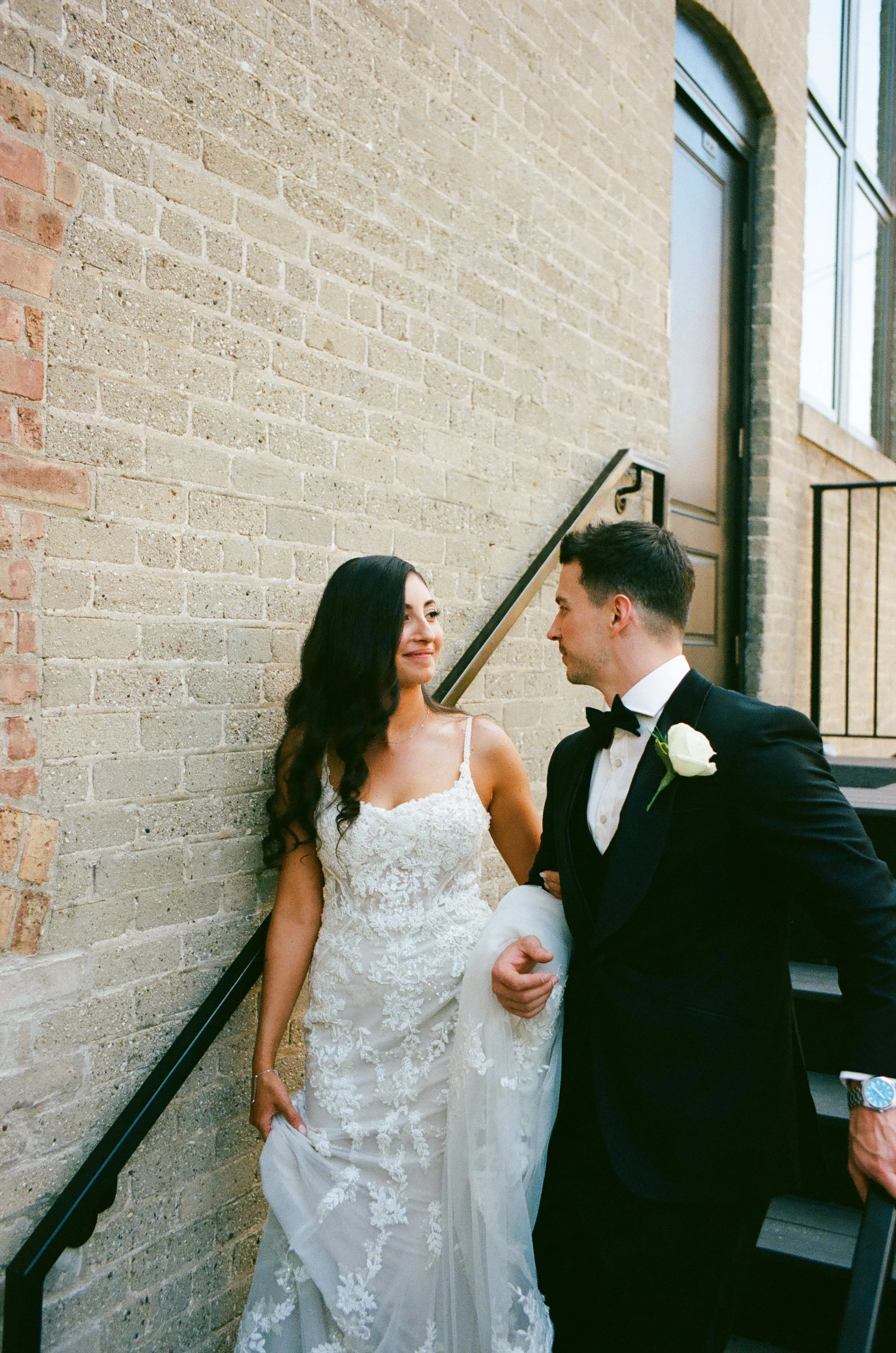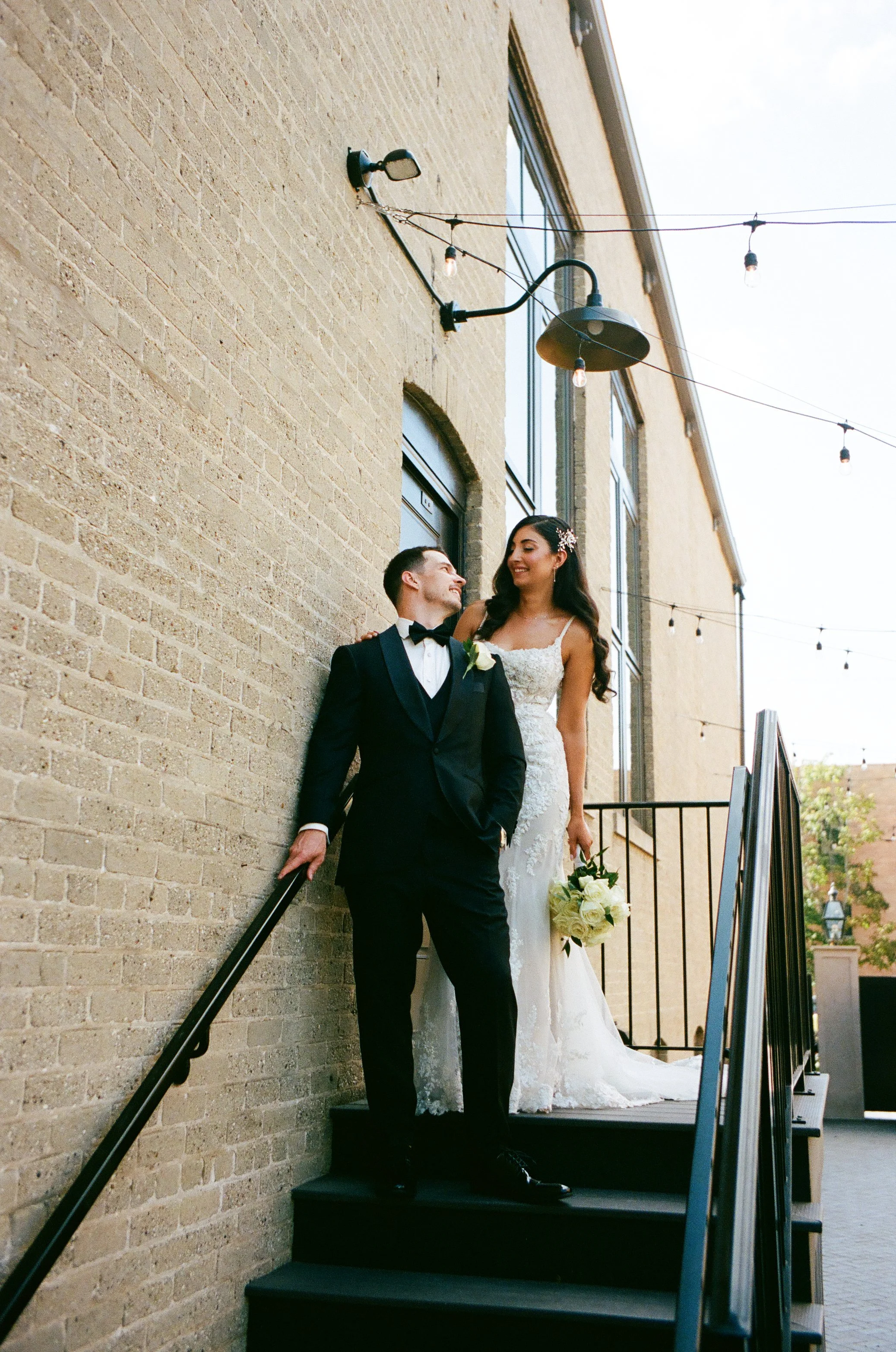 Once Emma and Brett were pronounced husband and wife everyone made their way upstairs to celebrate with a beautiful reception hosted by our friends at Makray. The dramatic twisting staircase was transformed with greenery by Twigs and Blooms, according to our resident green-thumb Lindsay these were some of the most stunning wedding florals we have ever seen. Emma and Brett were graced with a gorgeous sunset, we captured some pretty photos of them together outside before settling into a night of dancing to celebrate the newlyweds. It was the most beautiful day and we were so grateful to be a part of it!