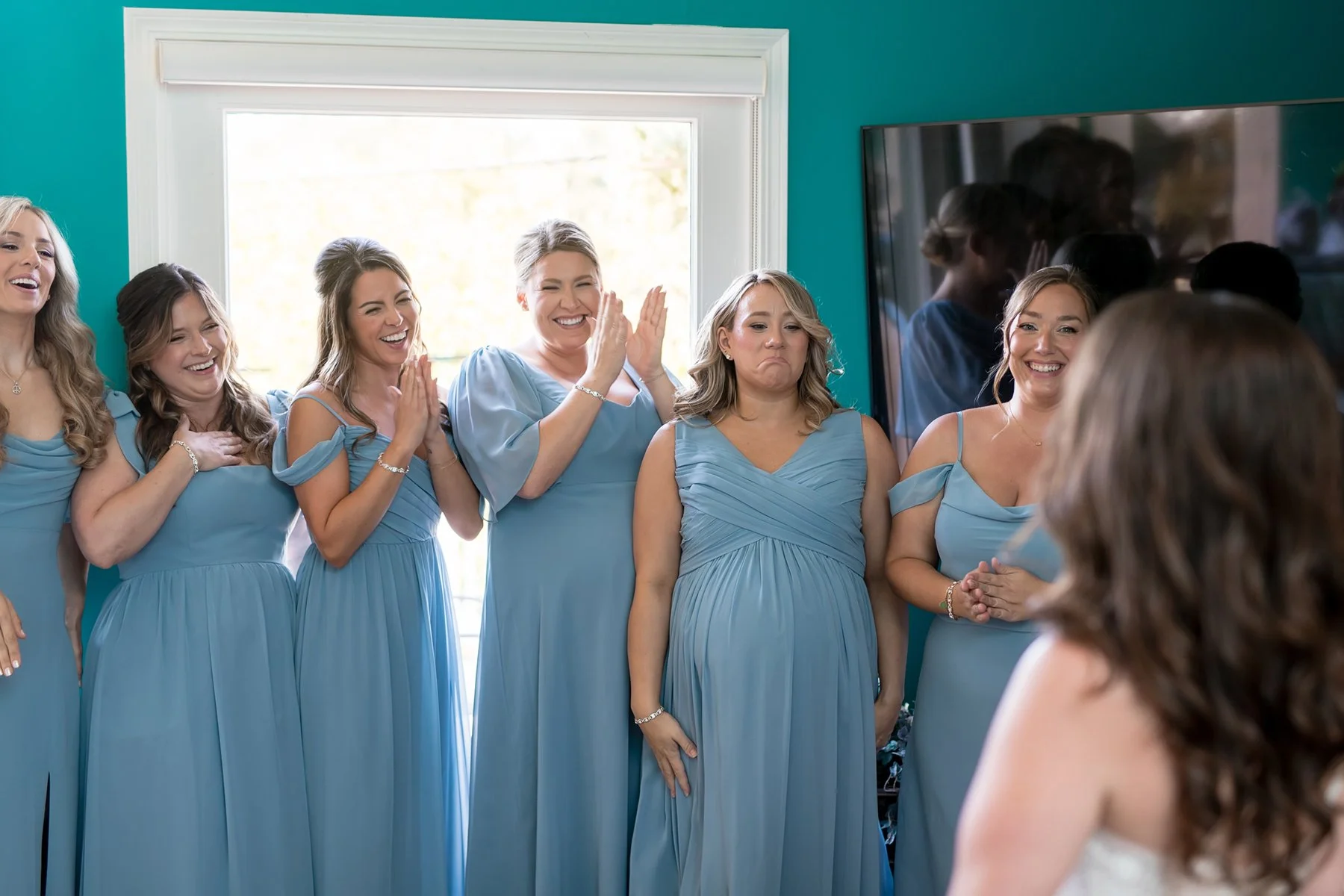 The weather was absolutely gorgeous for Emily and Kevin’s wedding at Chevy Chase, and when we arrived Emily and her girls were in great spirits as they got ready upstairs near the Devonshire Room. Emily had her favorite tunes blasting to get her hyped and was super chill during those getting-ready moments. After being pampered by the talented hair and makeup team from Bella Bridal Beauty Emily changed into her stunning floral gown from Bella Bleu Bridal and looked beyond amazing, this dress is 100% one of our favorites from this wedding season! The appliquéd floral details were just to die for, the handiwork was amazing and gave the dress to more unique texture!