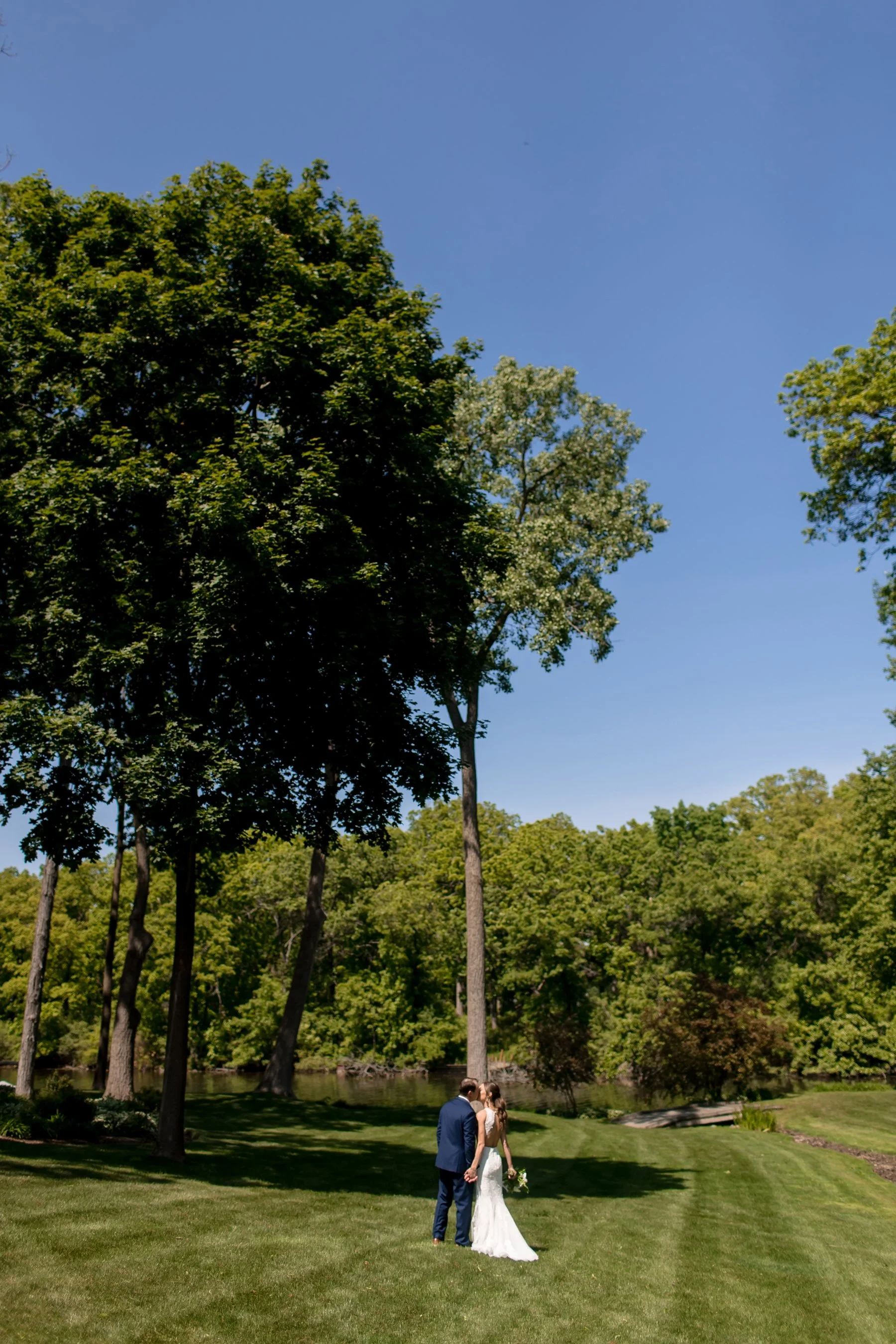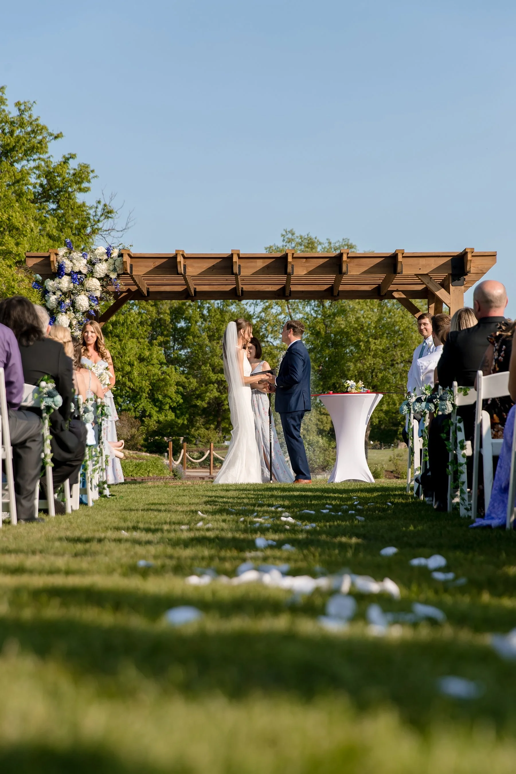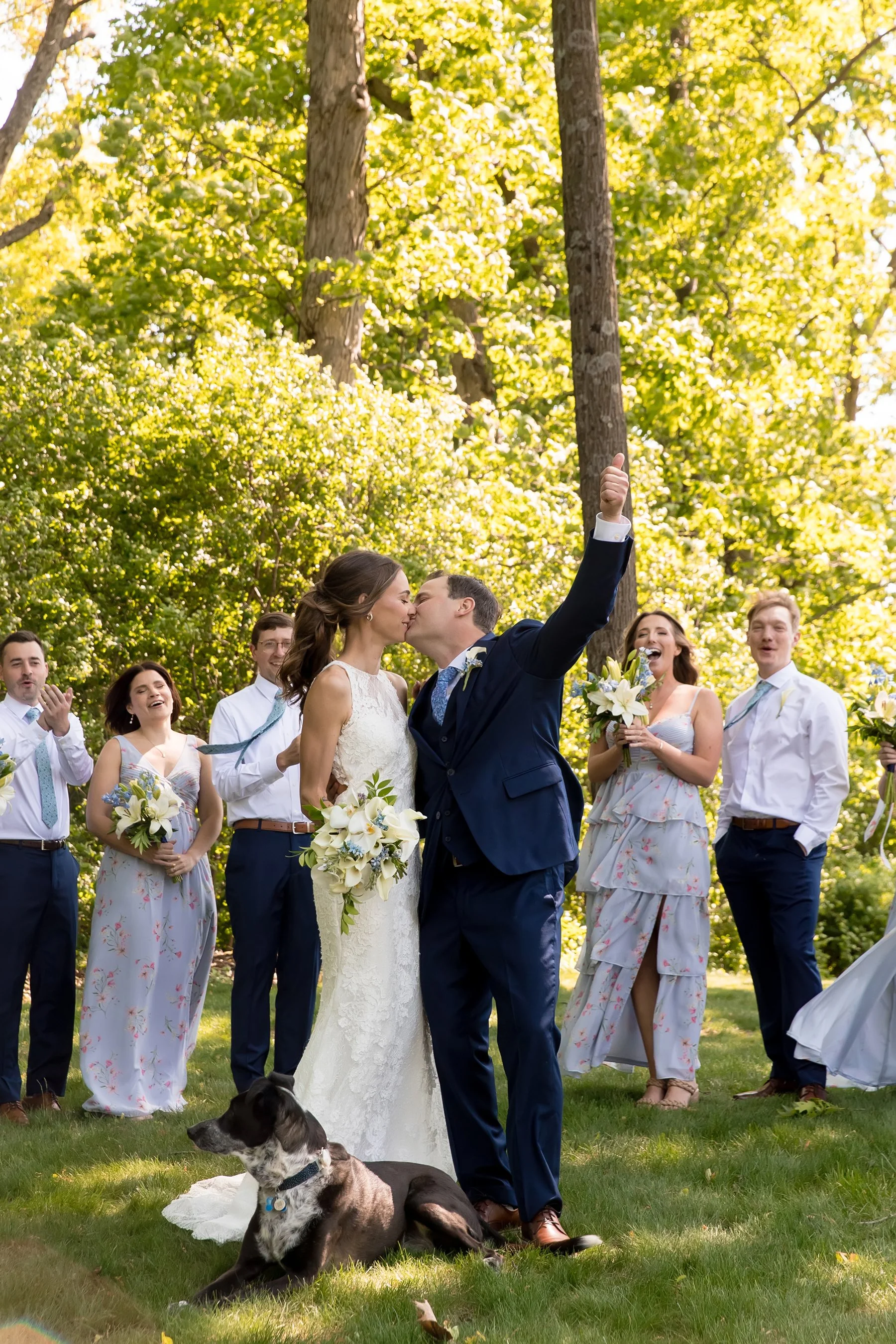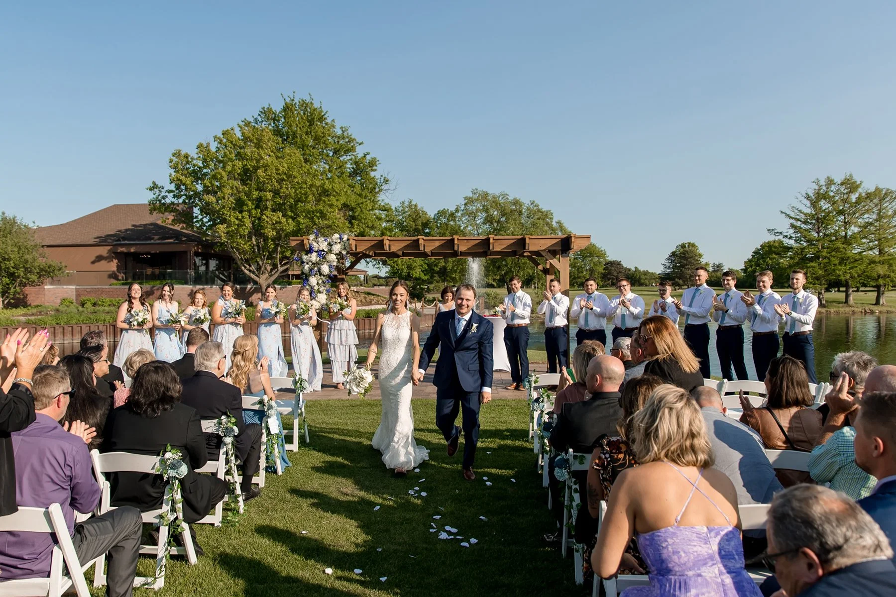 I first met Brittany and Jake over Zoom and loved their laid-back energy, I was so excited to get to know them both at their wedding at the beautiful Kemper Lakes! It was a beautiful Saturday when Conrad, Ryan and I arrived at Brittany’s grandparents’ house for getting ready photos. Their large and beautiful backyard was the perfect spot for Brittany and Jake’s emotional first look and private vows, such sweet moments set against the prettiest Midwestern backdrop! After taking some fun pictures with their wedding party and adorable dog Juno we made our way to Kemper Lakes. Everything looked so pretty at Kemper Lakes and we enjoyed their sweet ceremony overlooking the water (complete with a unity shot ski!)