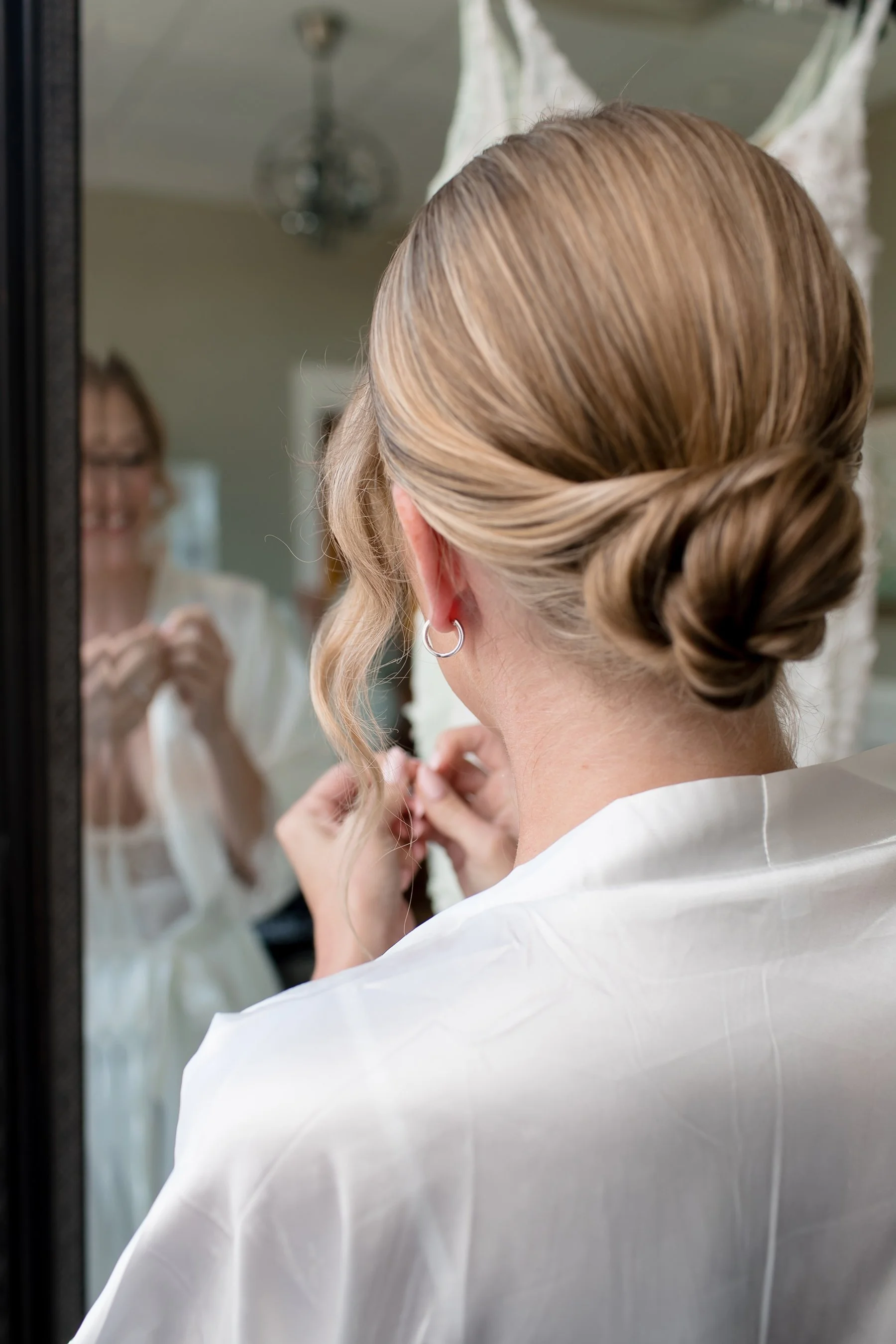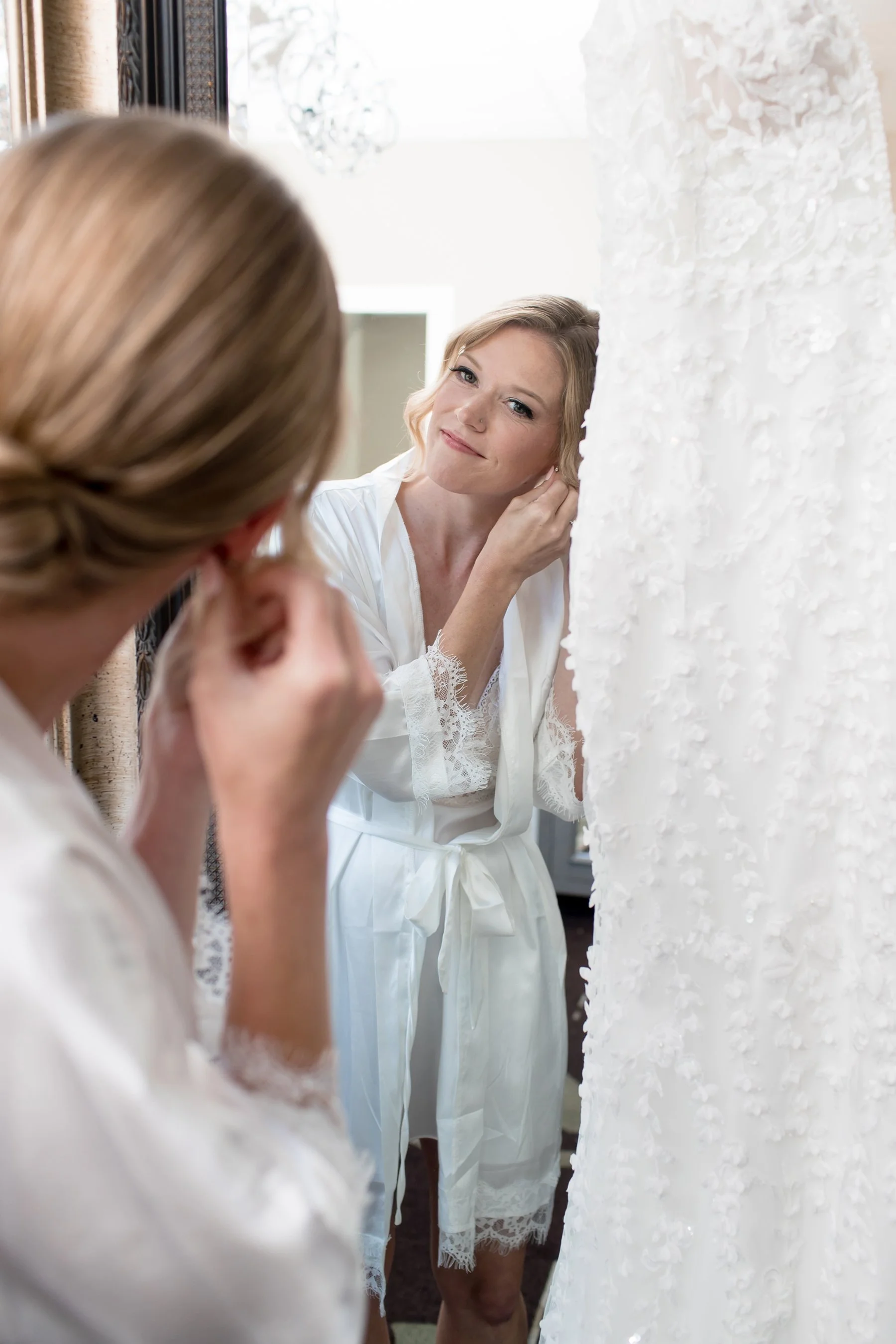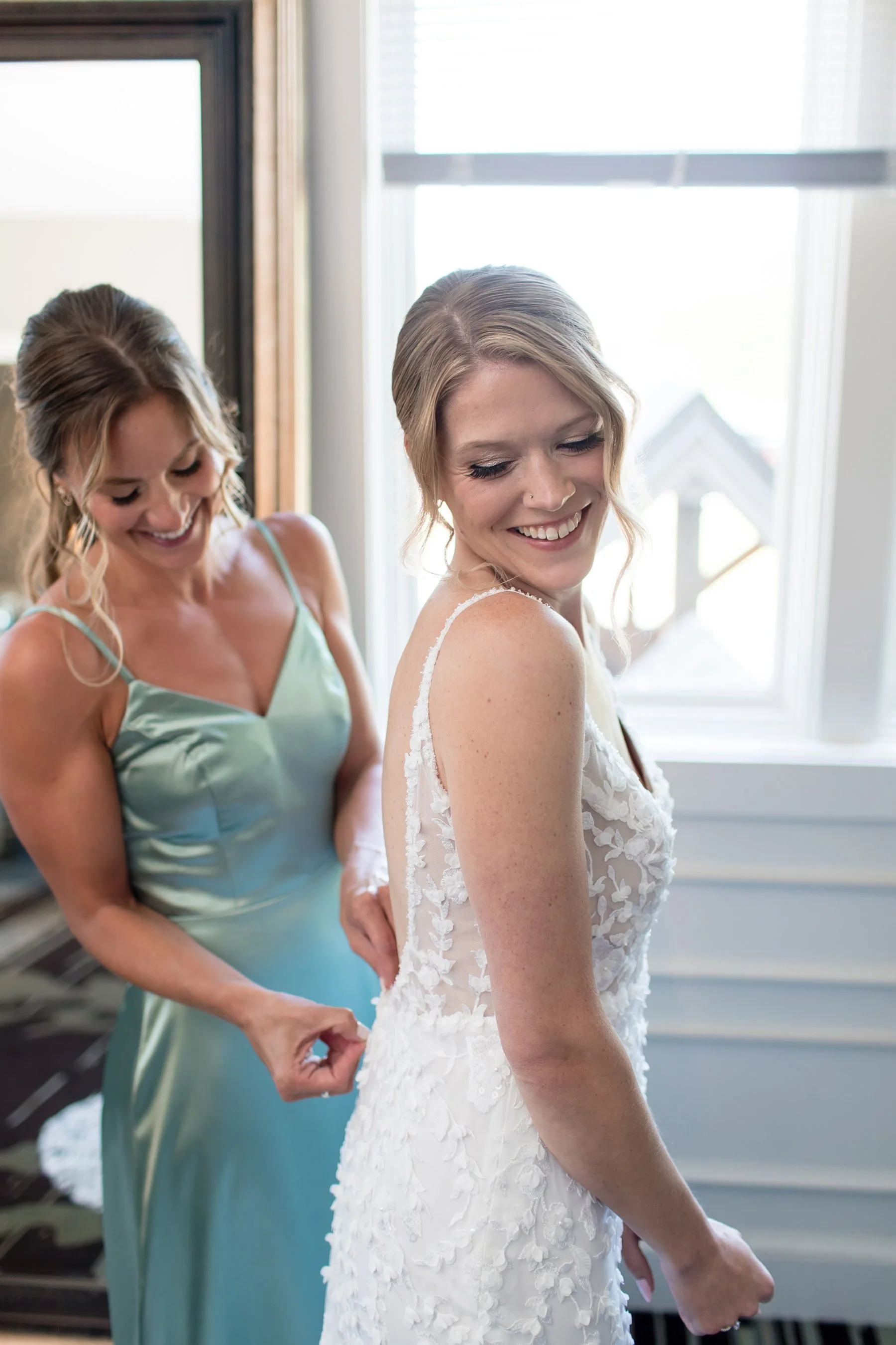 The weather was absolutely gorgeous for Emily and Kevin’s wedding at Chevy Chase, and when we arrived Emily and her girls were in great spirits as they got ready upstairs near the Devonshire Room. Emily had her favorite tunes blasting to get her hyped and was super chill during those getting-ready moments. After being pampered by the talented hair and makeup team from Bella Bridal Beauty Emily changed into her stunning floral gown from Bella Bleu Bridal and looked beyond amazing, this dress is 100% one of our favorites from this wedding season! The appliquéd floral details were just to die for, the handiwork was amazing and gave the dress to more unique texture!