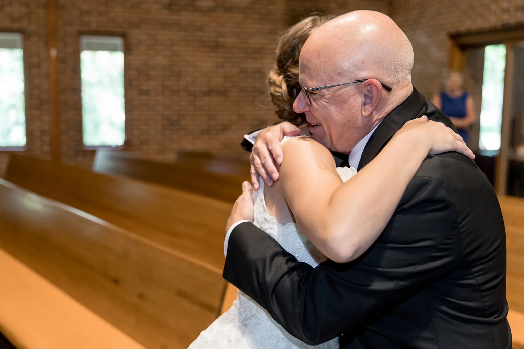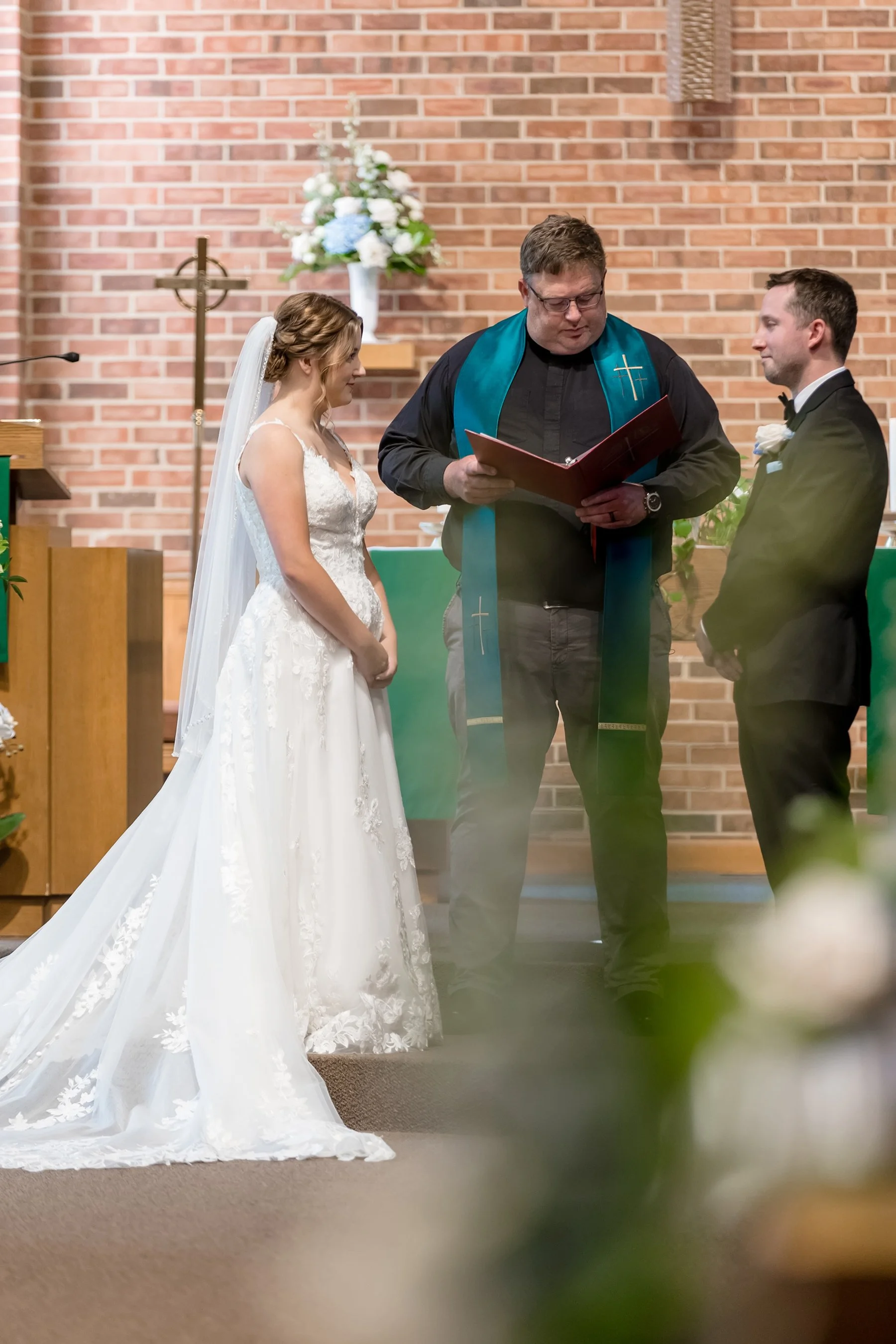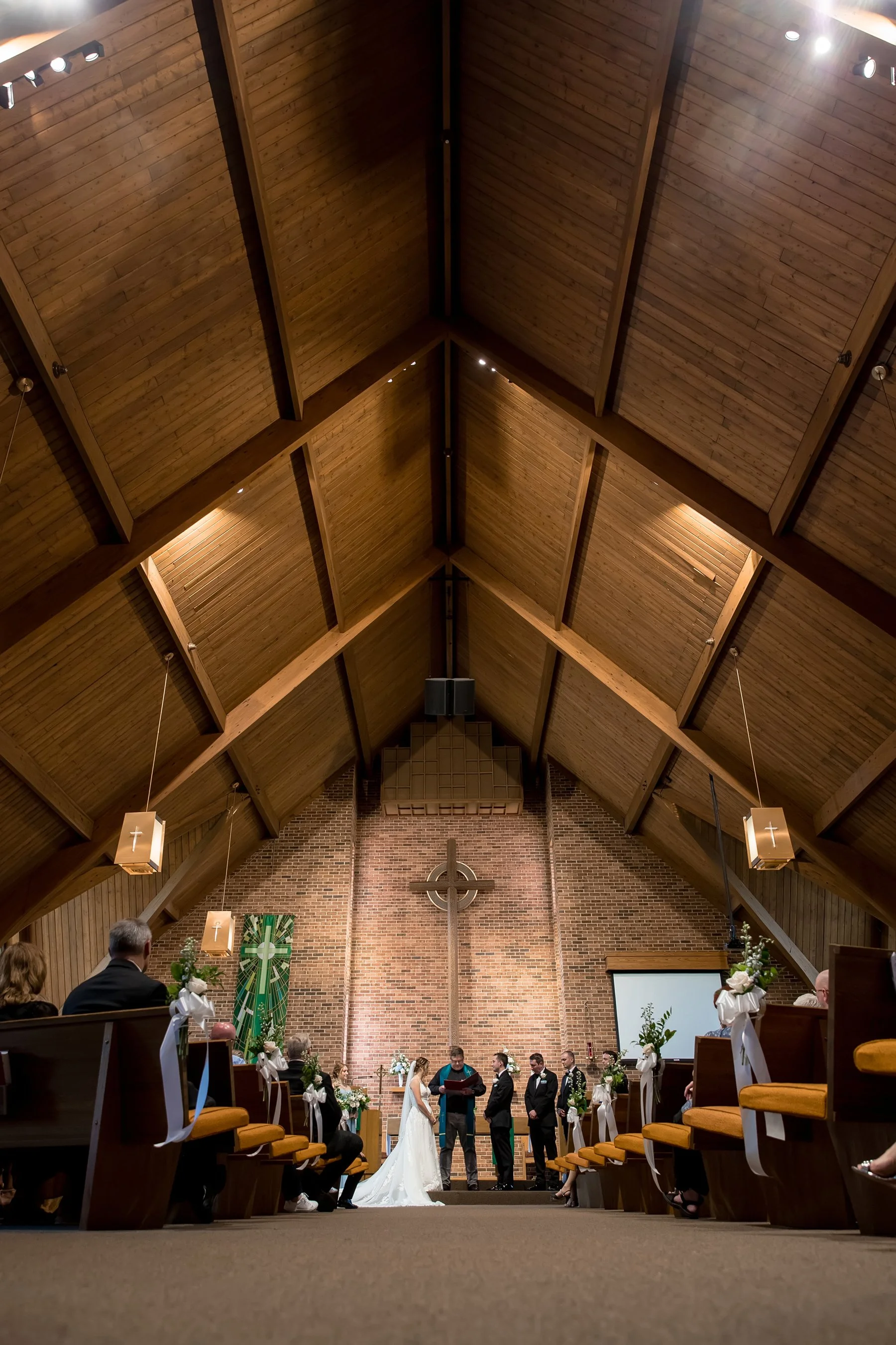 On their wedding day Conrad and I met up with Meghan and her Mom and bridesmaids at Grace Lutheran Church in Libertyville. Everyone looked amazing thanks to the talented team from Jaide & Co., and we fell in love with Meghan’s gorgeous lace Allure wedding gown from Kathryn’s Bridal. After getting dressed, Meghan did a sweet reveal and first look with her bridesmaids and Dad in the sanctuary before hiding away as Chris and his groomsmen arrived.