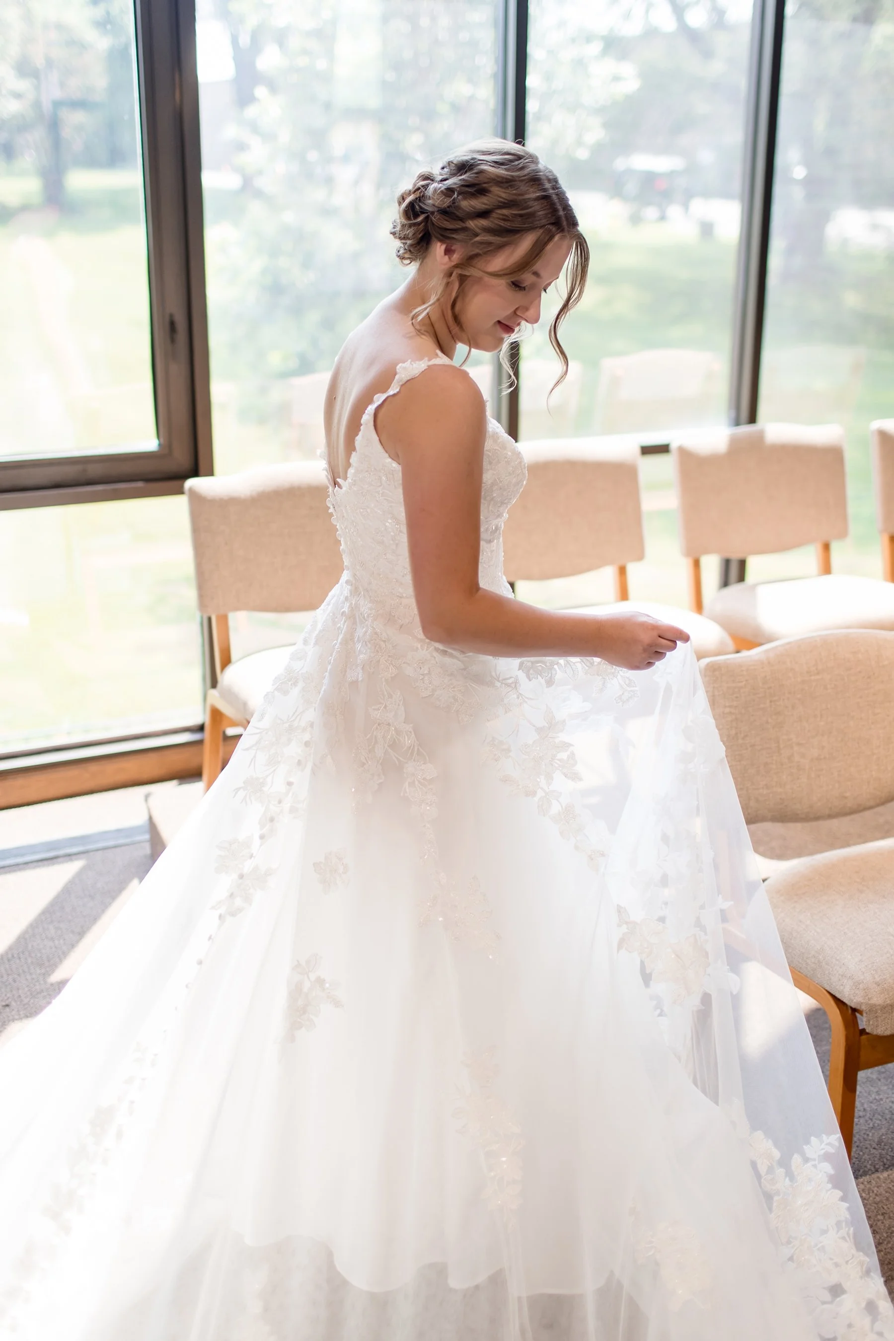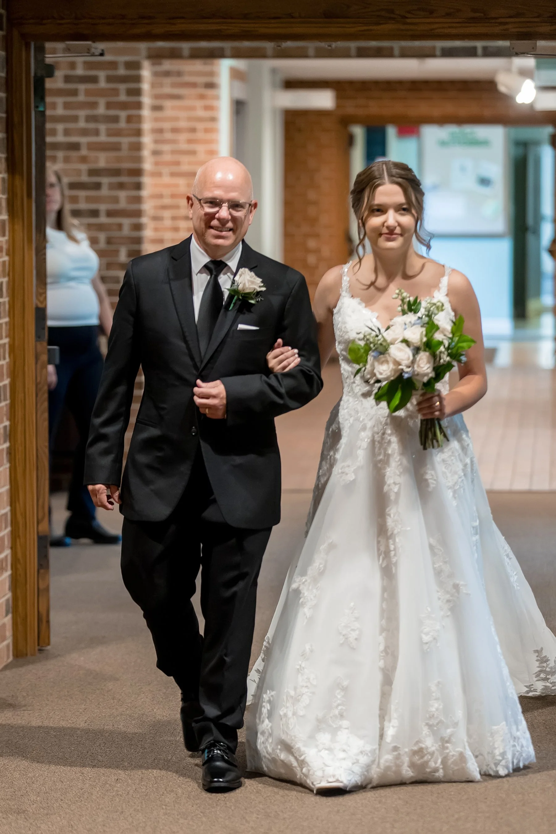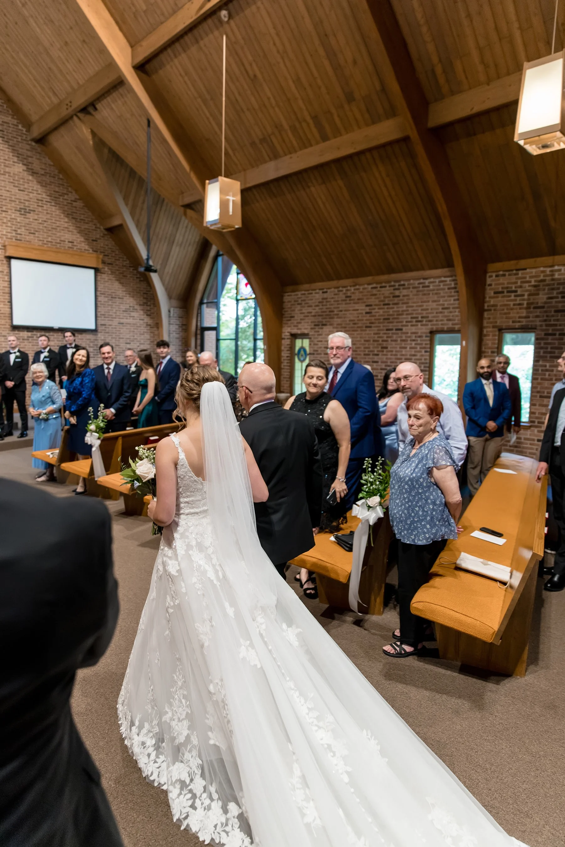 On their wedding day Conrad and I met up with Meghan and her Mom and bridesmaids at Grace Lutheran Church in Libertyville. Everyone looked amazing thanks to the talented team from Jaide & Co., and we fell in love with Meghan’s gorgeous lace Allure wedding gown from Kathryn’s Bridal. After getting dressed, Meghan did a sweet reveal and first look with her bridesmaids and Dad in the sanctuary before hiding away as Chris and his groomsmen arrived.