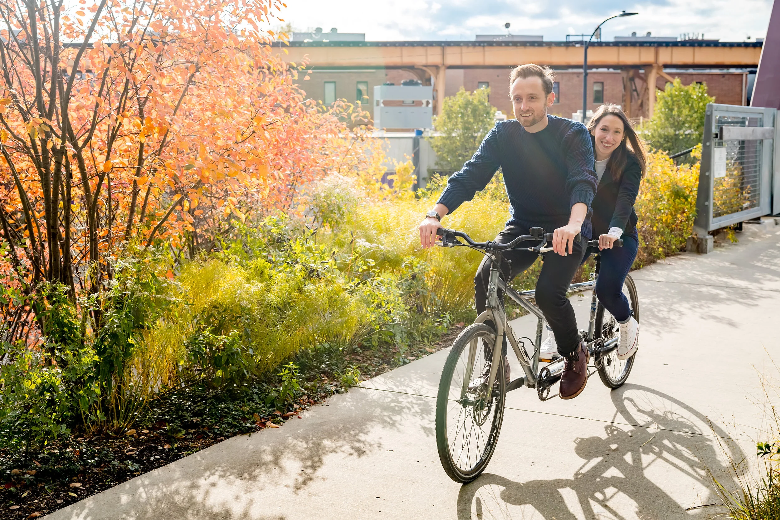 The last weekend of October we scheduled an engagement session with Susan and Zach. It was THE most fun day, a chance for us to get to know each other better while exploring their favorite spots in the city. Our amazing planner Jenny of JPB Designs arranged for us to use a tandem bike from the cool guys at Bobby’s Bike Hike for a day of adventure and romance. Conrad and I met Susan and Zach at one of their favorite coffee shops, Ipsento 606. It was a beautiful fall day and these two had so much fun learning to ride the tandem bike together, an adorable visual for any relationship.