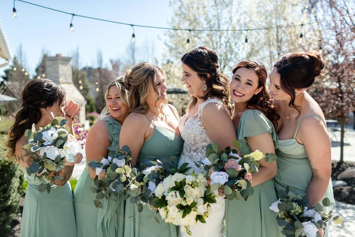 Katie is a self-processed DIY bride – she worked for weeks leading up to her wedding to create the gorgeous bouquets, boutonnieres and centerpieces herself. When the day arrived for Katie and Tony’s Farmhouse Plainfield wedding the weather was absolutely PERFECT, unexpectedly warm and sunny for an April wedding! Katie and her bridesmaids were in great spirits as they got ready together, while Tony MAY have been experiencing a few nerves before seeing his bride. Once Katie and Tony did their First Look the nerves melted away into happiness and love, these two were truly made for one another. They shared private vows (one of our FAVORITE “new” traditions!) together on the farmhouse patio before joining with their awesome wedding party for pictures. We had so much fun with this crew on the beautiful property at The Farmhouse!