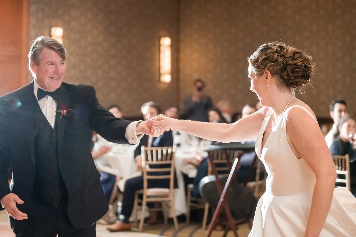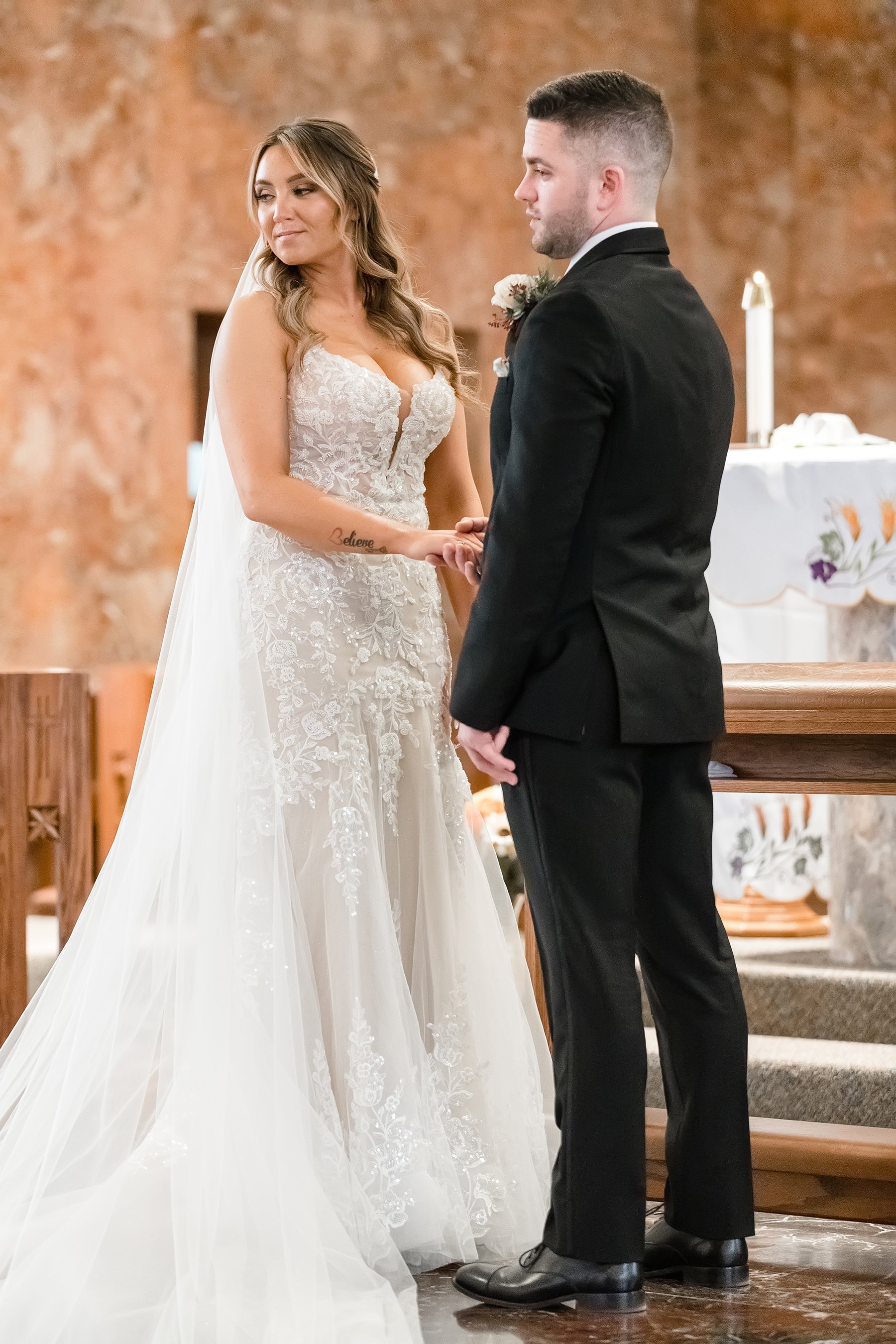When Nicolete and Terry’s cold November wedding day came around, Conrad and Lindsay and I made our way back to the McMahon’s home for getting ready photos. Nicolete looked gorgeous and was wearing THE cutest satin pajama short set with their custom wedding date. After she got dressed in her beautiful Essense of Australia gown we made our way to St. Christina’s for the ceremony. Nicolete had the sweetest “first look” with her Dad down the aisle at St. Christina’s, they both cried as she privately shared a letter of gratitude she had written for her Dad.