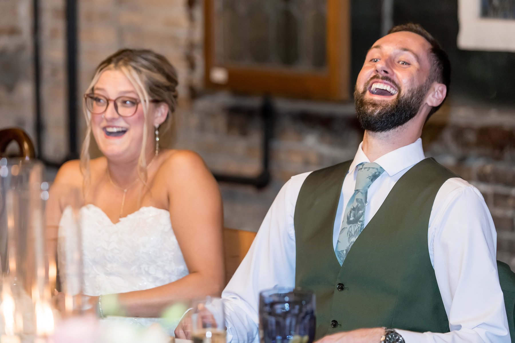 Once Michelle and the girls were ready we made our way to The Grove for her first look with Nolan. They shared a sweet and emotional private moment together there before riding together with their awesome bridal party downtown to Salvage One. After taking some fun wedding party photos on the second floor we made our way downstairs for their ceremony. Michelle’s brother in law served as their officiant during the beautiful ceremony; when Michelle and Nolan shared their vows with one another there wasn’t a dry eye in the house. They shared their first kiss as husband and wife and the celebration really began!